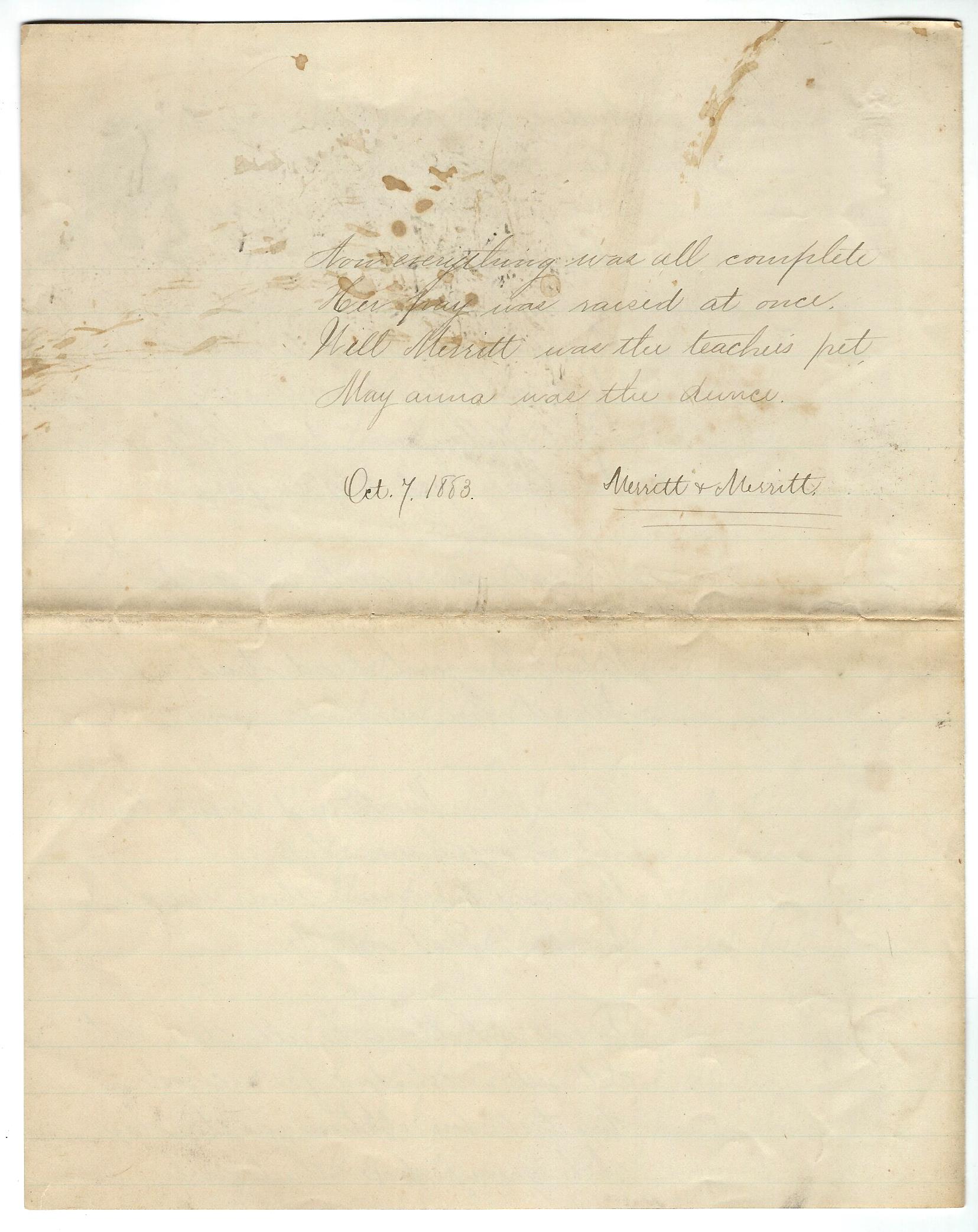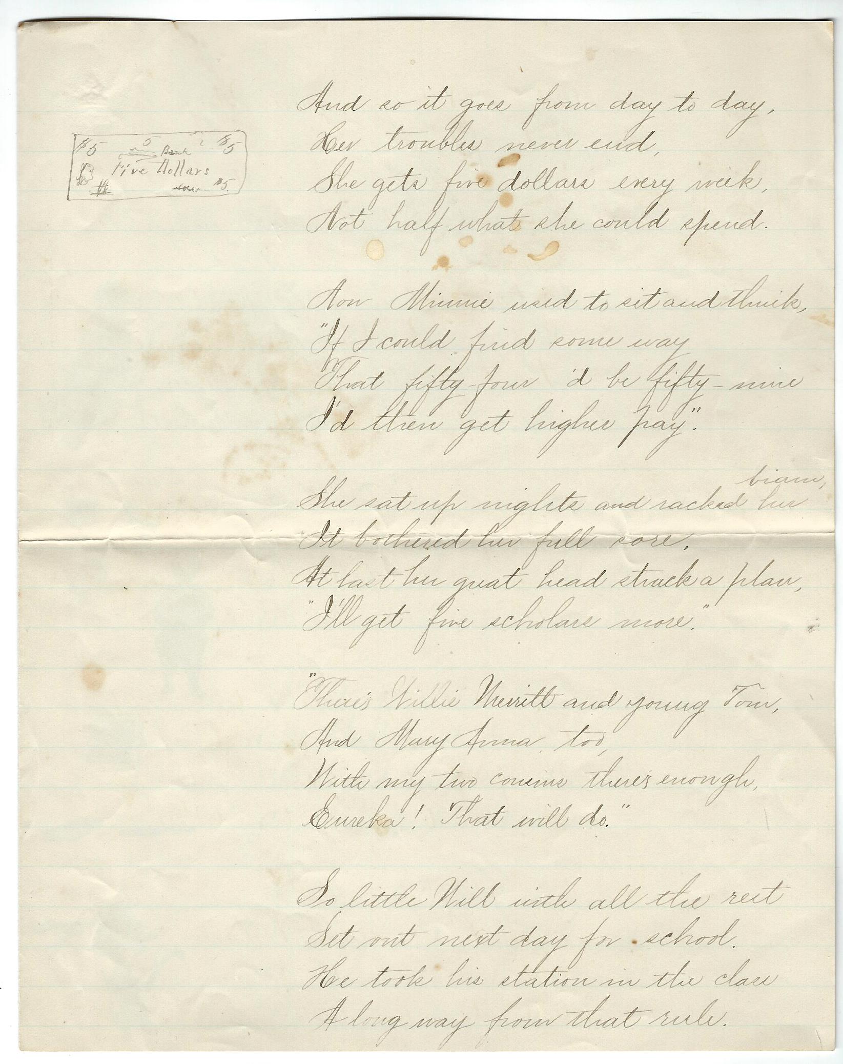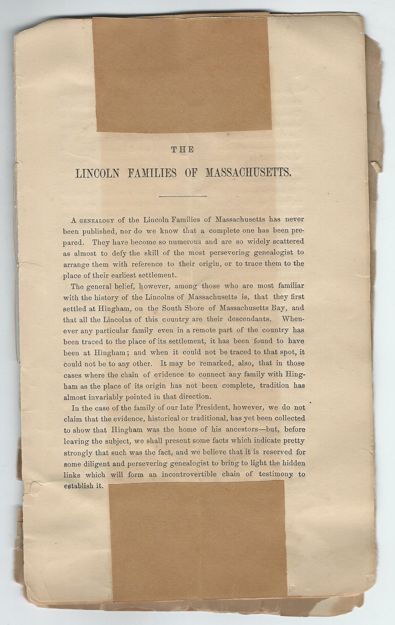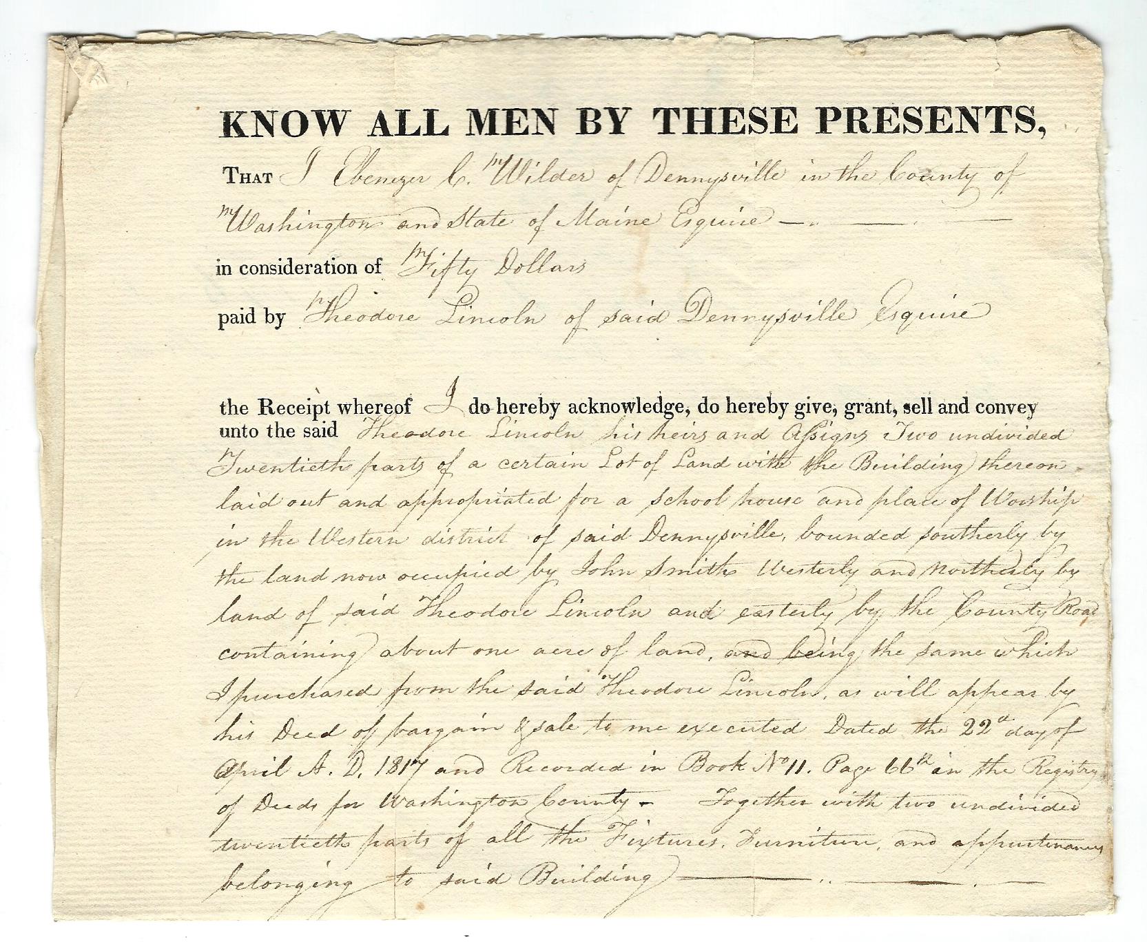 Rare history of the Lincoln Families, 1865, by Solomon Lincoln, paper cover, taped and folded, 10 pages, 10″ h x 6″ w; Deed for a School House in Dennysville, Maine, signed by Ebenezer Wilder, paid by Theodore Lincoln; Pen and ink, illustrated humorous poem on lined paper, “How Maria Adams got her pay Raised.”, dated Oct 7, 1883, (Maria lived in Dorchester).