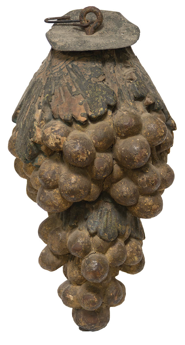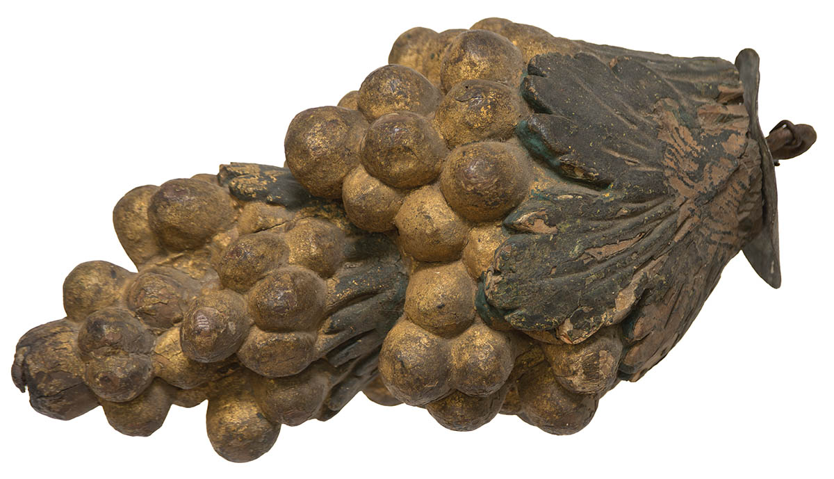 Early carved “Bunch of Grapes”, wrought iron loop hanger with tin cover, carved leaves in original green and grapes in gold/yellow, great patina, minor in-use wear, 12 1/2″ h, 6″ w.