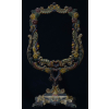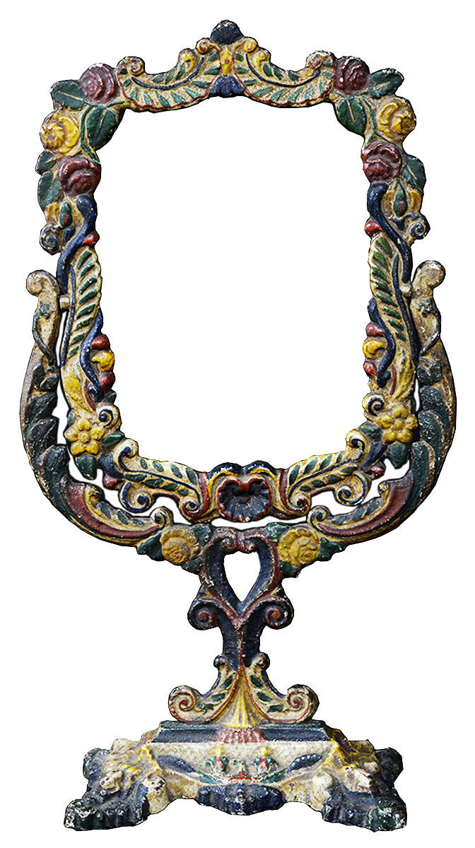 Cast iron mirror frame on stand, polychrome decoration with leaves and shells, 17″ h, 9 1/2″ w, interior 7″ x 5 3/4″.