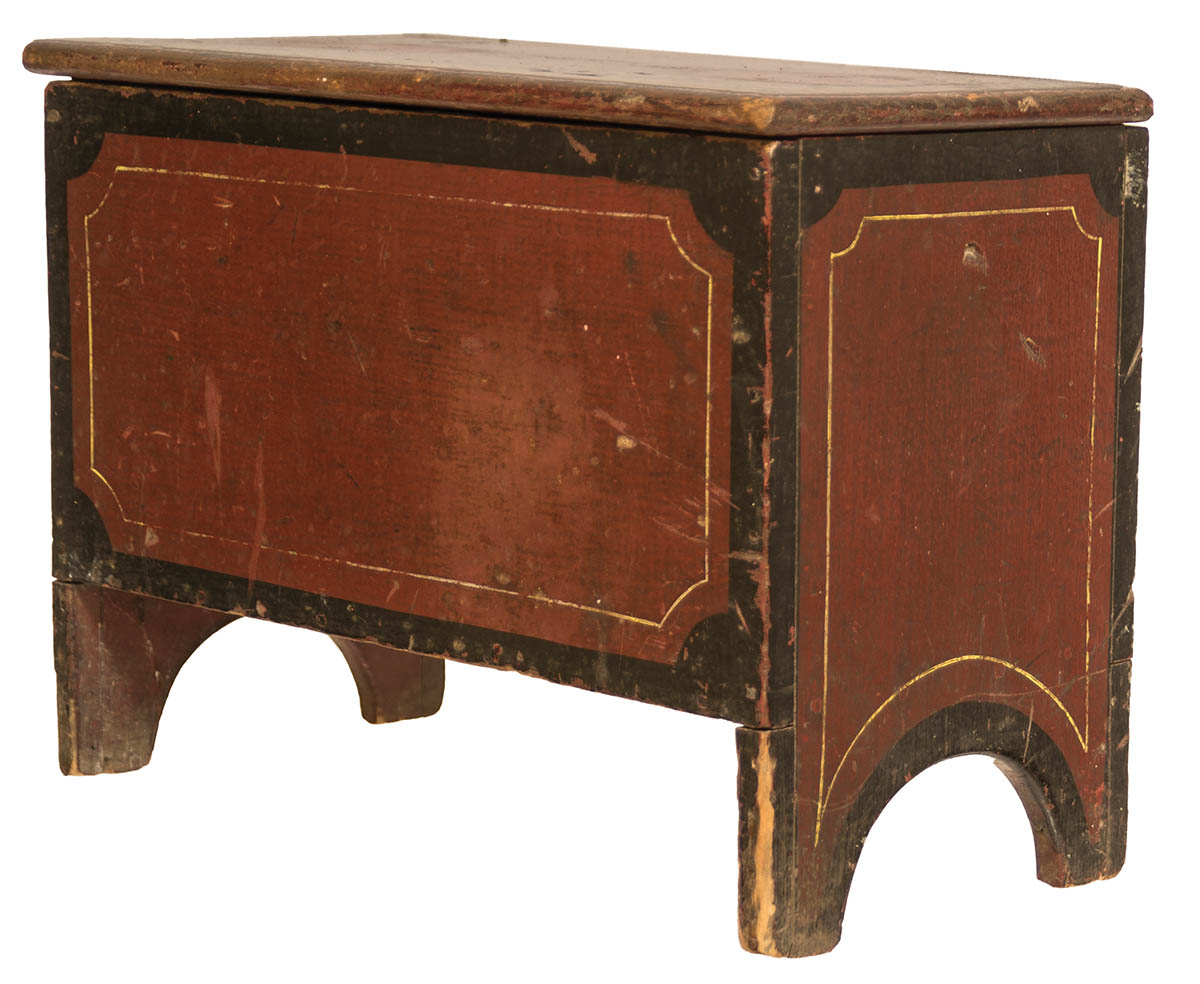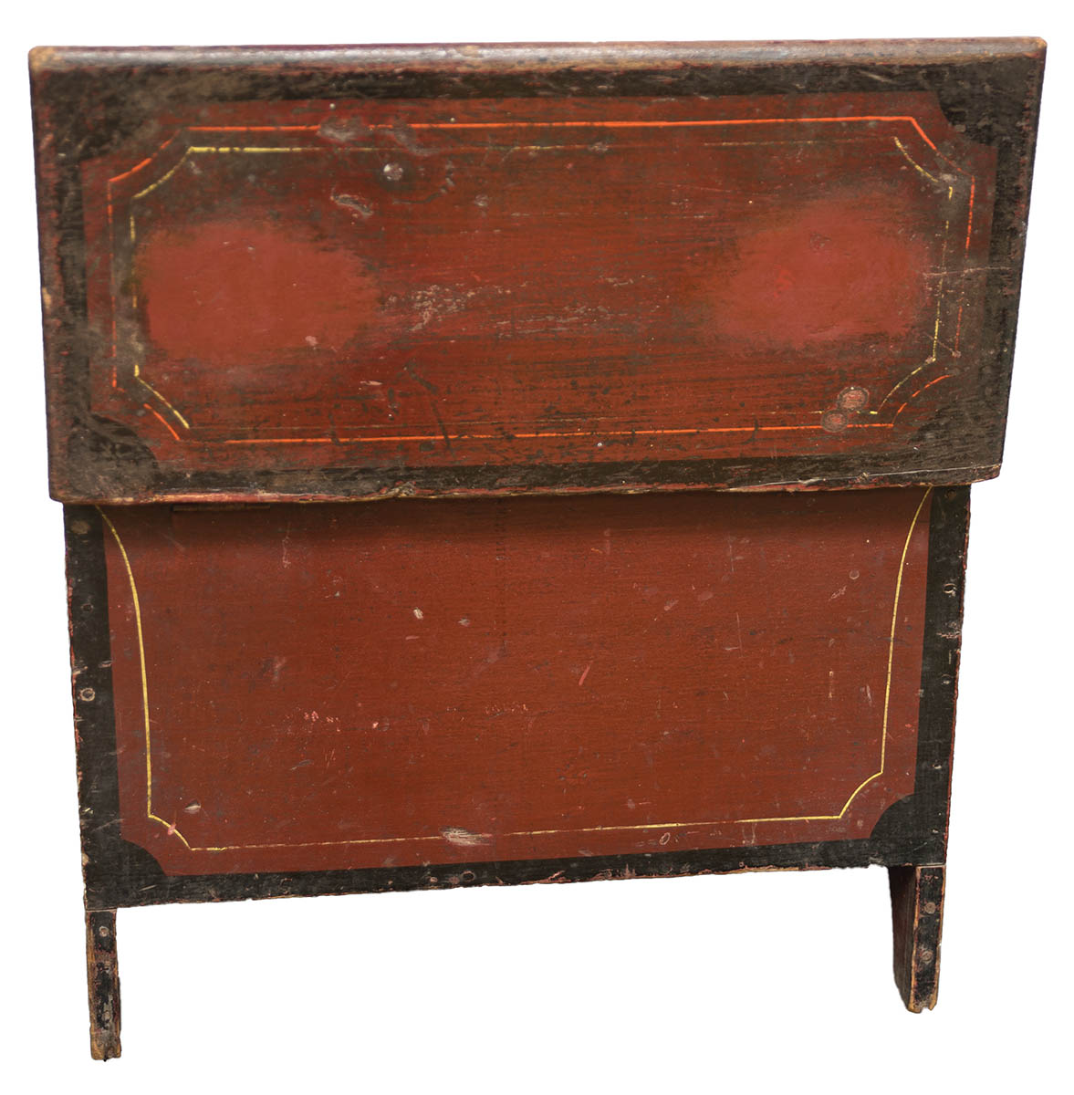 Pine, original red and black paint with white outline on all sides, (top shows some in-paint in two spots), bootjack ends, 10 1/2″ h, 14″ l, 7″ d.