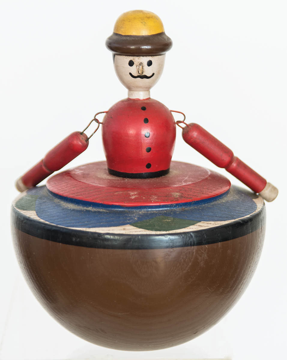 Kid body, original black velvet clothing with hat, 14″; and a wooden whirling toy with spinning arms, 6″ h; along with a glass dome with fitted round wood base.