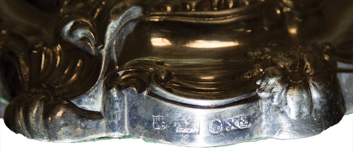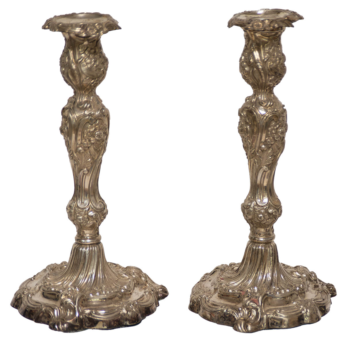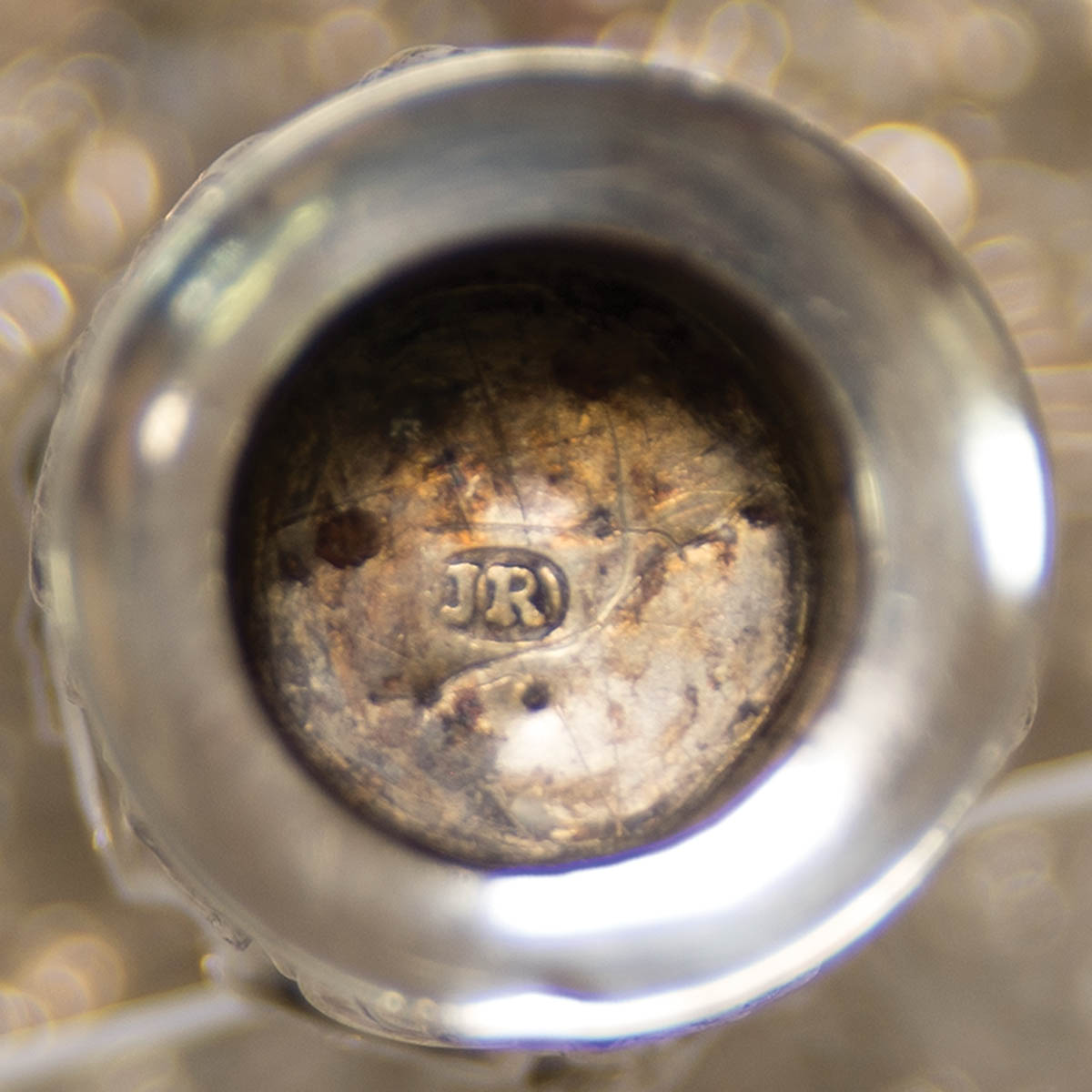 Art nouveau style, overall decoration with roses, leaves, vines, and swirls, hallmarked (HI & Co, rampant lion, profile, “X” and crown), “JR” in bobeche, weighted, 9 1/4″ h, 5″ h at base.
