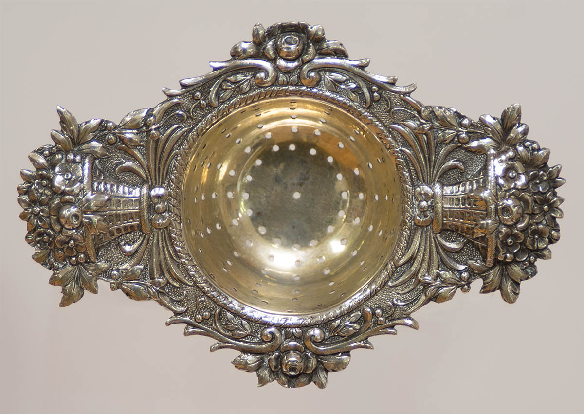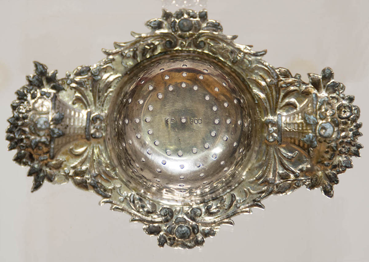 Exceptional strainer with basket of flower handles, entire surface decorated with roses, leaves, vines and lightly gilded bowl, hallmarked with a crescent moon and crown, marked “800”, excellent condition, 4 1/2″ l.