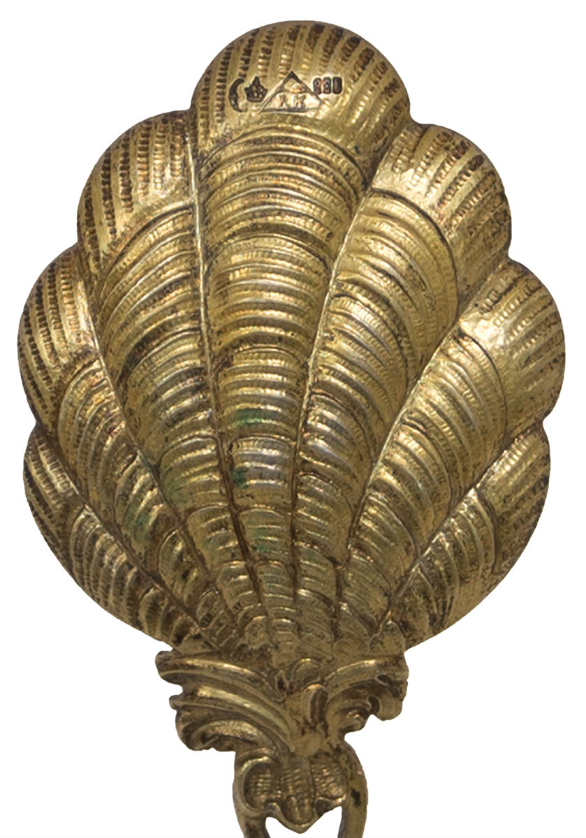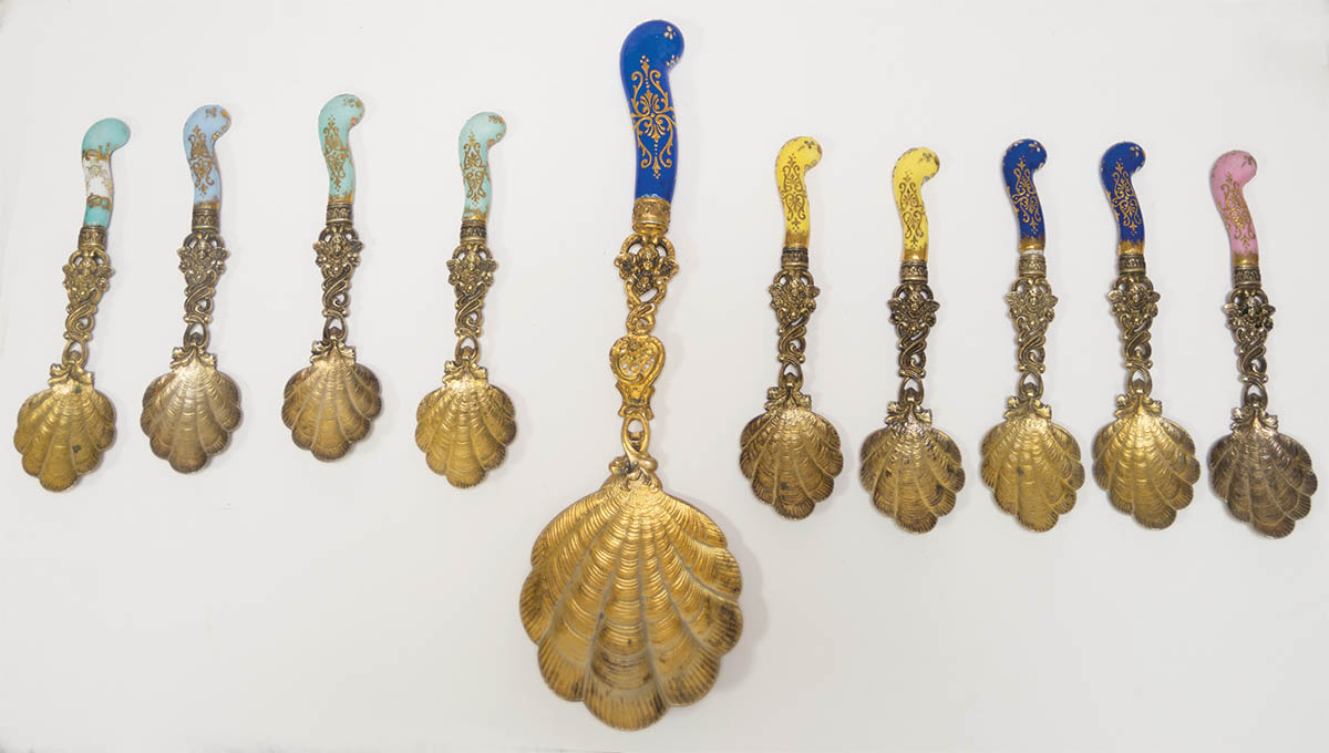 Victorian 10 piece dessert spoons and serving spoon, with scallop shell bowls, intricately fashioned shaft with winged angel head, porcelain handles with finely gilt and painted decoration, 10 1/4″ l, 6″ l spoons, hallmarked “PK” in triangle, crescent moon and crown, “800”, 14.02 ozt (included handles).