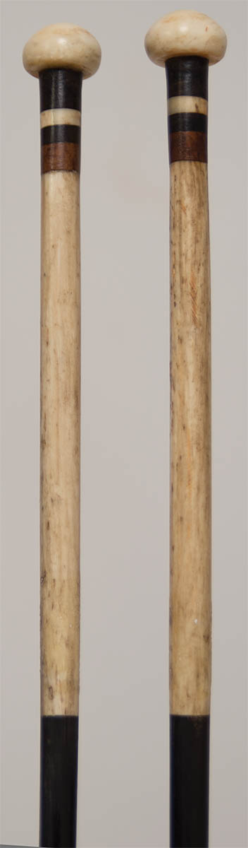 Mid 19th c., whalebone and carved baleen and wood knitting needles, 13″ l.