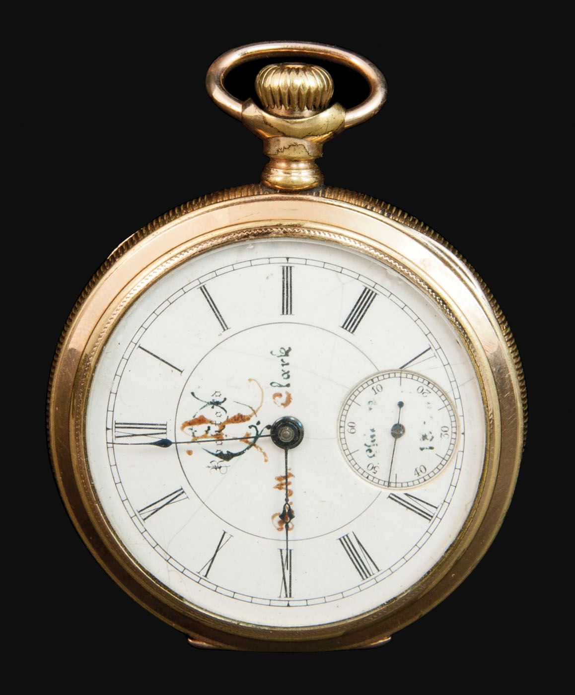 Men's R.M. Clark, open face, size 18 pocket watch, case is gold filled Ducher Special with anchor mark, the movement has minimal damaskeening, is marked “R.M. Co. Rockford Ill.”, and has “321XXX” as a serial number, Roman numeral white dial is handpainted and has a few hairline cracks throughout, this pendant wind lever set pocket watch does not run and has a well-rubbed case.