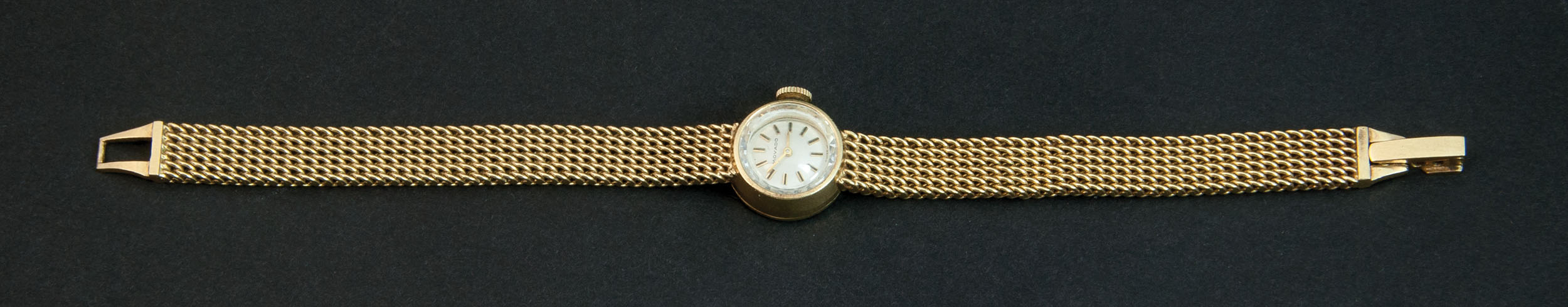 Ladies 14K yellow gold Movado wristwatch, bracelet is marked “14 MK”, the gold case is marked “P.C.A. 12-25-64” as “14 MK”, the interior of the bezel is marked “USA Movado 14K Gold 47475 37”, the Swiss movement is 17 jewels, unadjusted, and marked “Movado”, “F'RI”, “ES” and “MXI”, the weight in 14K without movement is 20.24 gms, (ex. Archibald estate, Powder Point, Duxbury, MA).