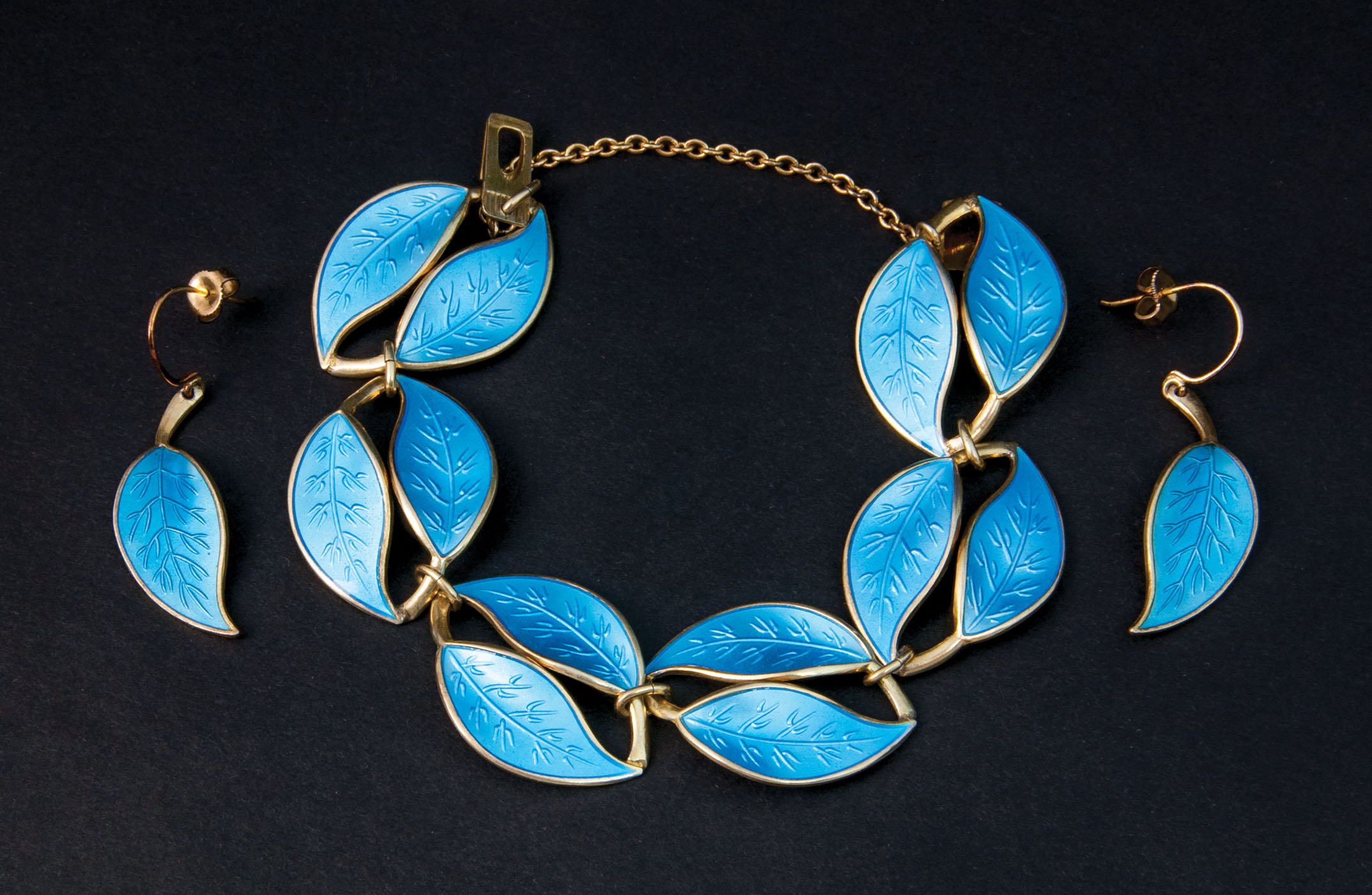 Meka, Denmark, sterling bracelet, and pair of earrrings in leaf form, blue champleve enamel; Modern hand-hammered 14K gold pendant, 1 3/4″ l; and a pair of earrings, 1 1/4″ l; c. 1950's, (ex. Archibald estate, Powder Point, Duxbury, MA).