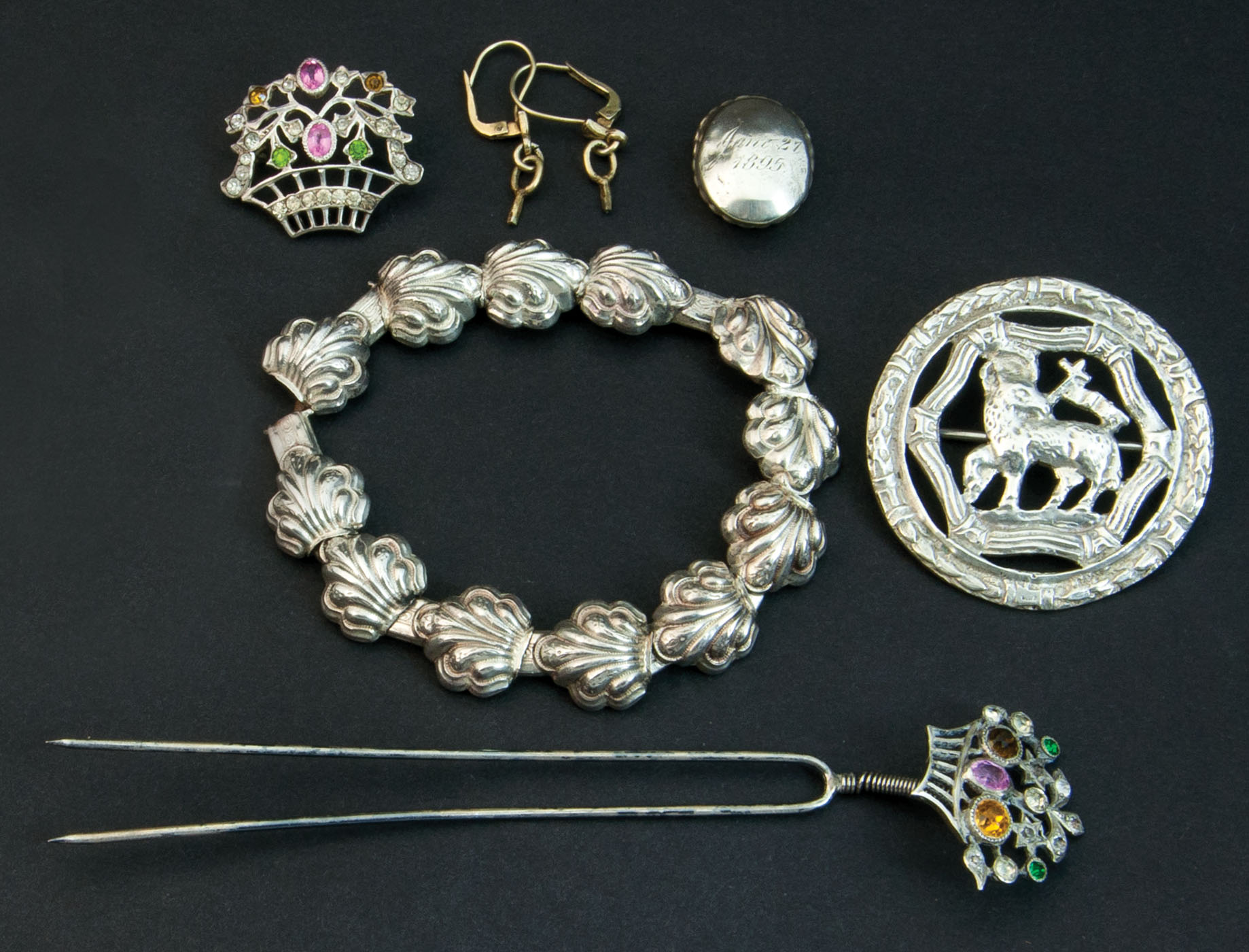 Estimate: $50 – $100 Sterling hair pin and brooch; untested bracelet; 800 round pin depicting a heraldic emblem; earring wires; and monogrammed oval pin “as is”.