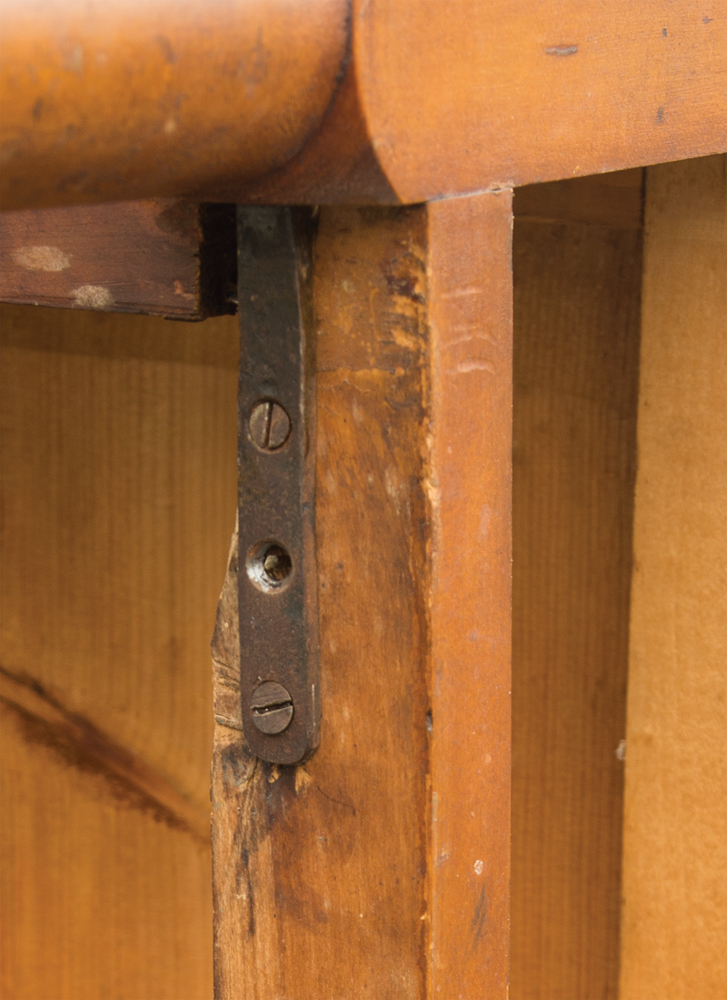 Maple, cherry and walnut, single board top, original varnish finish, three drawers over two drawers over single large bottom drawer, all with figured dark cherry drawer fronts, each finely dovetailed, turned walnut pulls, three graduated inset panels on each side, square to turned legs, with medial triple scribe lines, left front leg strengthened with a forged iron bolt, and iron support bracket under the front, 19th c. iron casters with piece (unattached), c. 1840, 30″ h, 55″ w, 26 1/2″ d; top is 61″ w, 32″ d.