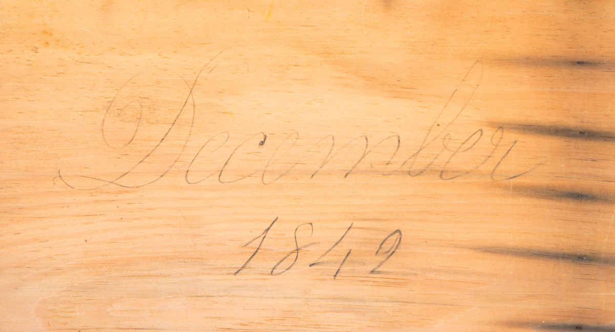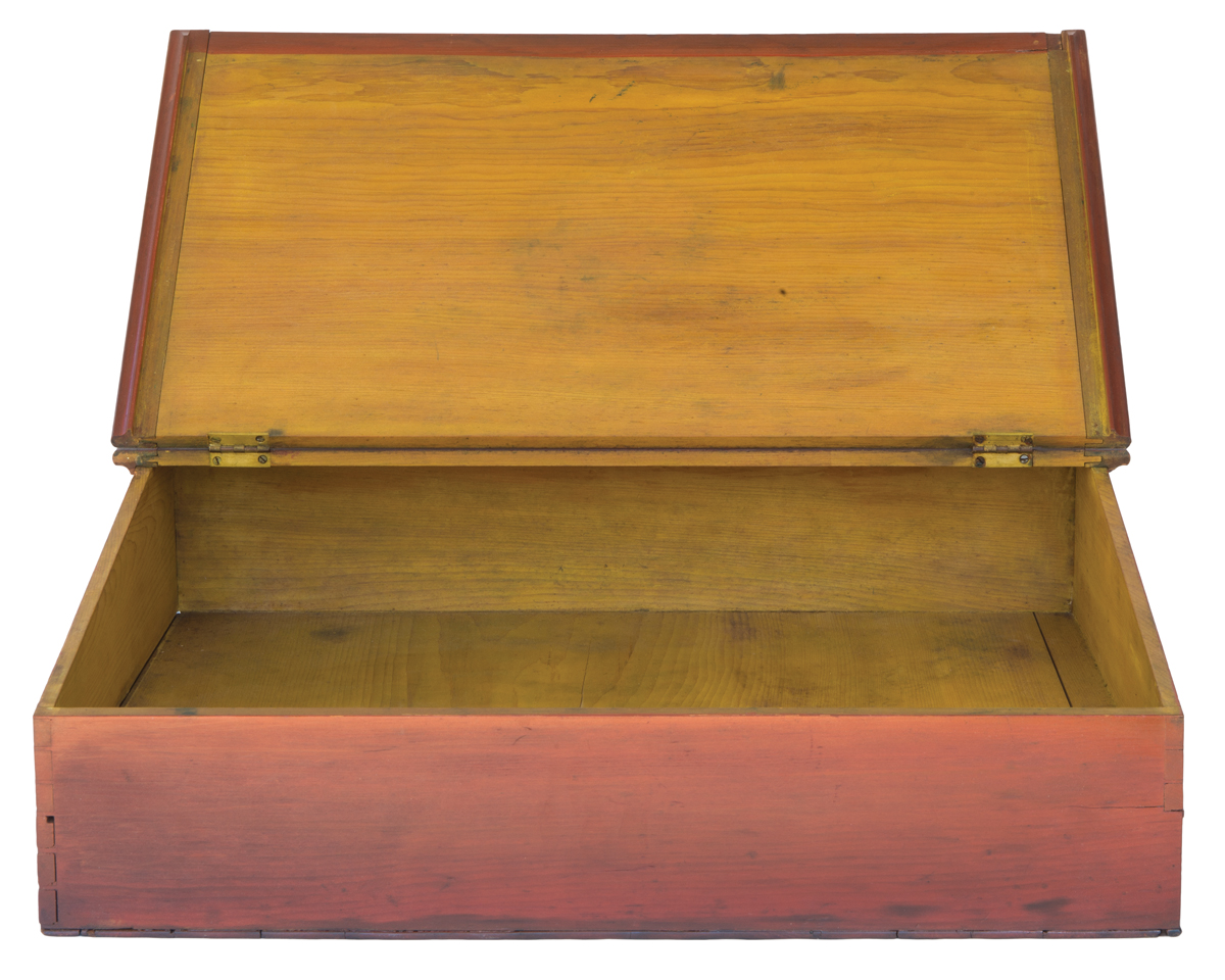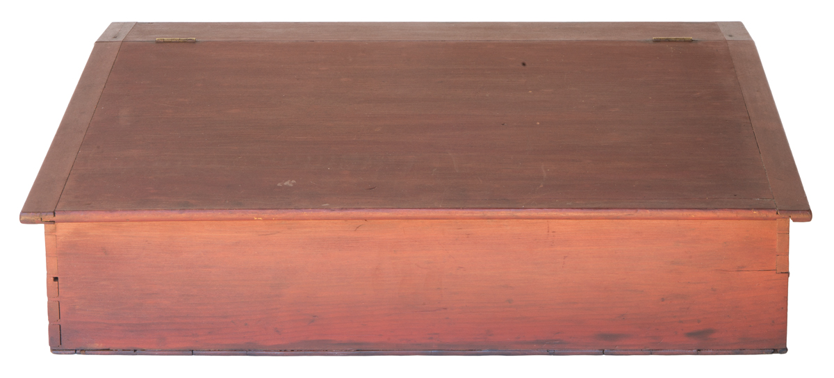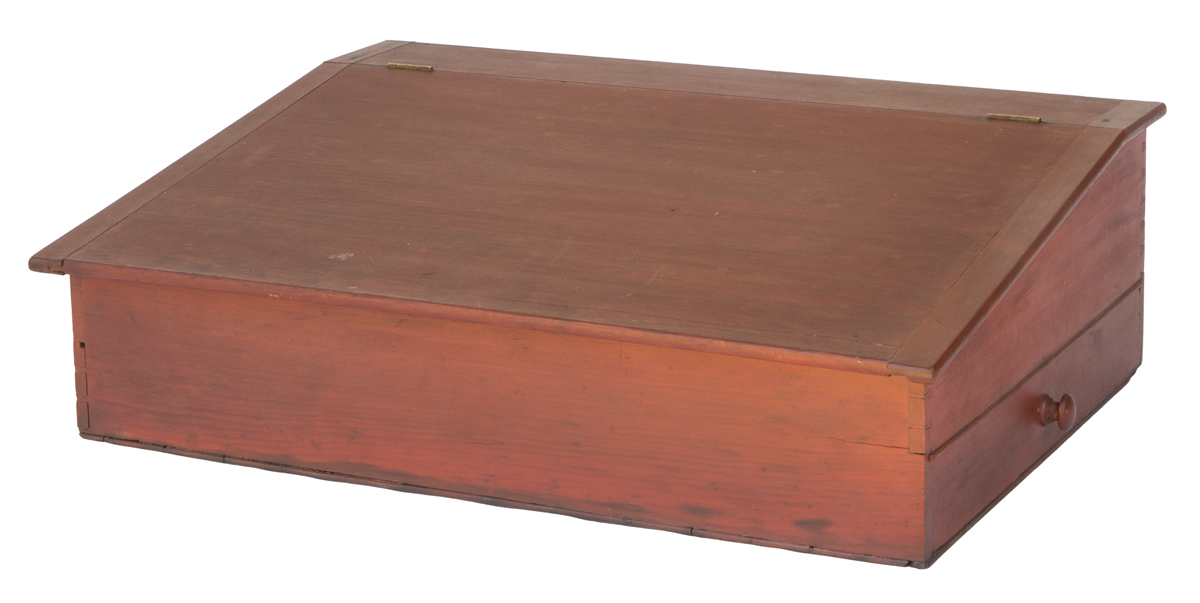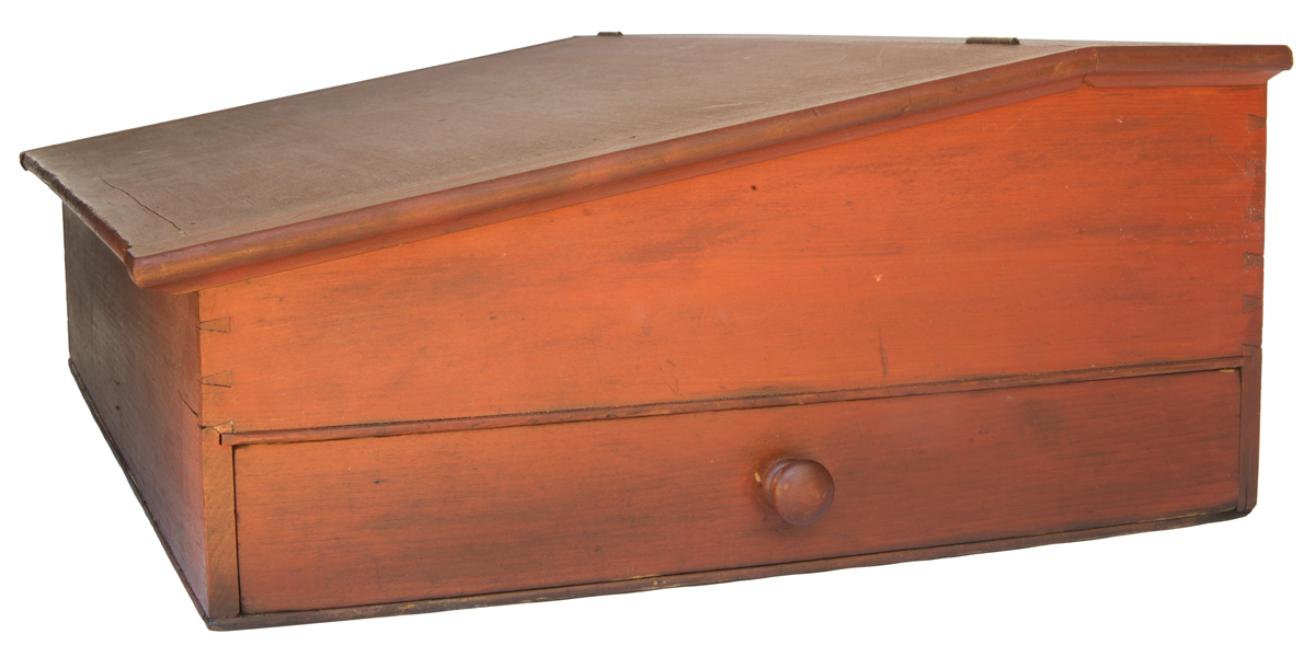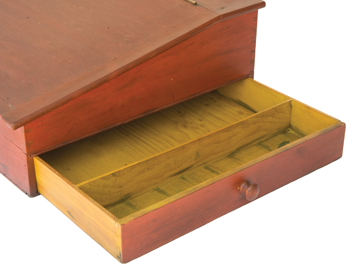 Pine, dark cherry, rewashed bittersweet red exterior finish, and chrome yellow stained interior, hinged slanted lid, writing surface with molded beadboard sides, opening to a simple storage compartment, finely dovetailed case, single drawer opening on right side, finely dovetailed, interior partition for pens, quills and ink, dated on bottom “December, 1842″, 6 1/2″ h, 21″ w, 14” d.