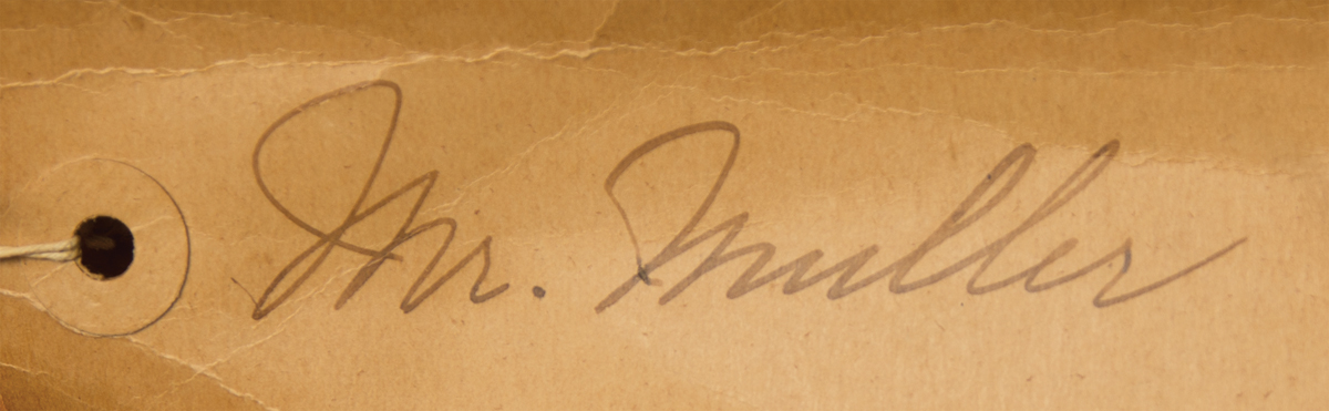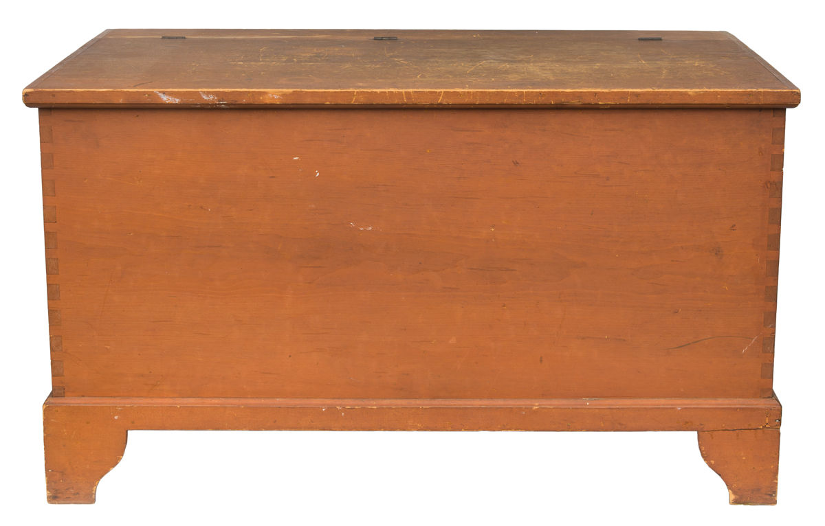 Pine, original pumpkin orange stained finish, triple hinged single board top, with applied quarter round molding, two-section interior, central divider, finely dovetailed case, quarter round molded base with cyma curved feet front and back, manila tag reads “Mr. Muller” written by a Canterbury Shaker for Erhart Muller, 28 1/4″ h, 48″ w, 26 3/4″ d.