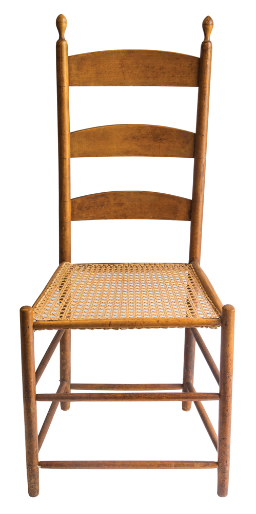 Maple, old original varnish finish, Harvard, MA, c. 1840, early caned seat, “4” on back of top slat (room number); Maple, old original varnish finish, Canterbury, NH, caned seat, stamped “18” on front stile (indicates room number), tilters, 17 1/2″ seat h, 40 1/2″ overall h.
