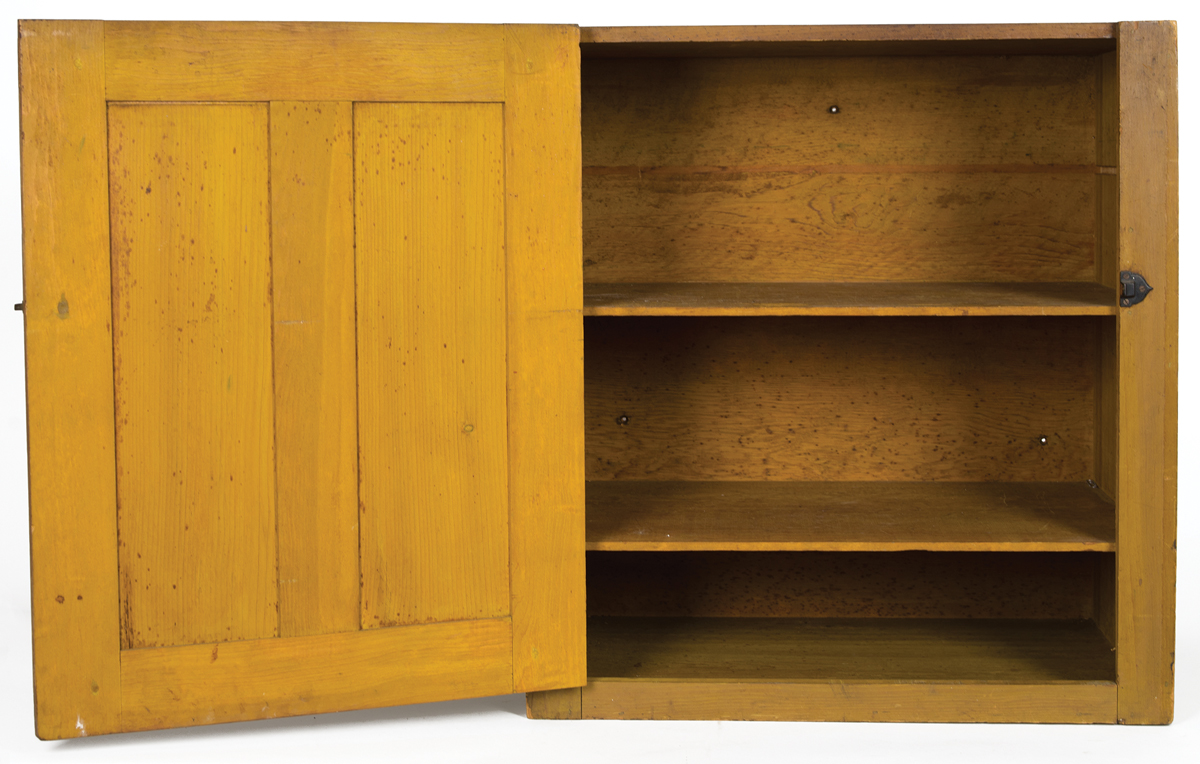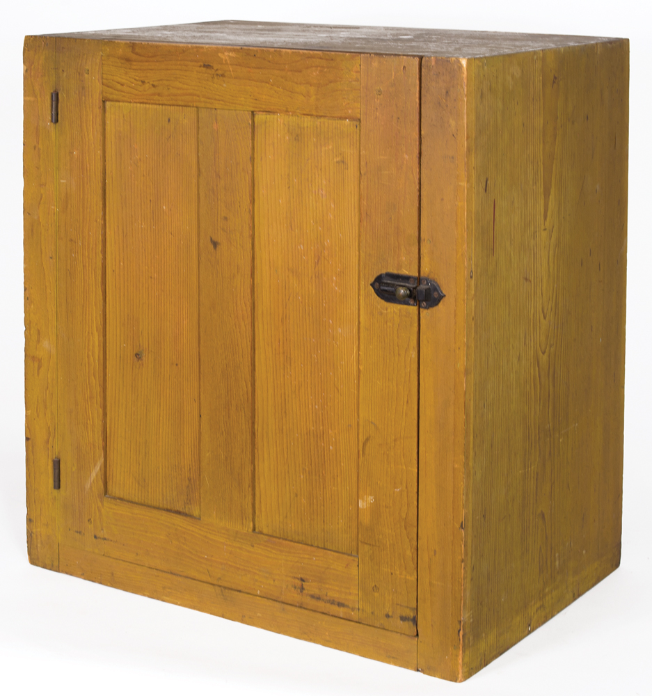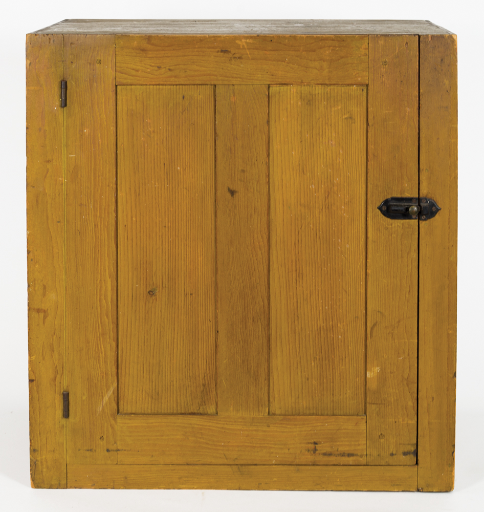 Pine, original chrome yellow washed finish, single door with two vertical panels, through mortised with single pin construction, cast steel spring loaded latch, c. 1840-1850, 27″ h, 25 1/2″ w, 17 1/4″ d, (ex. Faul collection).