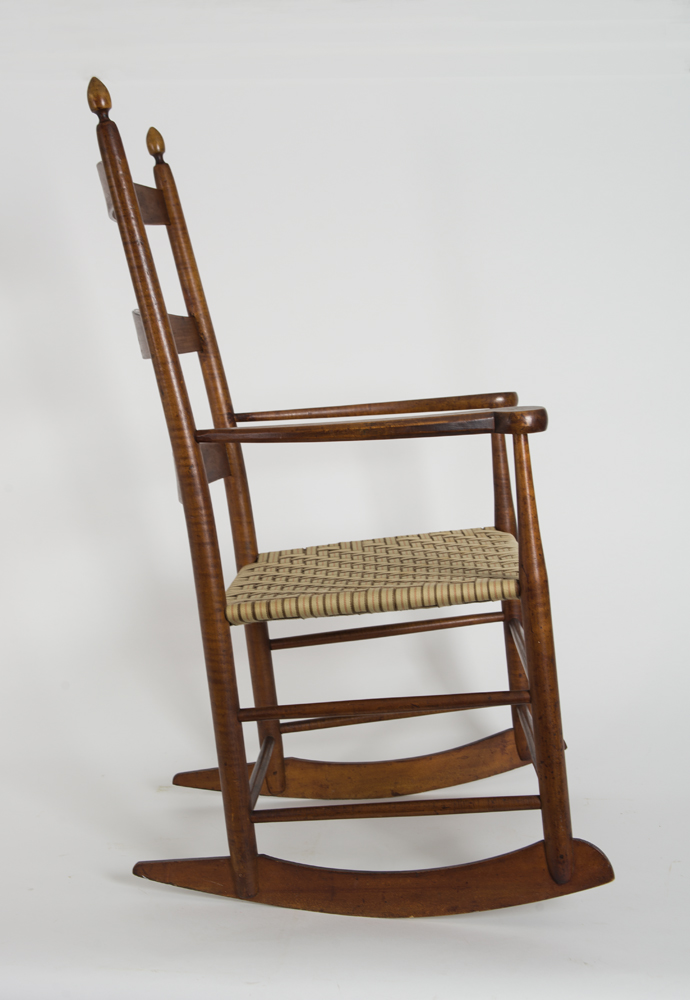 Maple and tiger maple, original varnish finish, canted back stiles, acorn finials, three shaped slats, flat curvilinear arms, contemporary woven beige with brown and orange stripe taped seat, boxed stretchers, pre-production Mt. Lebanon, NY, c. 1850-1860, 16 1/2″ seat h, 38 1/2″ overall h, (ex. Faul collection).
