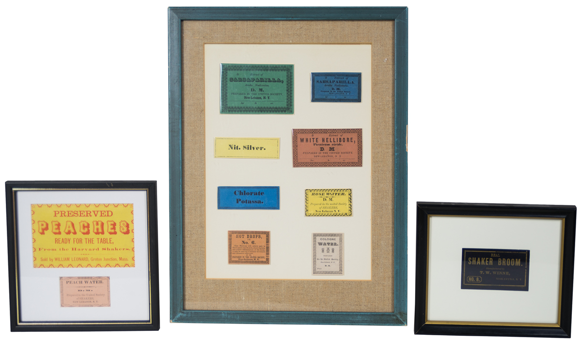 Framed and matted, eight extract herb labels, including “Sarsaparilla”, “Rose Water”, “Hot Drops”, “NiT.Silver.”, in yellow, white, blue, green and mauve, New Lebanon, NY; Framed and matted, two labels “Peaches” and “Peach Water” (Harvard Shakers and the Shakers of New Lebanon, N.Y.; Framed “Real Shaker Broom” label from Niskayuna (Watervliet), N.Y.