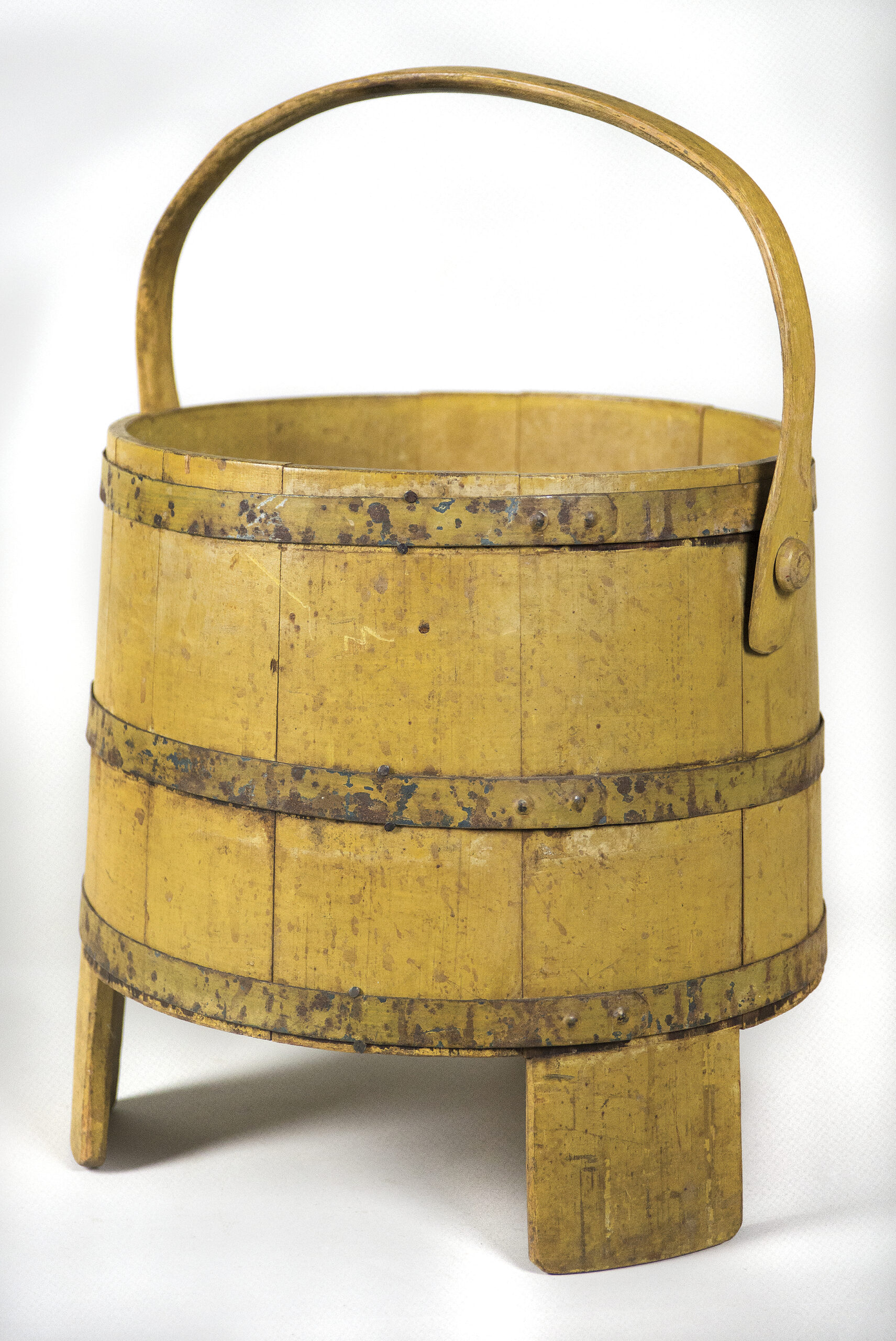 Pine, original chrome yellow painted finish, swing handle, three staves extend further and form a tripod base, three steel hoops with two rivets and pointed ends, c. 1840, 12 1/2″ h (to rim), 18″ h (to top of handle), 11 1/2″ dia.