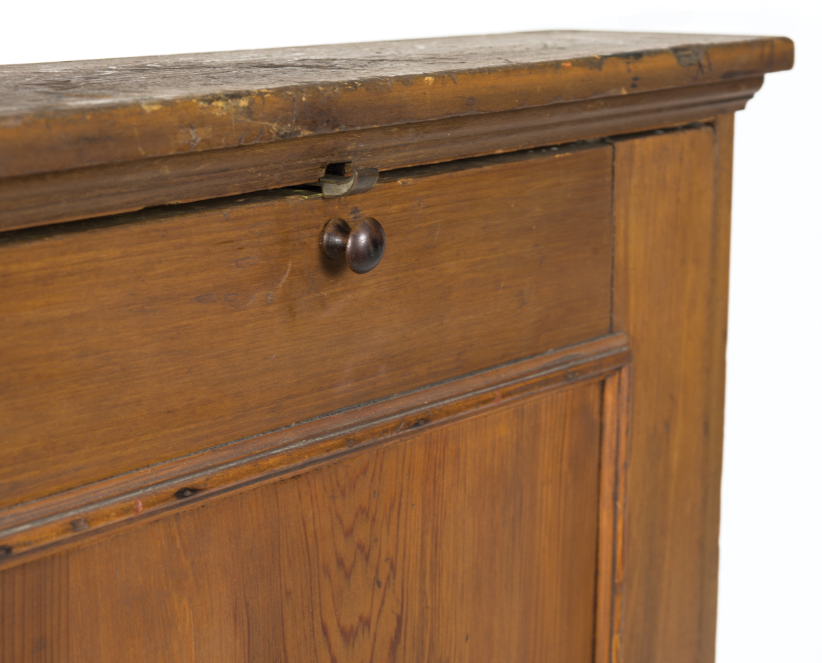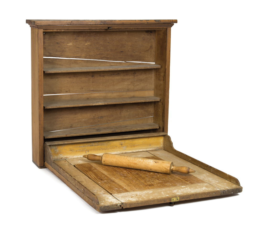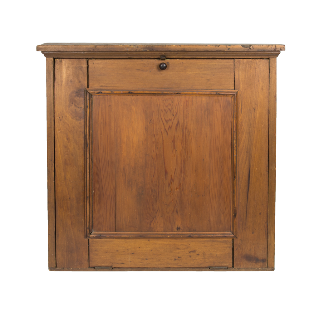 Poplar, yellow pine, old natural finish, applied molding under top board, Shaker cast steel spring door catch at molding, Shaker turned cherry wood pull, fall front work surface with applied sides and back (which inserts into three notched shelves), door with applied molding around central yellow pine panel, 26″ h, 26 1/2″ case, 27 1/2″ w, 4 3/4″ d; and a Shaker turned maple rolling pin, (probably original), 20″ l; (ex. Faul collection).