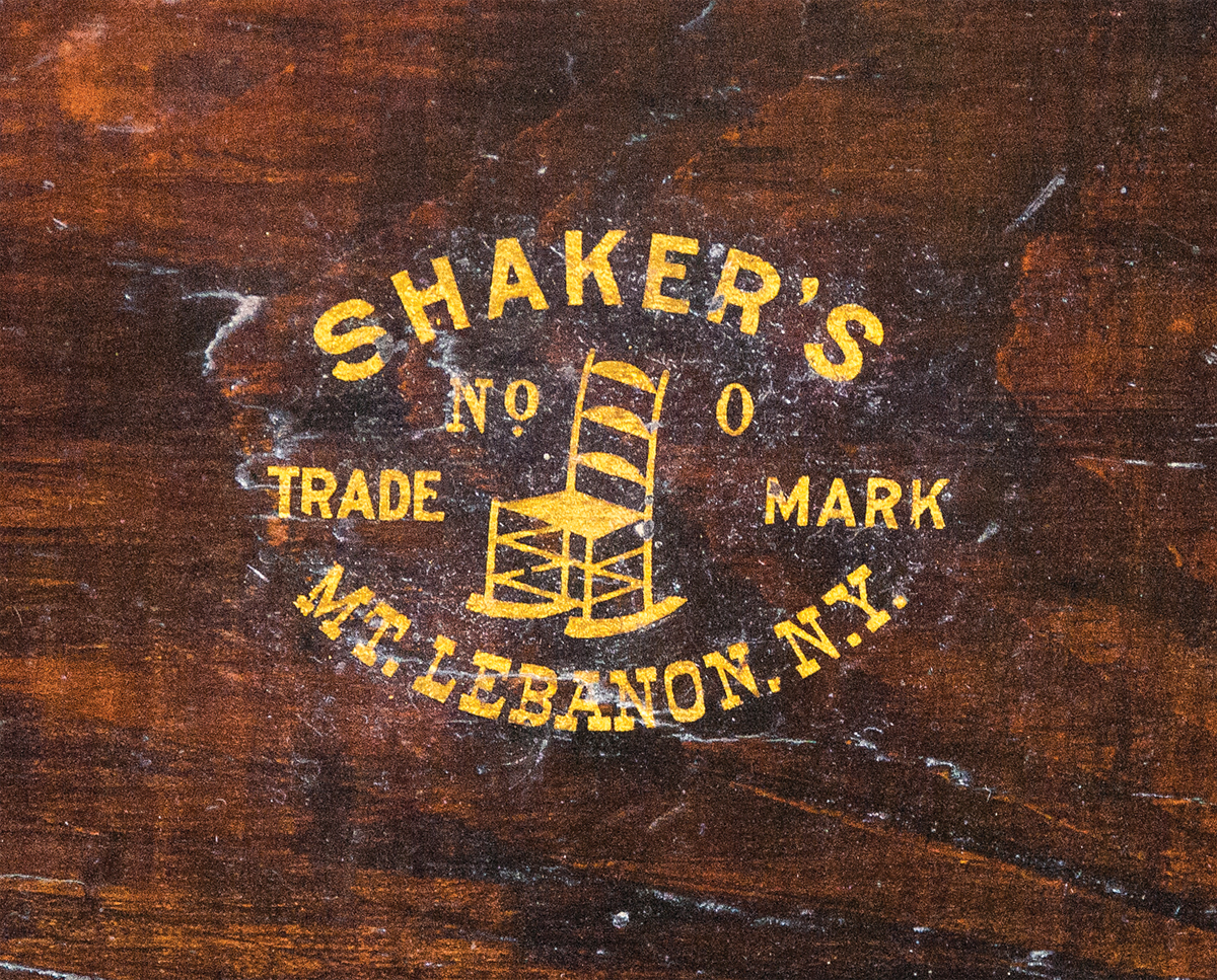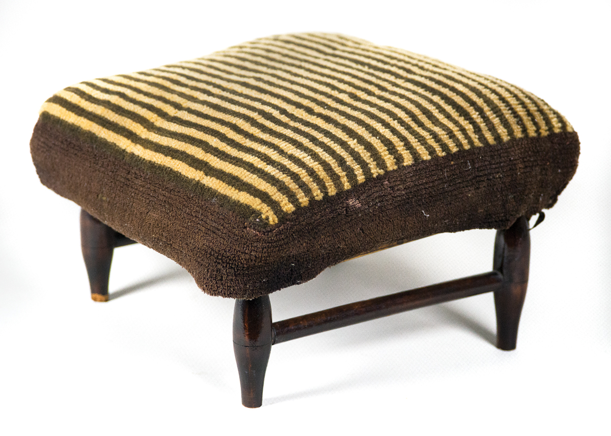 Maple stool in original walnut varnish stained finish, trademark decal on bottom “Shakers, Mt. Lebanon, N.Y., No. 0″, with a rare Shaker woven cotton and wool, brown stripe plush covering, Mt. Lebanon, NY, c. 1880-1900, very fine condition, 6 1/2″ to 8″ h, 12” sq top.
