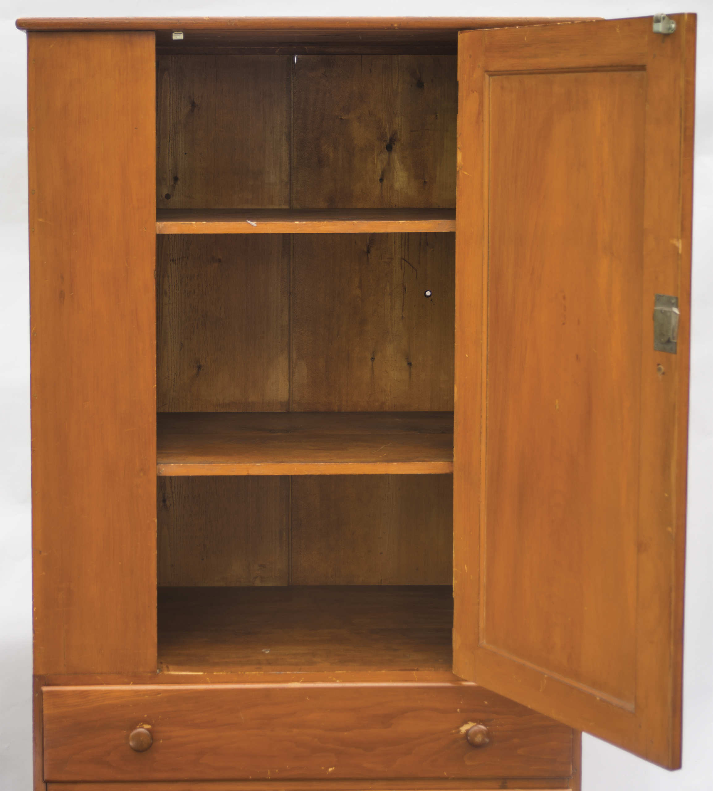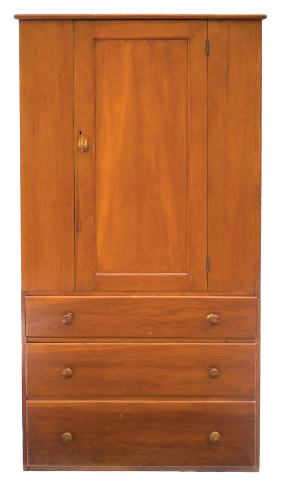 Pine, natural varnish finish, tall vertical inset panel molded door, three-shelf interior, over three graduated, lipped and dovetailed drawers, original turned pulls, c. 1840-1850, 68″ h, 34 1/2″ w, 20 1/2″ d.
