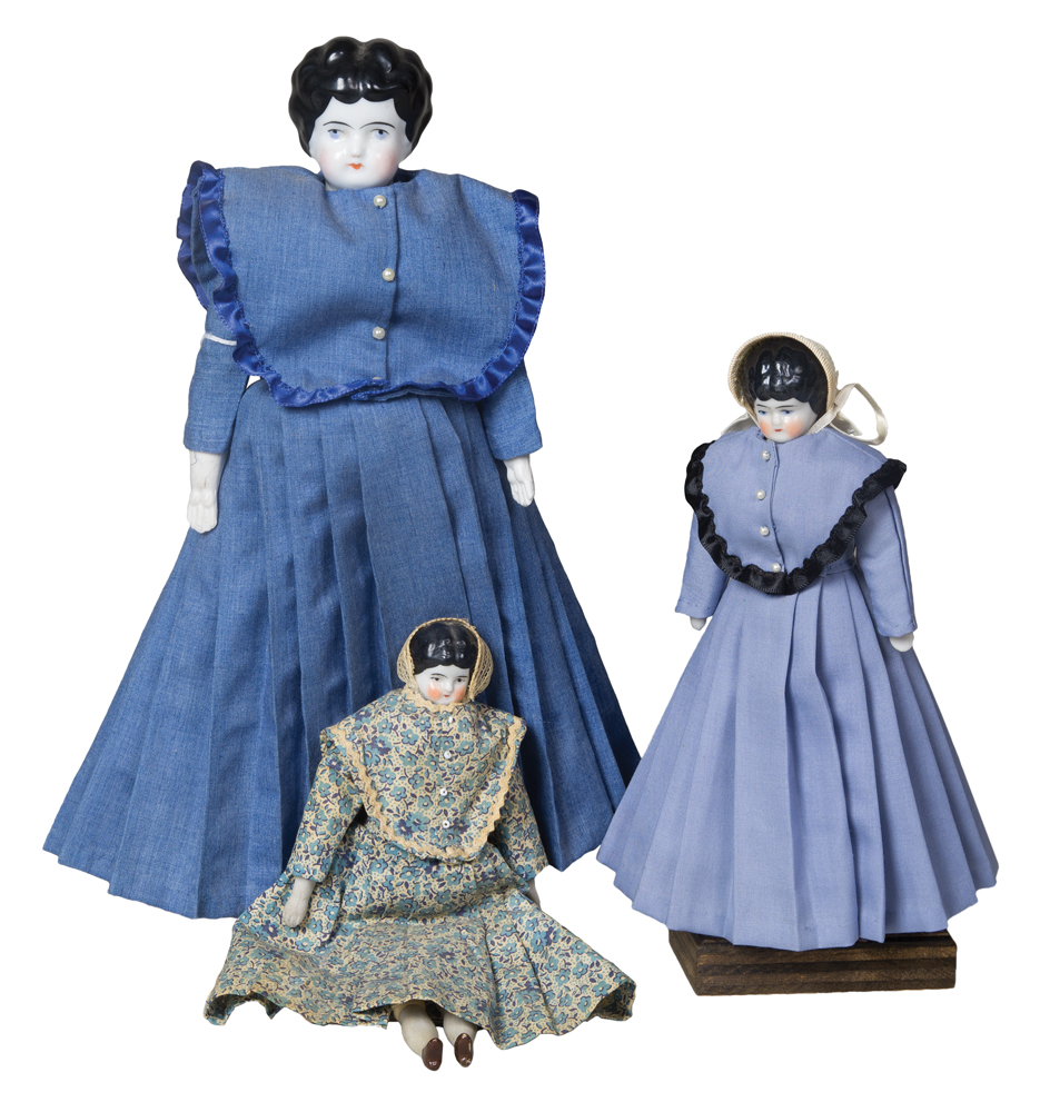 Largest doll “is dressed with material from Sister Mildred’s dress. Dressed by Ruth Nutter for Shaker Store.”, pleated blue dress with blue silk trimmed “Bertha”, (sold WHA, 6-8-02, Lot 32), 12″ h; Doll with card “Shaker Doll dressed by Ruth Nutter”, stamped on card “Shaker Society, SDL Maine”, light purple dress with straw bonnet, inset half round molded edge, black trimmed “Bertha”, 9″ h; Doll dressed in a pleated floral print dress, with white trimmed “Bertha” and a summer woven bonnet, white bead buttons, 7 1/2″ h.