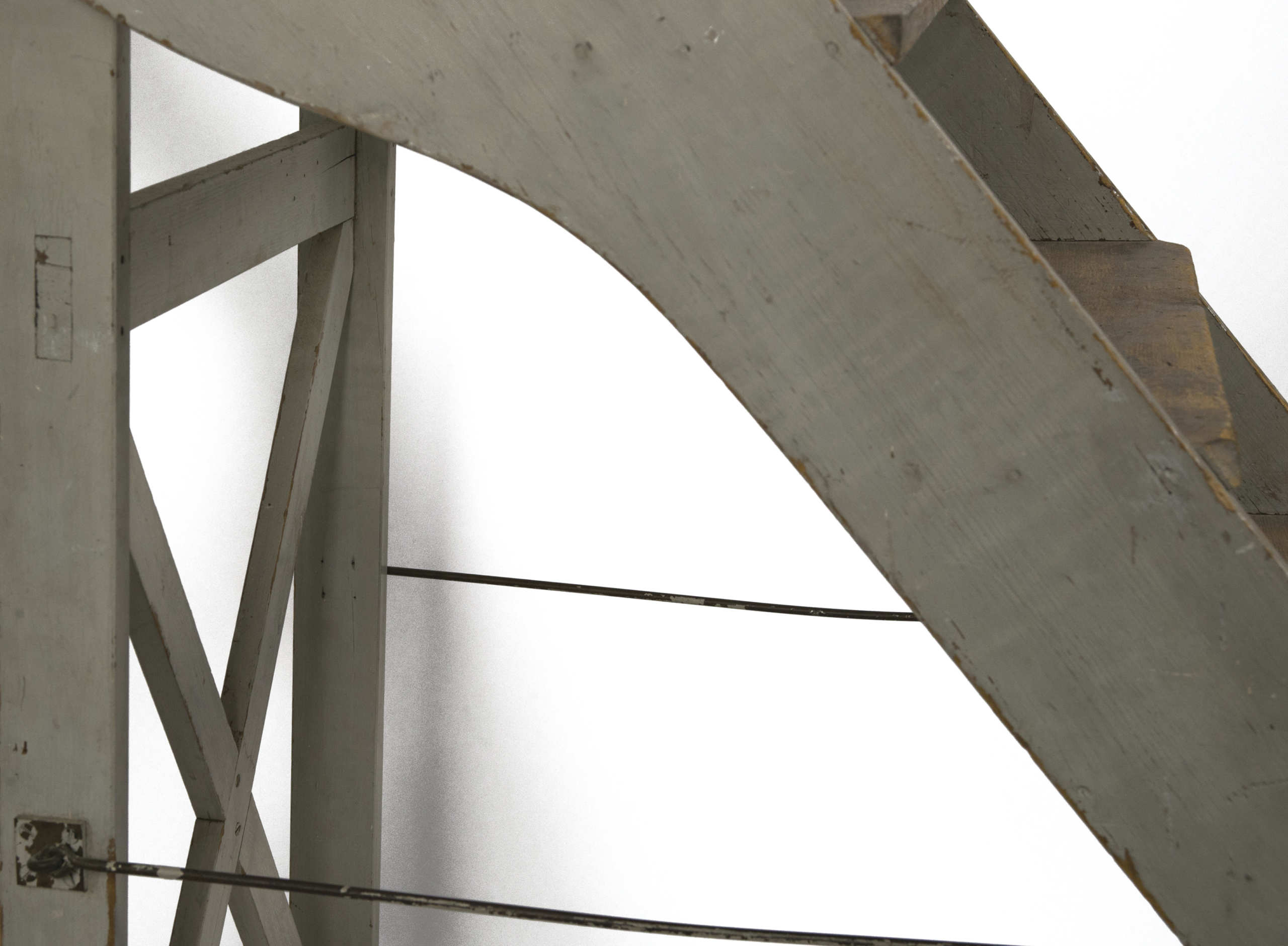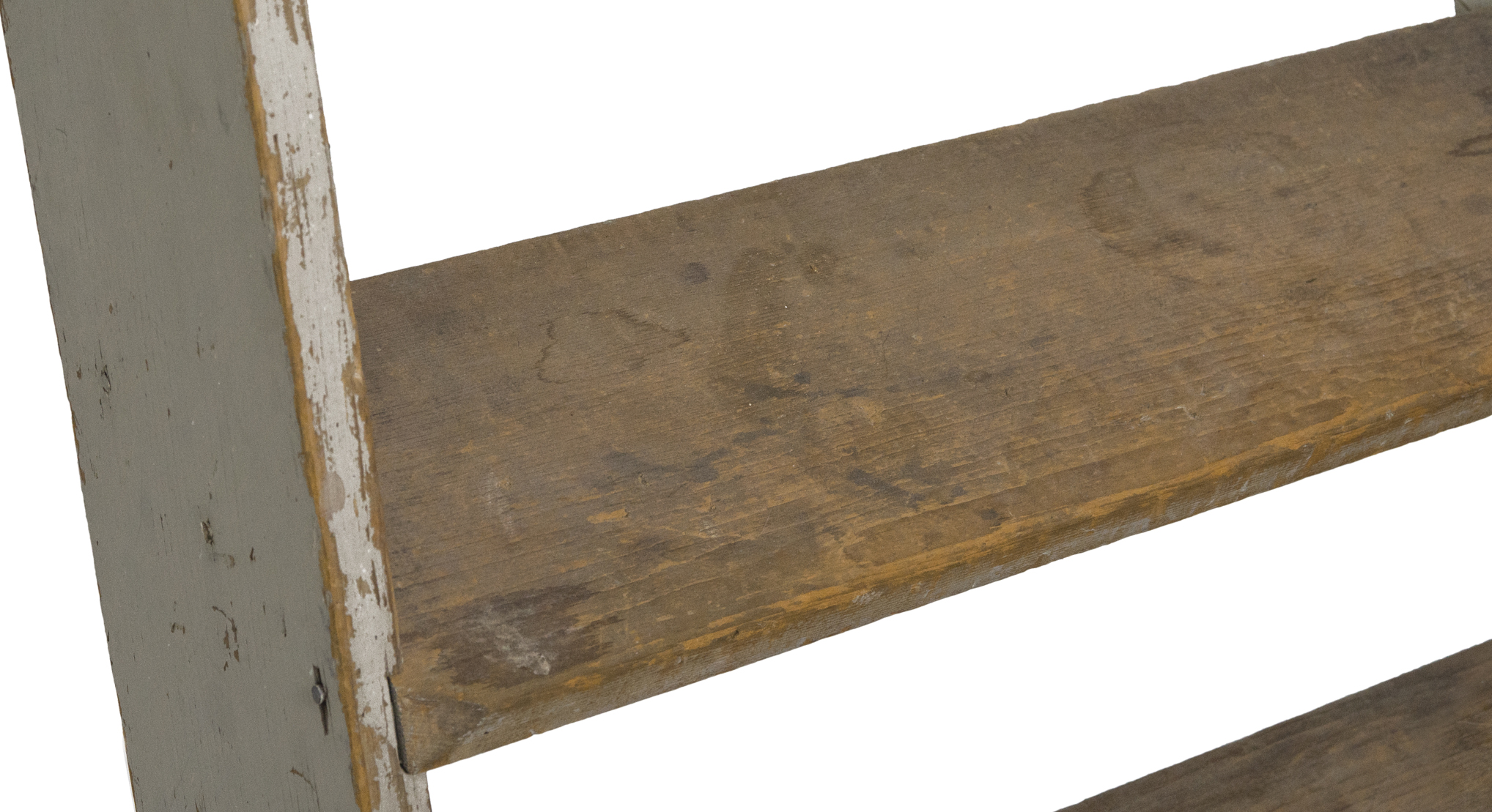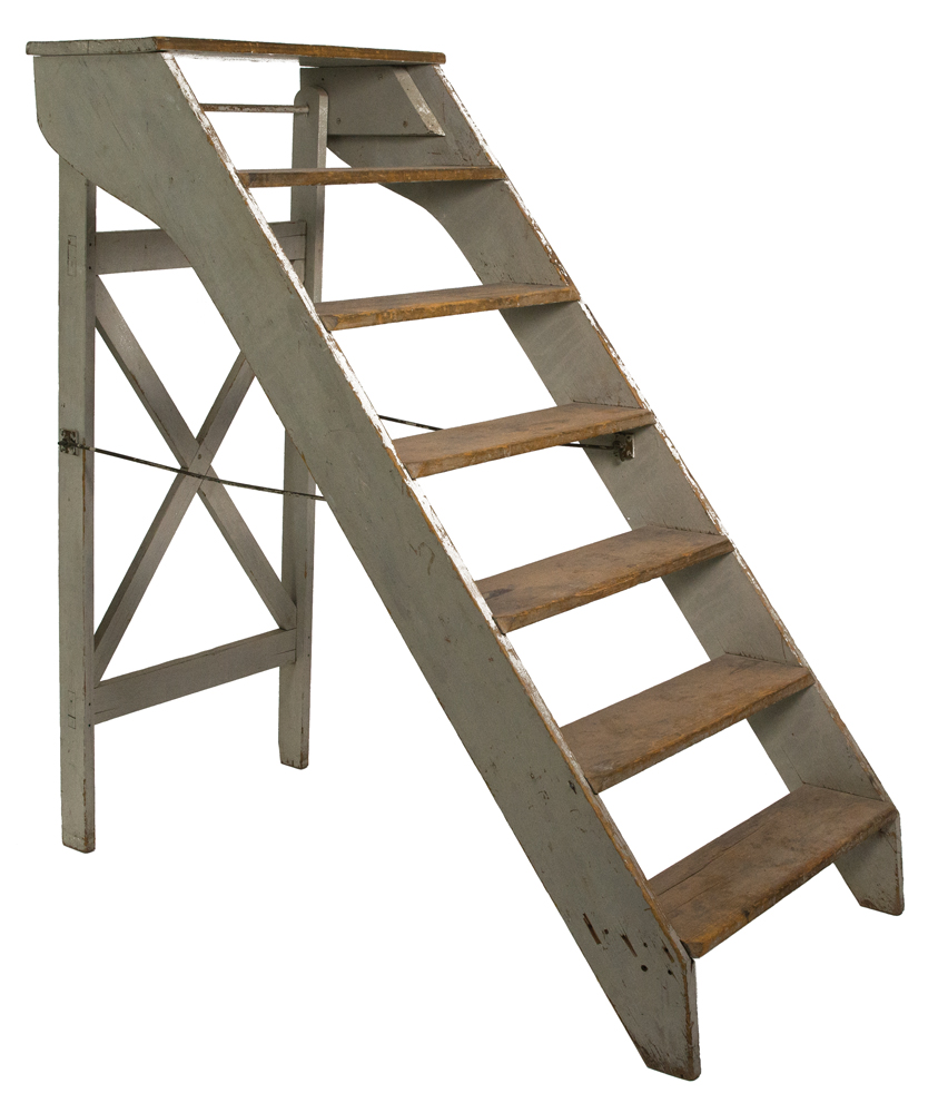 Pine, original gray painted finish, seven steps tall, two 28″ long brass side hooks to stabilize ladder in setup position, “X” crossed upright through mortised and double nailed, c. 1870-1880, 53″ h, 25″ w, 51 1/2″ open at base, (ex. Faul collection).