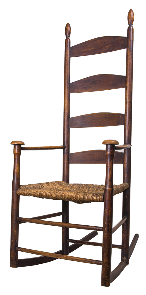 Maple, original dark walnut stained finish, tall shaped finials, four graduated ladders, original rush seat, flat curvilinear arms with large capped posts, Enfield, CT, c. 1820-1830, (note: a rare example of this style from Enfield in exceptional condition), exhibited at “The Shaker Gallery”, 2015-2016, New Britain Museum of American Art, New Britain, CT, 16″ seat h, 46″ overall h, (ex. Ed Clerk collection).