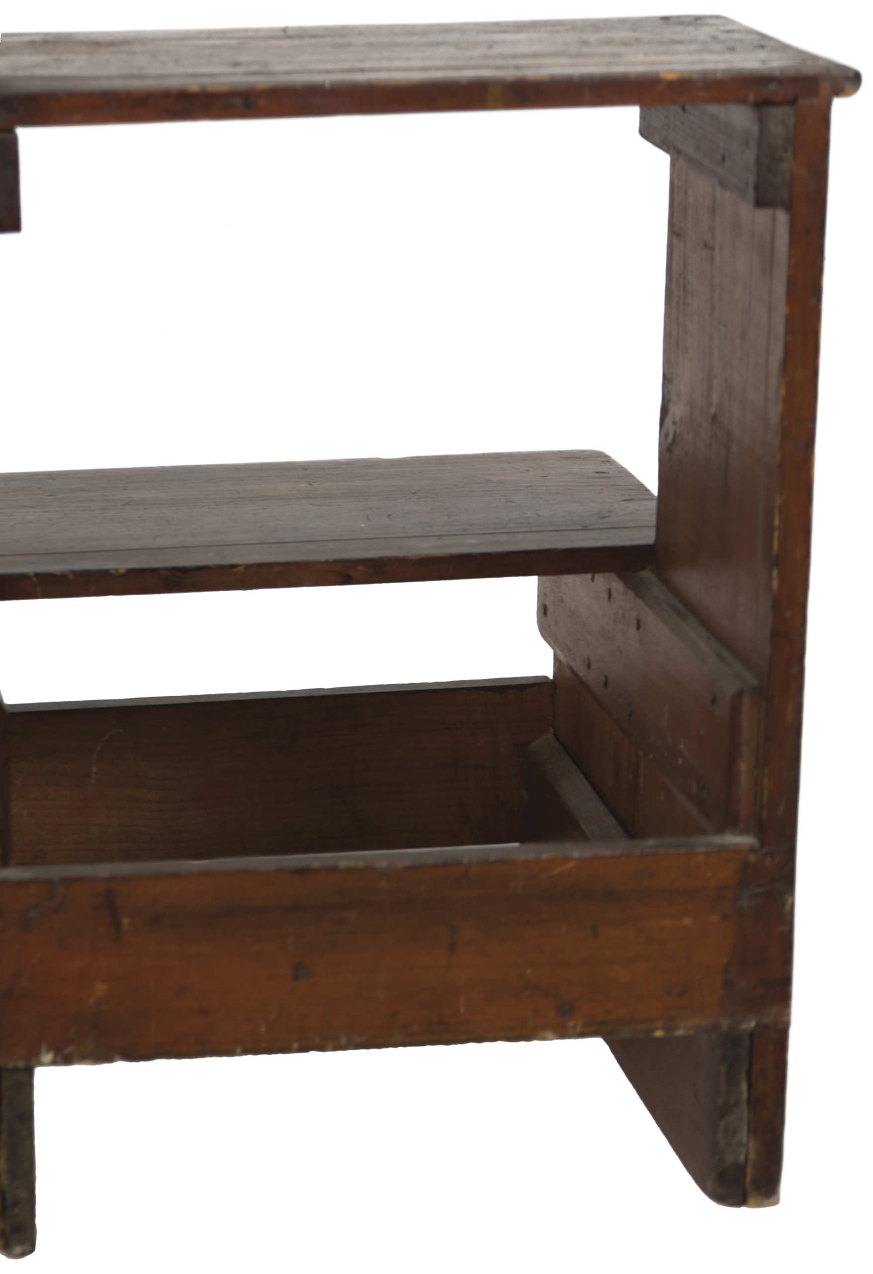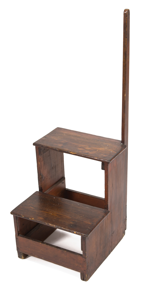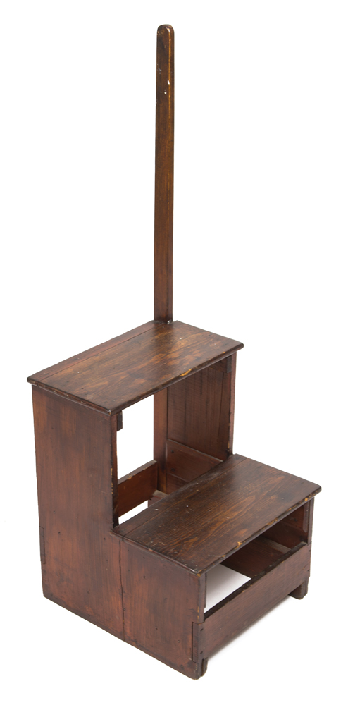 Pine, original brown stained finish, two step treads, carved birch hand support, possibly a later Shaker addition, square nailed construction, c. 1850, 36″ h, 16 1/2″ h (to top step), 12 1/2″ w, 13 3/4″ d, (ex. Faul collection).