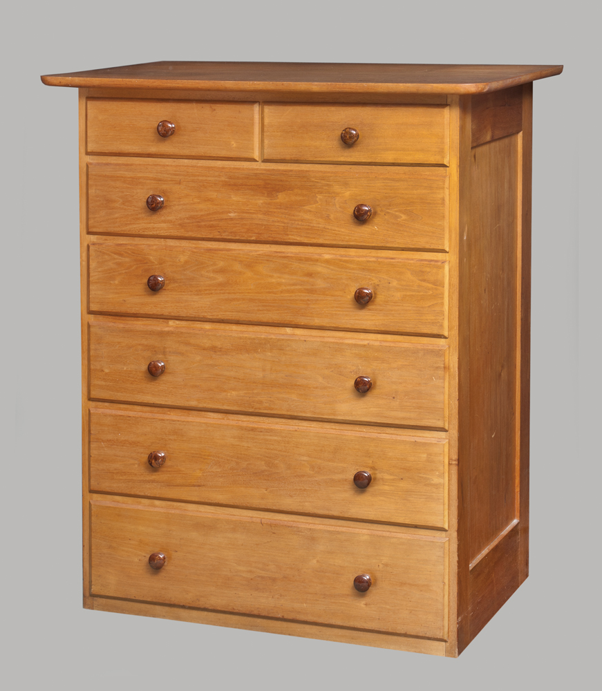 Butternut, original light yellow varnish finish, original brown Bennington porcelain pulls, overhung top is heavily beveled with rounded corners in the front, six drawers tall with split top drawer, beveled and lipped drawer fronts finely dovetailed, held with forged nuts, slightly beveled inset side panels, Enfield, CT, c. 1850, (see The Encyclopedia of Shaker Furniture, Rieman and Burks, p. 319, Fig. 468, for similar example), 49″ h, 36″ w, 20″ d.