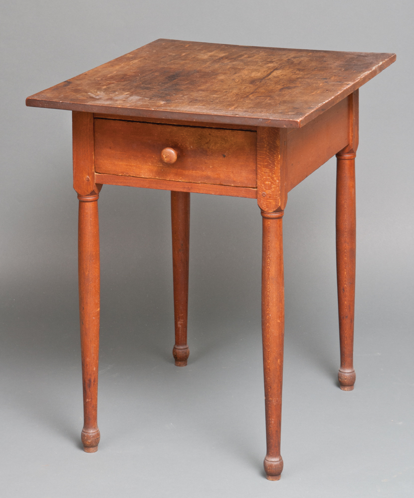 Cherry and poplar, single board, rectangular, cherry wood top, dovetailed drawer, with finely turned cherry pull pegged on inside, turned leg with button foot, with double scribe lines, Canterbury, NH, c. 1840-1850, 26″ h, 20″ w (top), 24″ d.