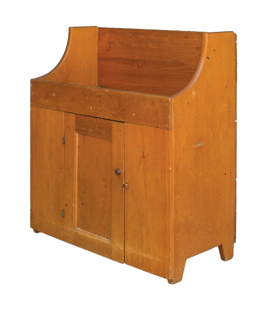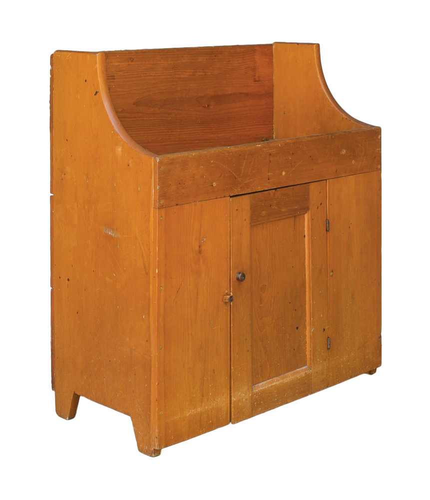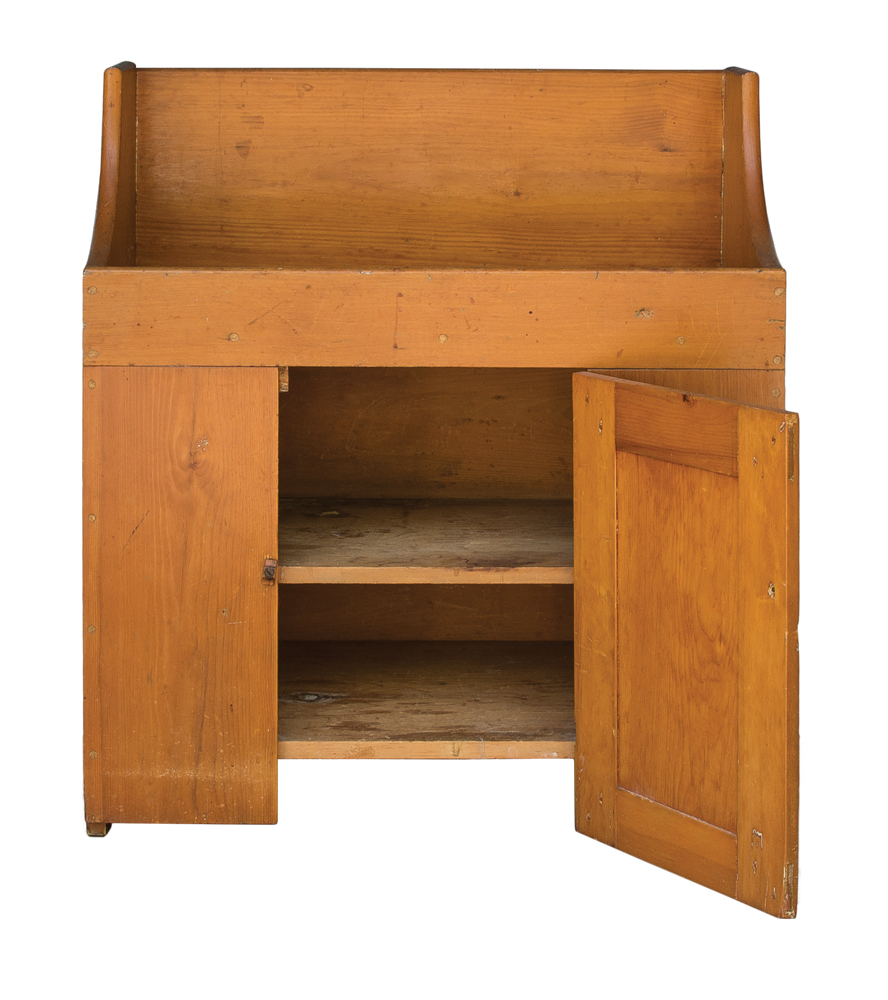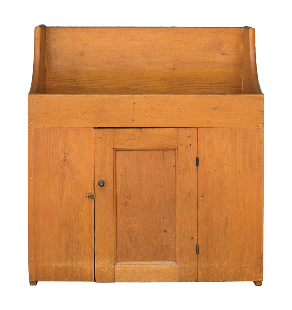 Pine, old refinish, raised back board (11″ h), sides sloping towards the front interior well, inset panel door, through mortised and double pinned on the diagonal, original dark walnut pull, canted feet on sides, carved turned wood door closure, c. 1830-1840, 35″ h, 31 1/2″ w, 15 1/4″ d.