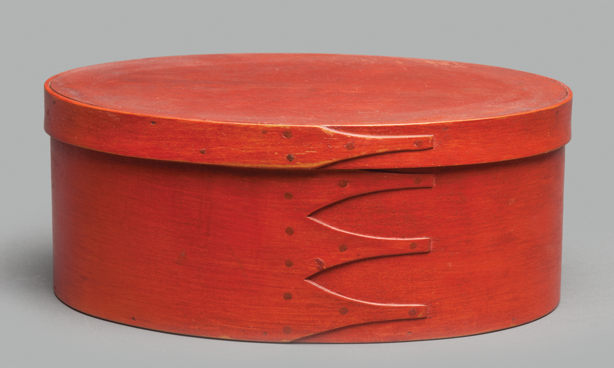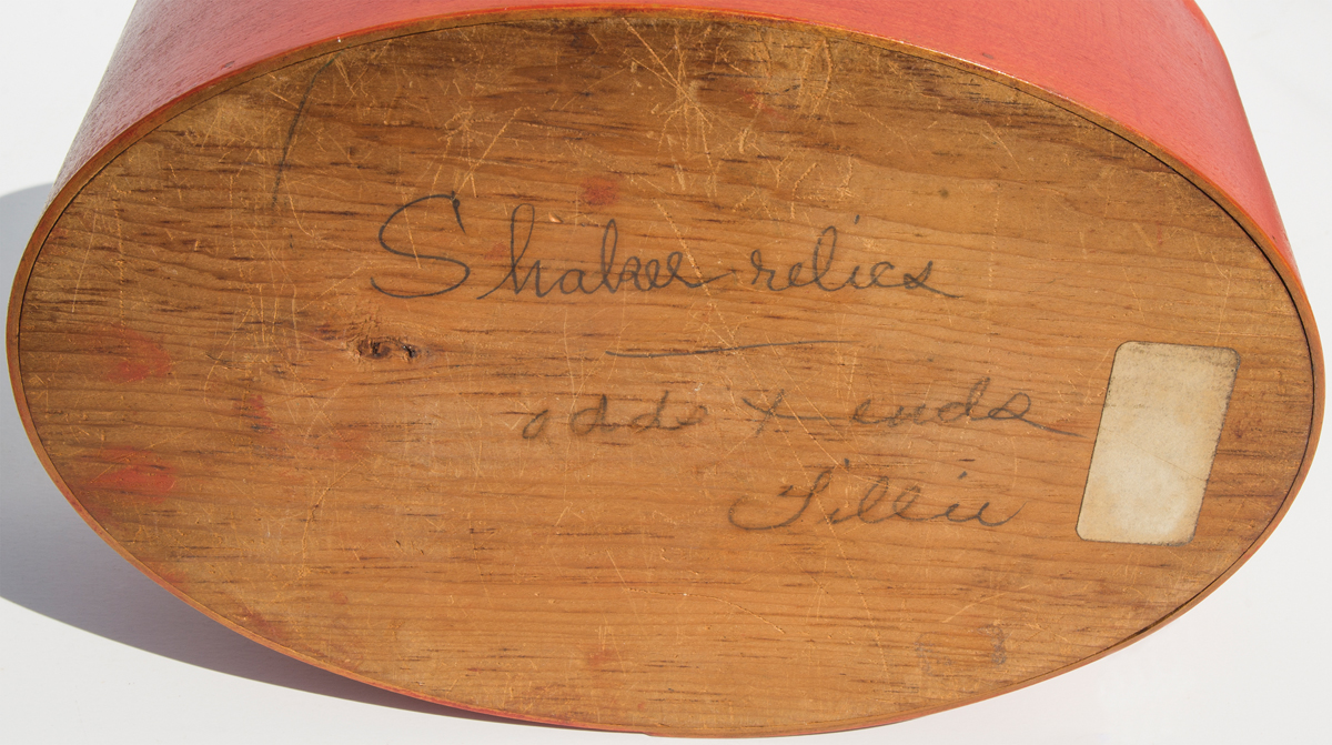 Maple and pine, original bright red painted finish, four fingers, copper tacks and paints, signed on bottom in pencil “Shaker relics, odds & ends, Tillie”, 4 1/4″ h, 10 1/8″ l.