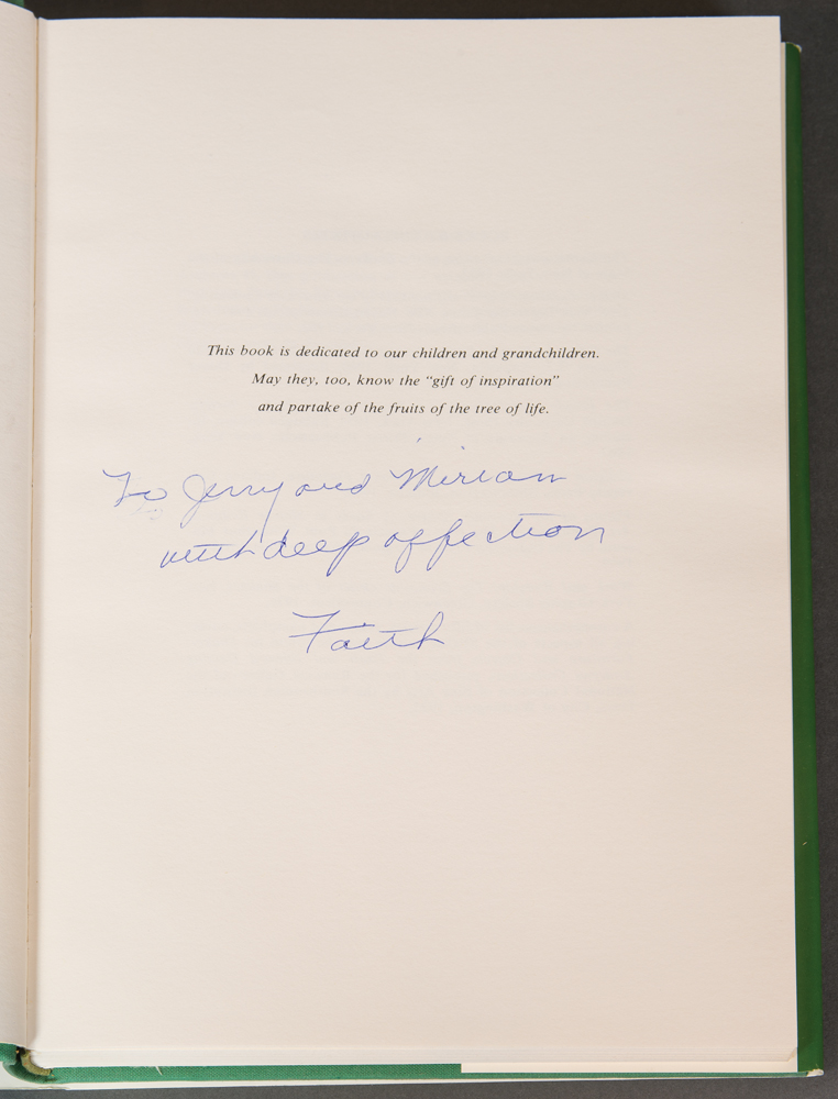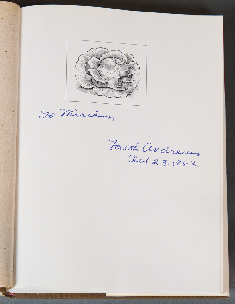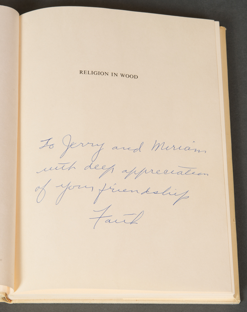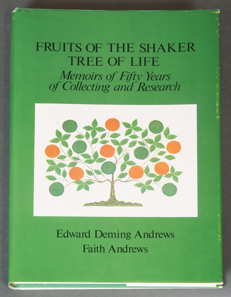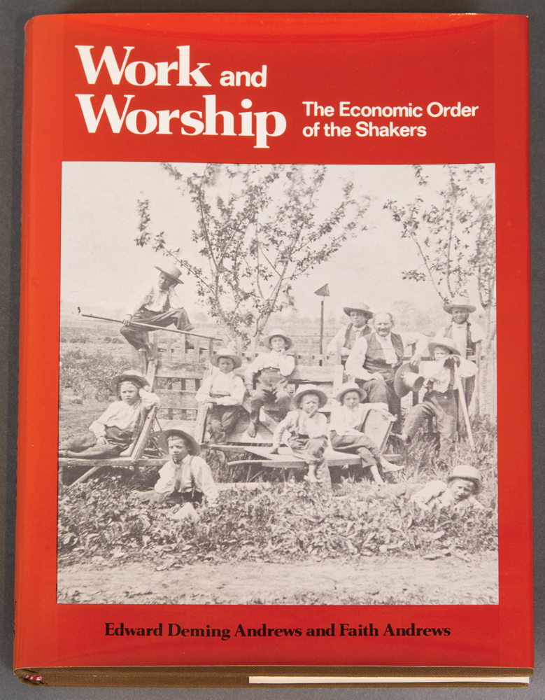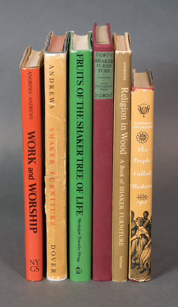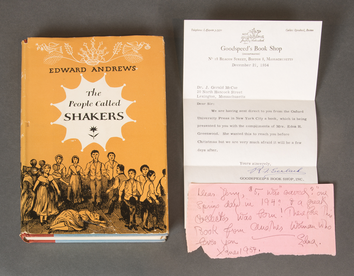 Collection of books by Edward Deming and Faith Andrews, from the library of Drs. Miriam and J.J.G. McCue, includes The People Called Shakers with a Christmas note inside from Edna Greenwood, also typed letter to Jerry from Goodspeed’s Bookshop dated December 21, 1954; Work and Worship: The Economic Order of the Shakers, inscribed “To Miriam, Faith Andrews Oct. 23, 1982”, and a letter from Faith to Jerry dated Dec. 29, 1974; Fruits of the Shaker Tree of Life, inscribed “To Jerry and Miriam with deep affection, Faith”, and a letter from Faith dated July 10, 1977; Religion in Wood: A Book of Shaker Furniture, with letter from Museum of Fine Arts, two pages of notes by Jerry, letter from Faith, receipt, Christmas card, newspaper article; Shaker Furniture, 1st Ed., inscribed “To Jerry and Miriam McCue, In appreciation of your interest and with our very best wishes — Edward D. Andrews, Faith Andrews, July, 1954”; Shaker Furniture: The Craftsmanship of an American Communal Sect, with note from Faith and Ted, Christmas 1963, two pamphlets, and handwritten letter from Faith dated Aug. 31, 1964.