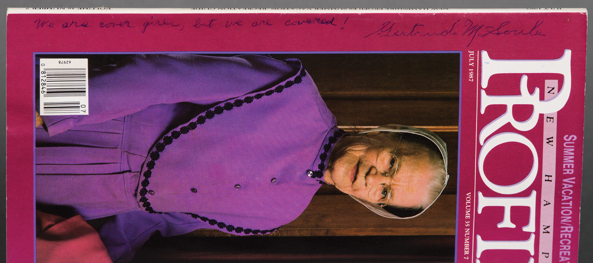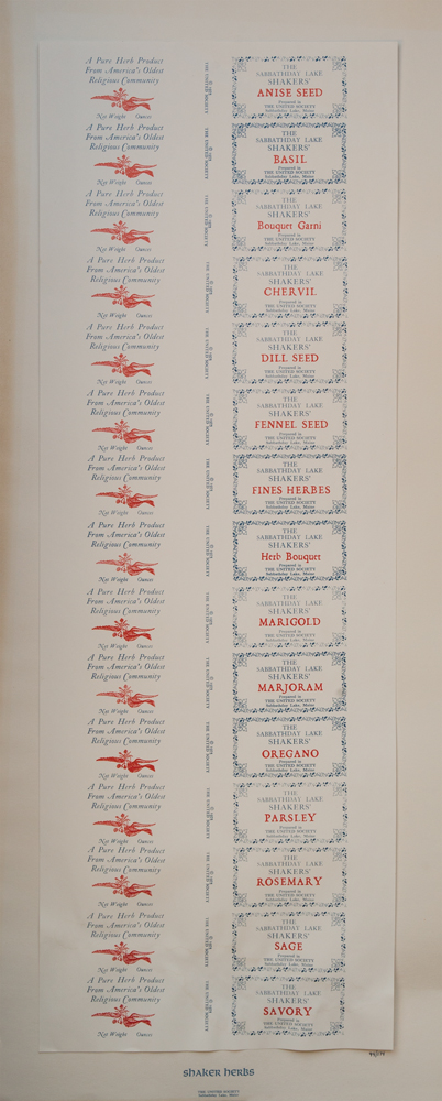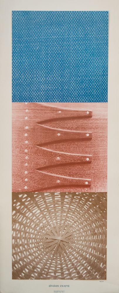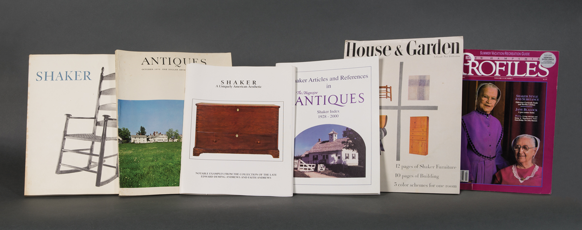 From the library of Drs. Miriam and J.J.G. McCue, includes two Shaker Your Plate: Of Shaker Cooks and Cooking by Sister Frances A. Carr, one with inscription “For the McCues — with happy memories of the many times we have ‘Shaker bread’ together. Sister Frances”; the New Hampshire Profiles magazine, July 1987, showing Gertrude Soule and Bertha Lindsay, inscribed “We are cover girls but we are covered. Gertrude M. Soule”; booklet “Shaker A Uniquely American Aesthetic”; booklet “Shaker Index 1928-2000, The Magazine Antiques”; several booklets sponsored by Smith College Museum of Art 1960-61; booklet “Documented Furniture: An Introduction to the Collections by Jean M. Burks, Canterbury Shaker Village”; “Antiques” magazine, Oct. 1970, with several Shaker articles; “House & Garden” booklet on Shaker furniture, March 1945; two copies of “Shaker: Furniture & Objects from the Faith and Edward Deming Andrews Collections”, pub. for Renwick Gallery, Smithsonian Institution Press, 1973; pamphlet “Consecrated Ingenuity: The Shakers and Their Inventions” by John S. Williams; “A Shaker Sampler” coloring book, pub. by The United Society of Shakers, Sabbathday Lake, ME, 1990; and a collection of 20th c. posters including Herb seed labels, Sabbathday Lake (93 and 94 of 174), Shaker Broom Corn signed by Sister Mildred R. Barker, Shaker Crafts (93 and 94 of 174), Shaker Meeting House, 1794 (93 and 94 of 174), etc.