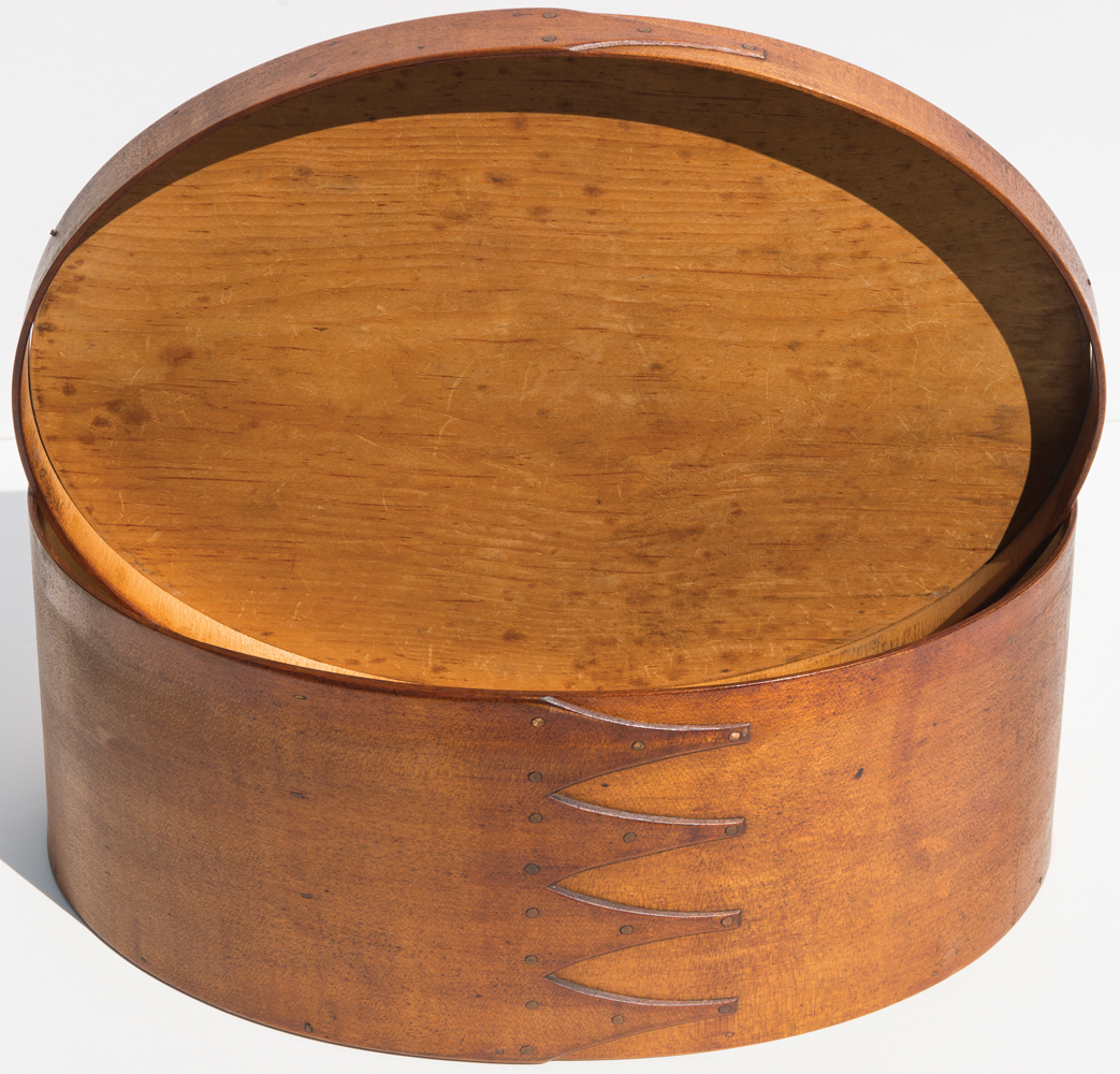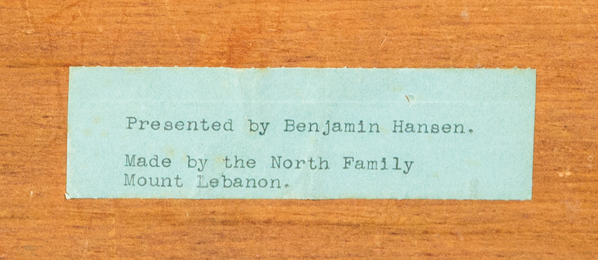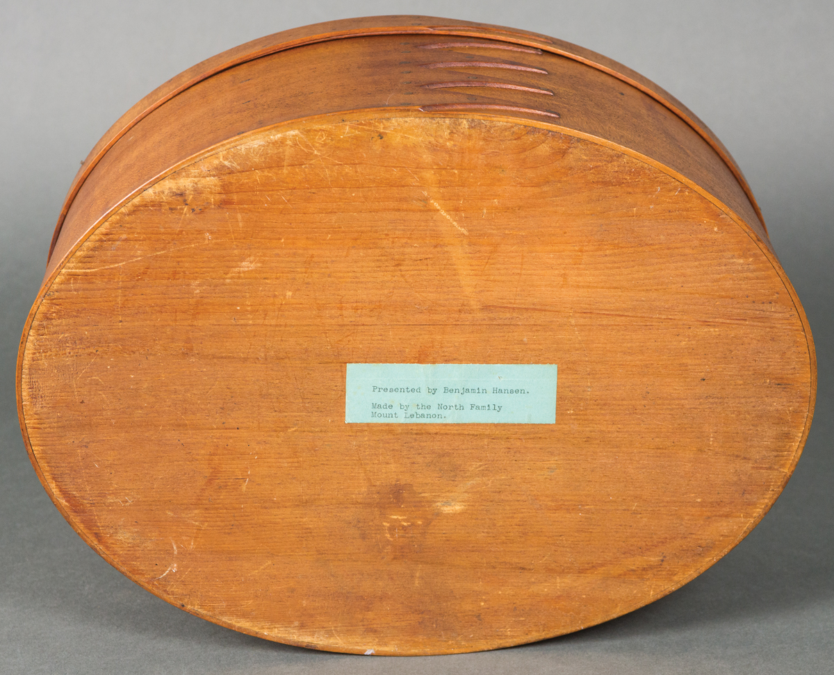 Maple and pine, original brown stained finish, five fingers high (including lid), blue tag on bottom “Presented by Benjamin Hansen, made by the North Family, Mount Lebanon”, excellent condition, 6 3/8″ h, 14 7/8″ l, 11 1/8″ w.