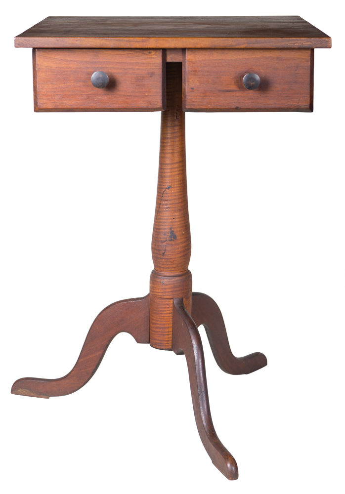 Cherry wood top and legs, butternut drawers, tiger maple shaft, outstanding original stained varnish finish, two drawers symmetrically nailed with beveled front edges, original turned brass pulls, exceptional turned tiger maple shaft, Enfield, CT, c. 1830-1840, exhibited at “The Shaker Gallery”, 2015-2016, New Britain Museum of American Art, New Britain, CT, (see p. 194 Complete Book of Shaker Furniture, Rieman and Burks), 24″ h, 16 1/2″ sq top, (ex. Ed Clerk collection).