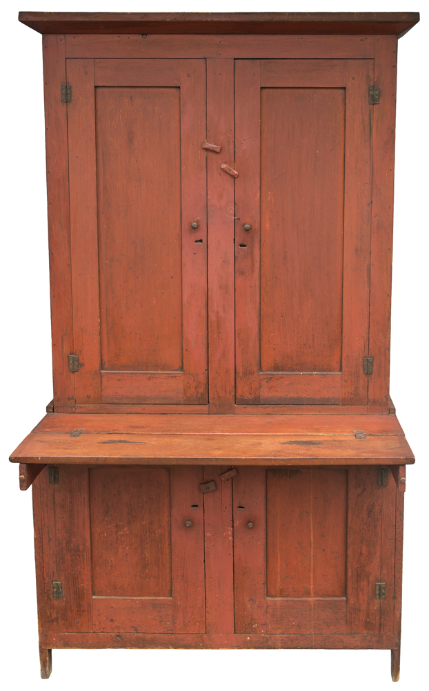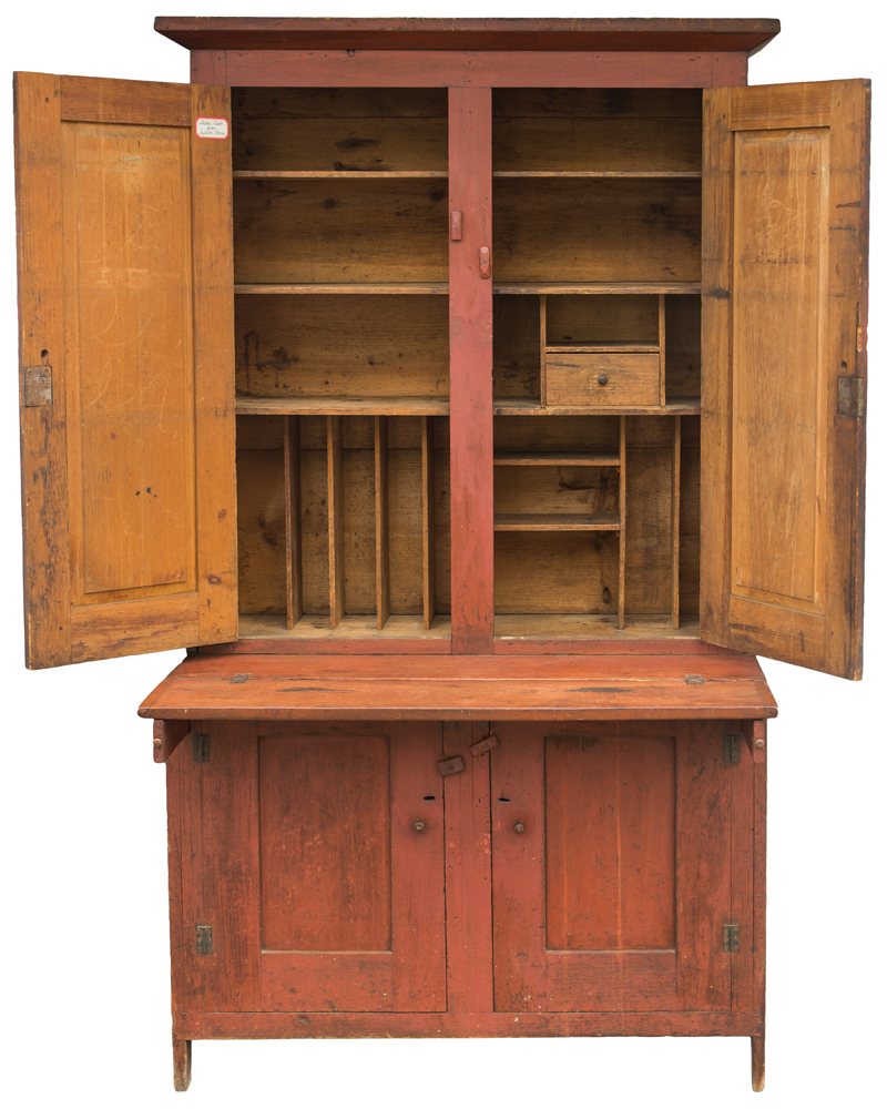 Pine, original red painted finish, single mitered/molded top over two inset panel doors, with single peg at top, and double pegged at bottom holding the mortise, three-shelf interior with single drawer, file holders and small shelves, fall front breadboard (7 1/2″ ), bottom case is dovetailed, with two pull out support slides, double door bottom with inset panels, pegged and through mortised, dovetailed at base, one peg at upper left side, two-shelf base, Enfield, CT, c. 1850, exhibited at “The Shaker Gallery”, 2015-2016, New Britain Museum of American Art, New Britain, CT, 72″ h, 40″ w, 18 1/2″ w, (ex. Ed Clerk collection).
