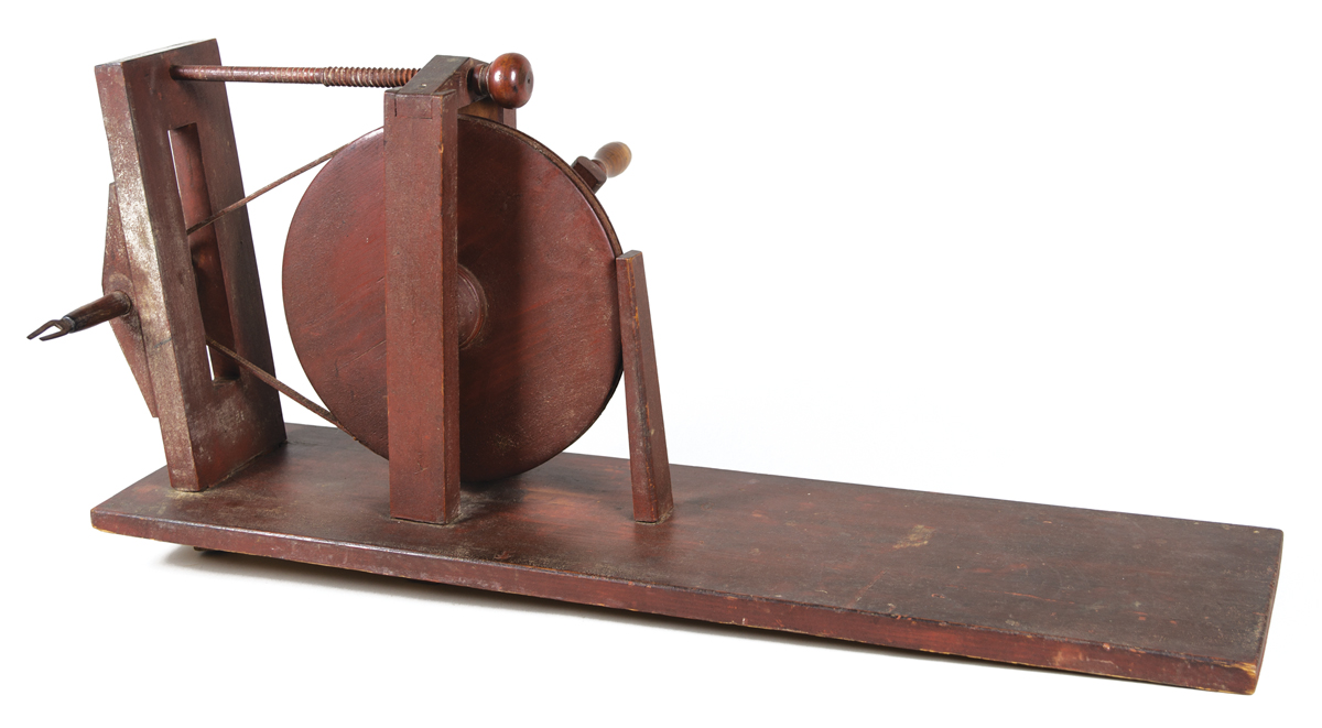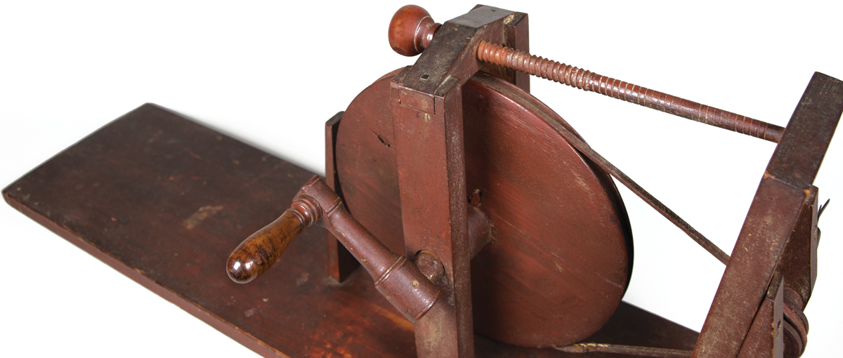 Maple and pine, original red painted finish, extended rectangular platform for sitting, wheel and pulley system for turning the apples, adjustable threaded belt tightener, tiger maple handle with patina, (note: exceptional construction and color), Canterbury or Enfield, NH, c. 1850, 13 1/2″ h, 32″ l, 9″ w.
