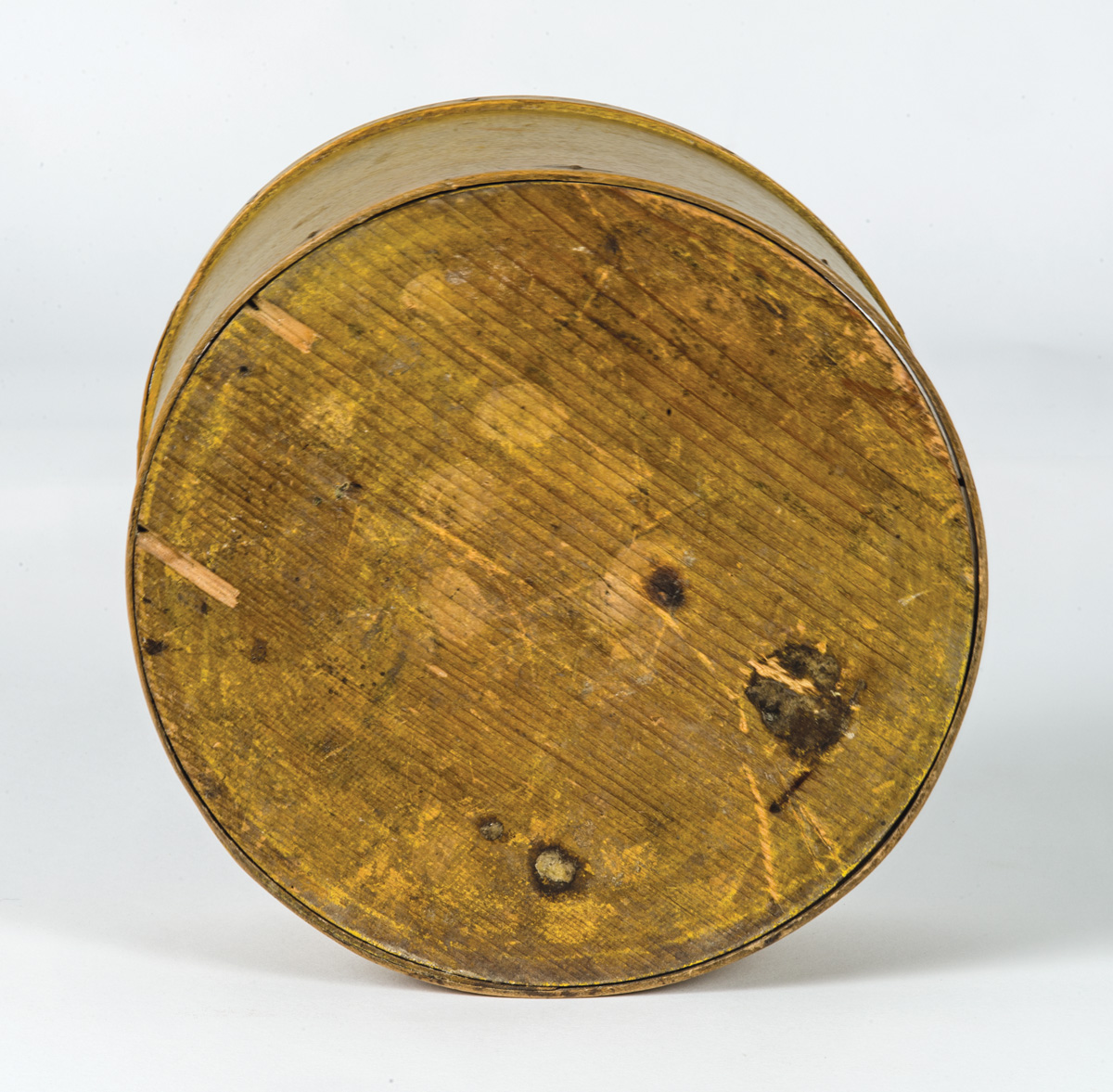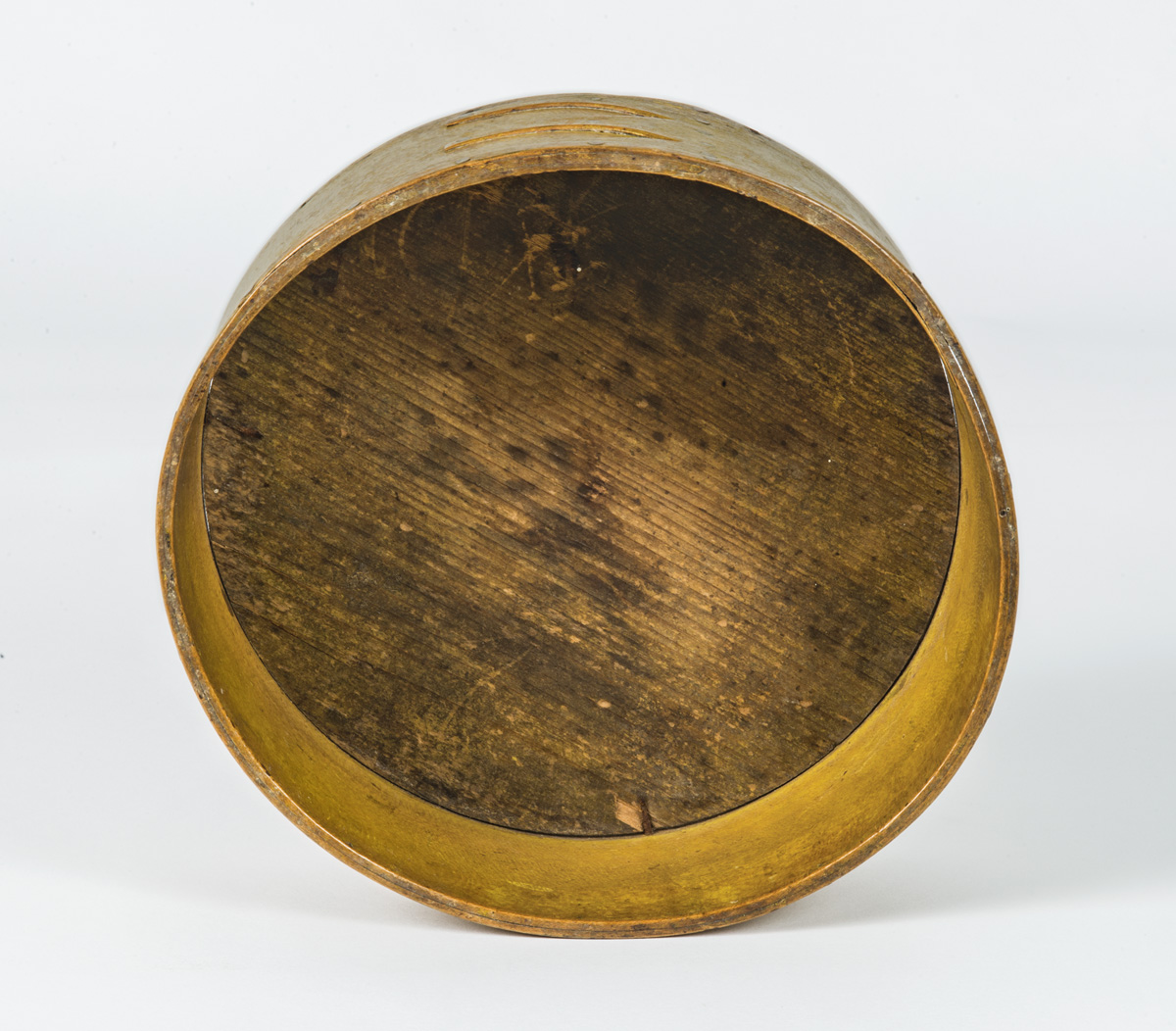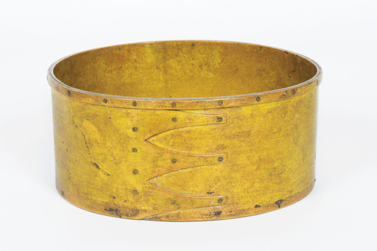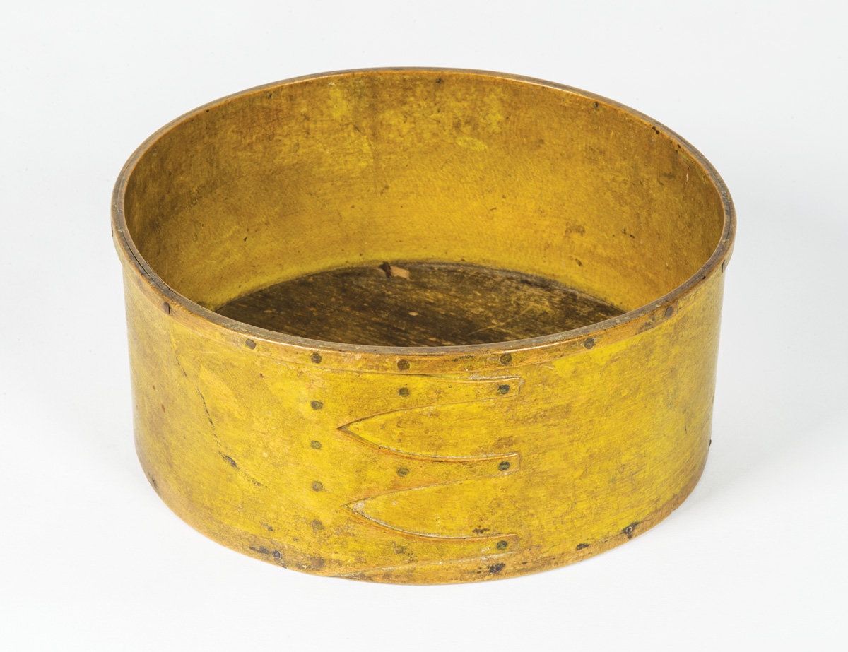 Maple and pine, original yellow painted finish, copper nailed reinforced rim, three fingers, Mt. Lebanon, NY, c. 1830-1840, 3 1/4″ h, 7 3/8″ dia.