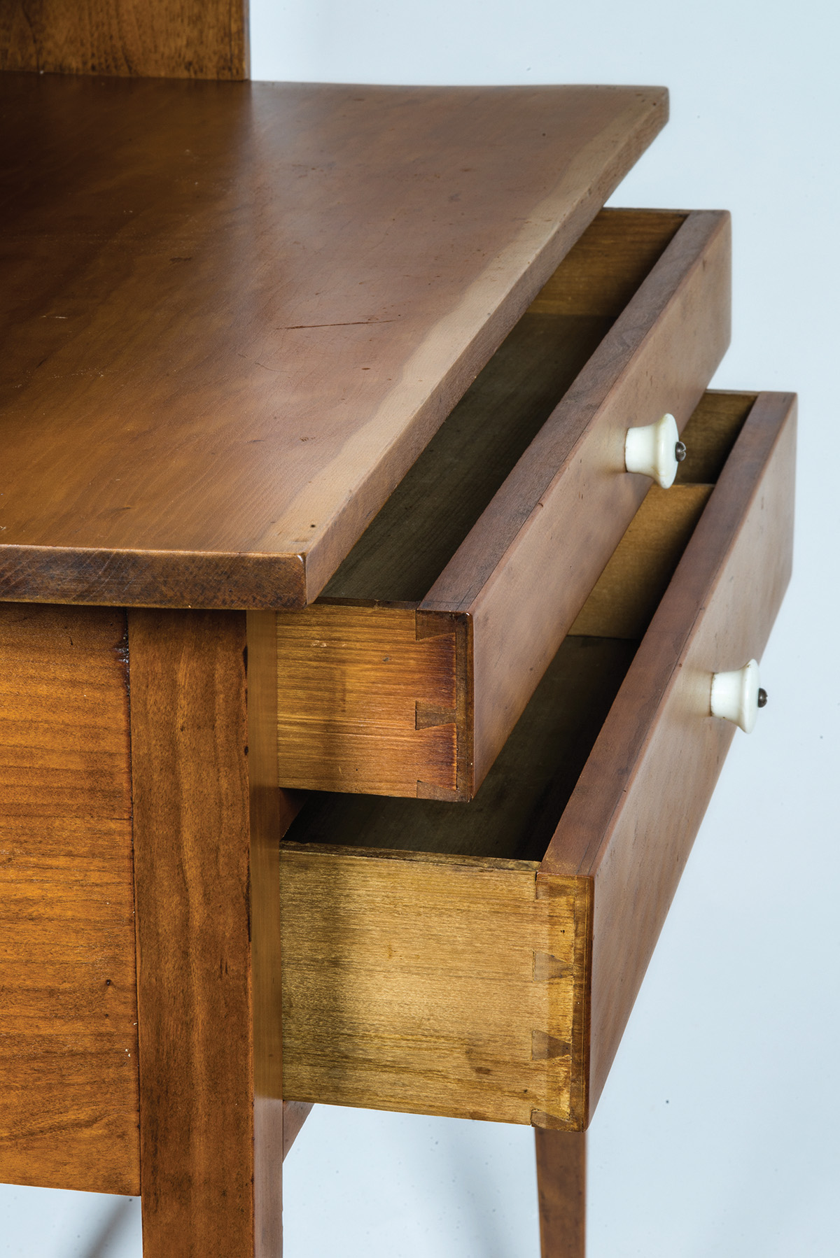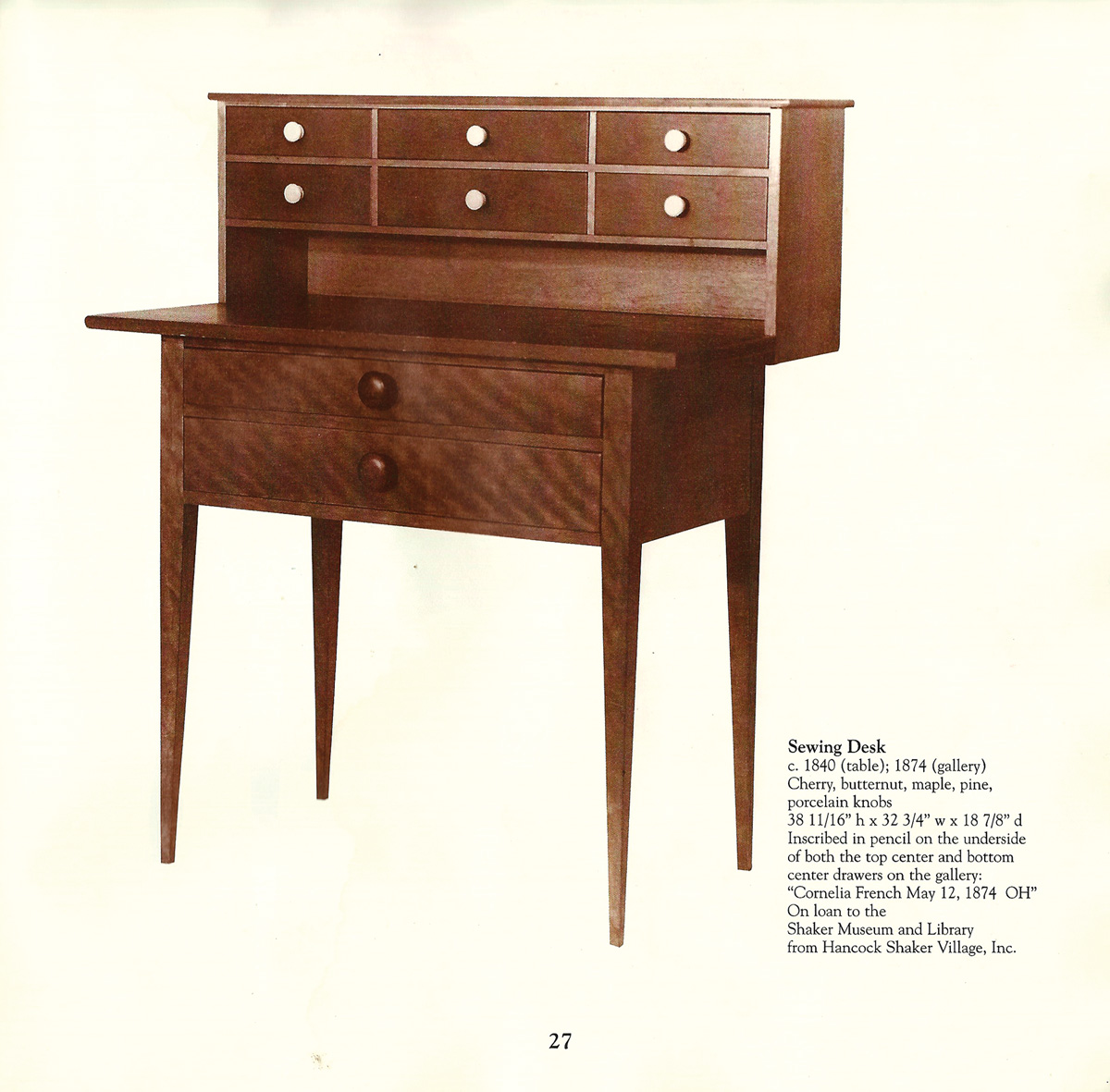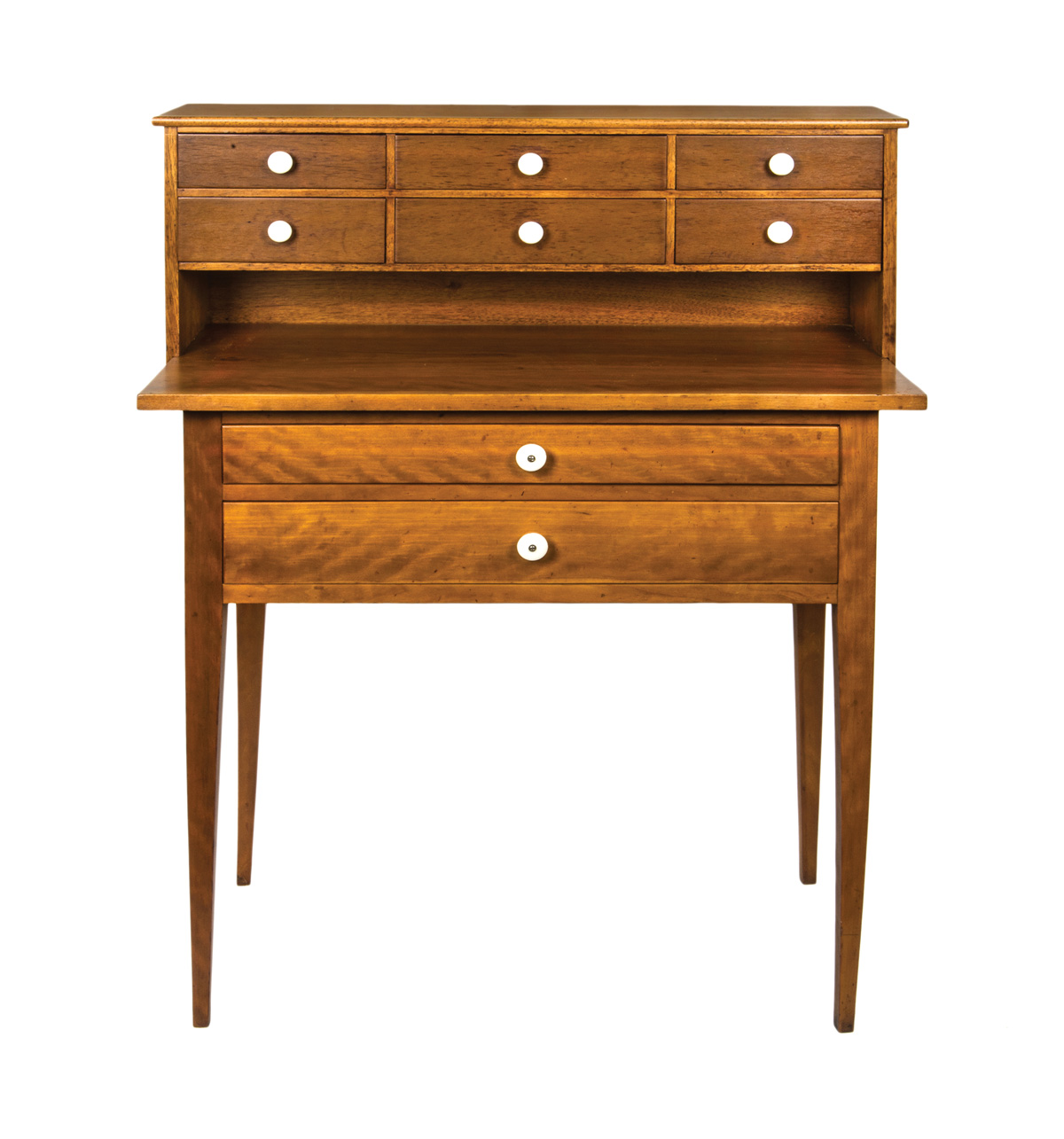Cherry, butternut, maple, and pine, porcelain pulls, six drawer top section (three over three), two full drawer bottom section with figured cherry drawer fronts, top center drawers are both inscribed in pencil on the bottom of each “Adoline Cantral May 12 1874 OH”, “No 3” and “No 4”, on square tapered legs, (note: this rare Orren Haskins signed piece is the mate to the sewing desk in the Hancock Shaker Museum collection, which is similarly signed “Cornelia French May 12 1874 OH”, except this desk is slightly more diminutive in size), 38 1/2″ h, 30 1/2″ w, 15 3/4″ d.