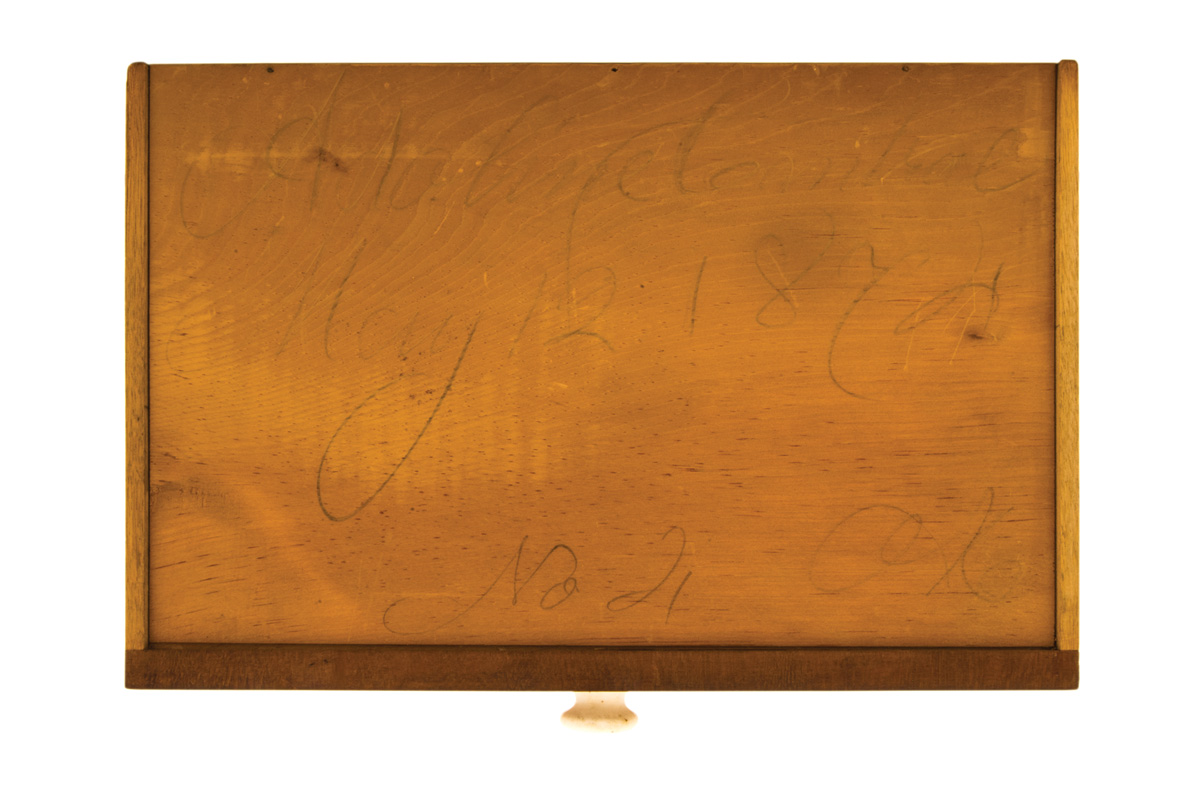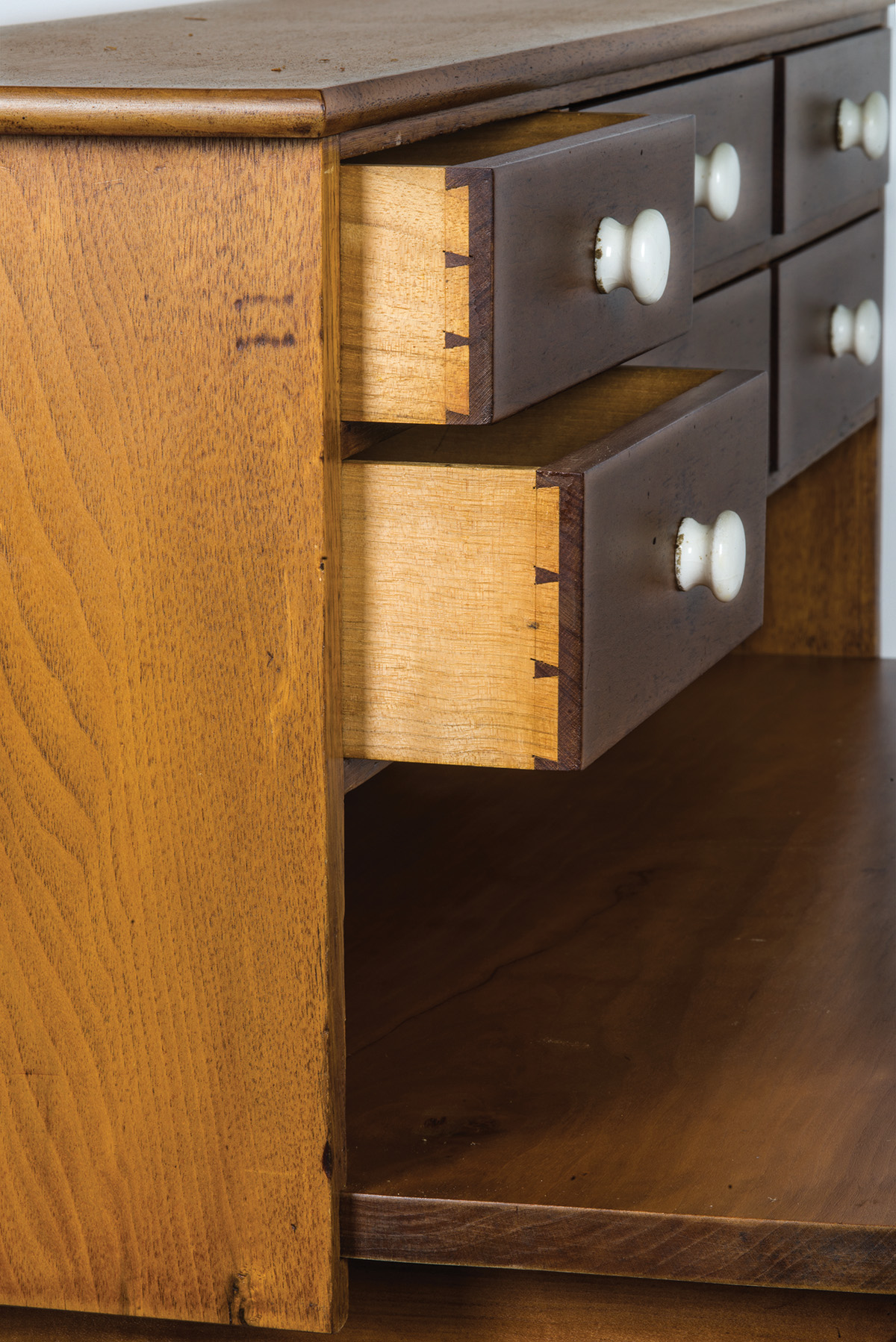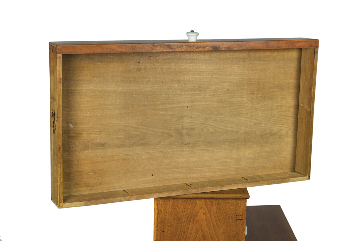 Cherry, butternut, maple, and pine, porcelain pulls, six drawer top section (three over three), two full drawer bottom section with figured cherry drawer fronts, top center drawers are both inscribed in pencil on the bottom of each “Adoline Cantral May 12 1874 OH”, “No 3” and “No 4”, on square tapered legs, (note: this rare Orren Haskins signed piece is the mate to the sewing desk in the Hancock Shaker Museum collection, which is similarly signed “Cornelia French May 12 1874 OH”, except this desk is slightly more diminutive in size), 38 1/2″ h, 30 1/2″ w, 15 3/4″ d.