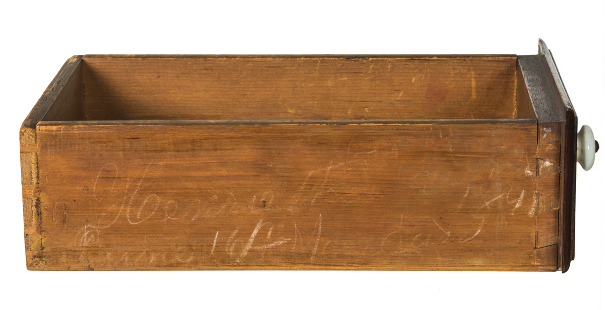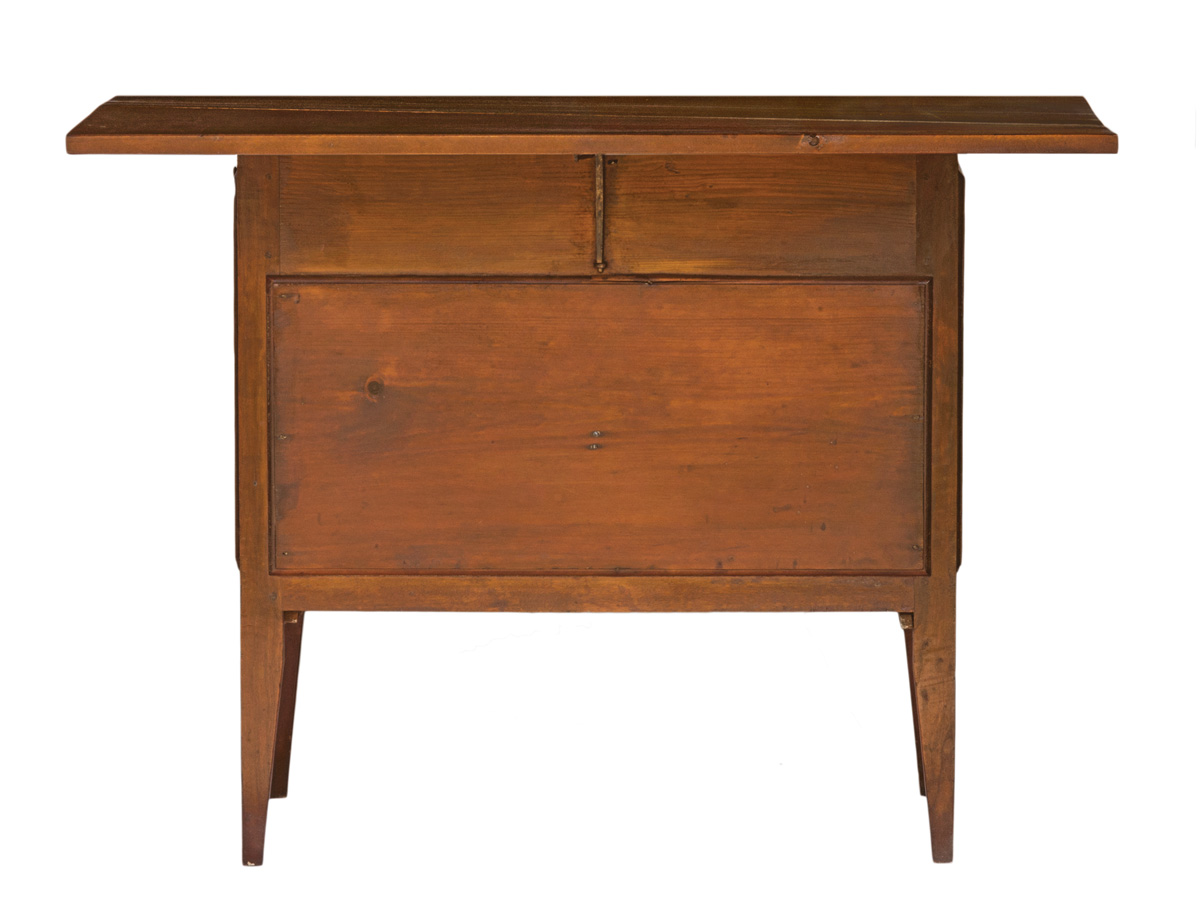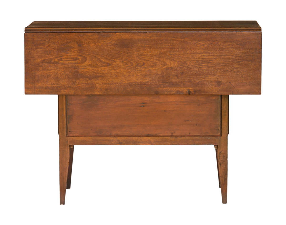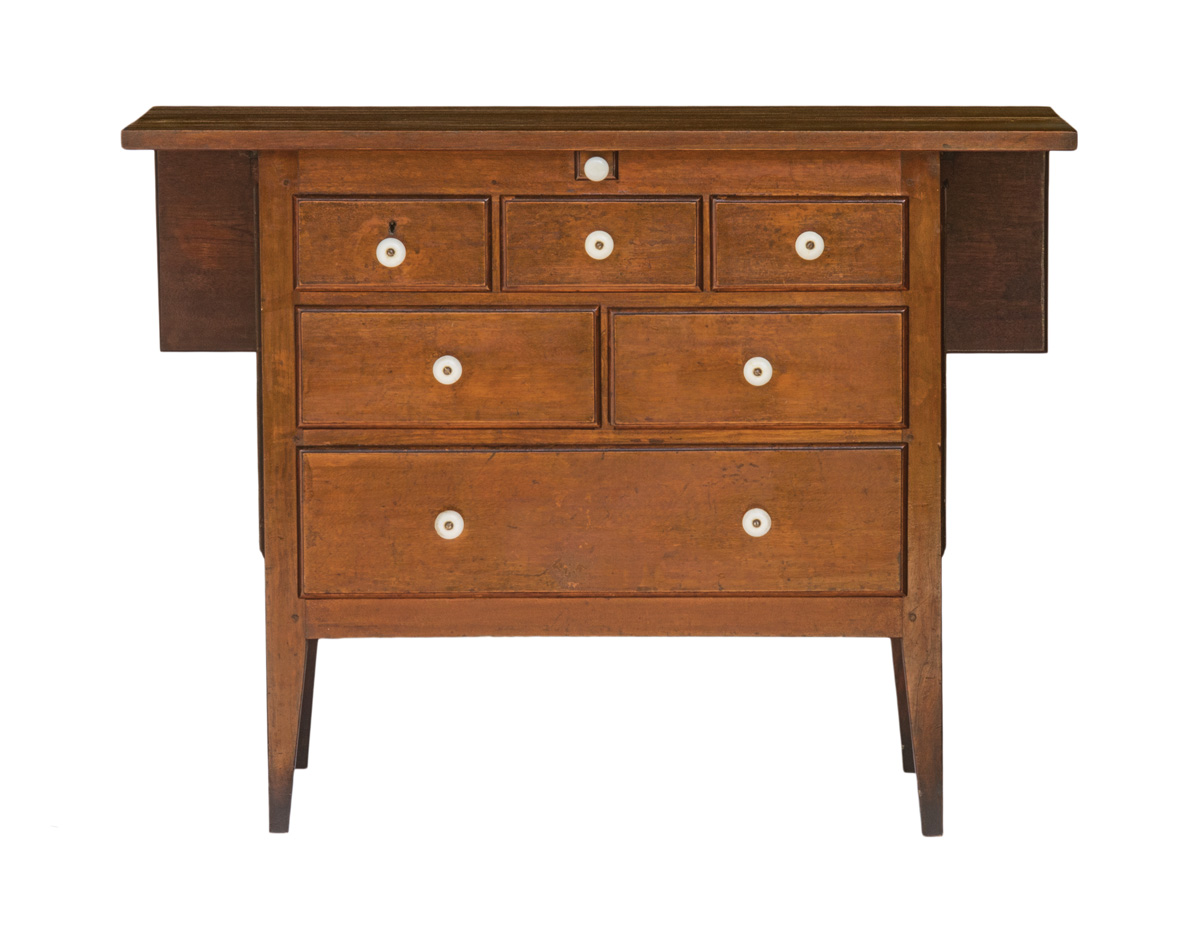 Cherry, original red/brown varnish stained finish, three flanking drawers across the top, over two flanking drawers, over a larger single drawer on bottom, finely dovetailed drawers, each with lipped, raised and molded edge, all with white porcelain pulls, hinged drop leaf on back with a rare Shaker made cast iron leaf support, raised and molded panel edges on sides and back, canted and tapered feet (9″ h), (note: a small 1″ wide slide above the drawers with porcelain pull, possibly used to hold individual threads or small sewing implements), Hancock, MA, c. 1840-1850, 27″ h (case), 25 1/2″ w (case), 35 1/2″ w, 9″ w (leaf), 14 1/2″ w (top). [Left hand drawer with lock plate, right hand drawer signed in chalk on the exterior left side “Henrietta Morgan, June 16.” Henrietta lived at East Family, Hancock, and left in 1903. Sold WHA, Cover lot, #80, June 30, 1984. Attributed to Hancock cabinetmaker Elder Grove Wright (1789-1861).]
