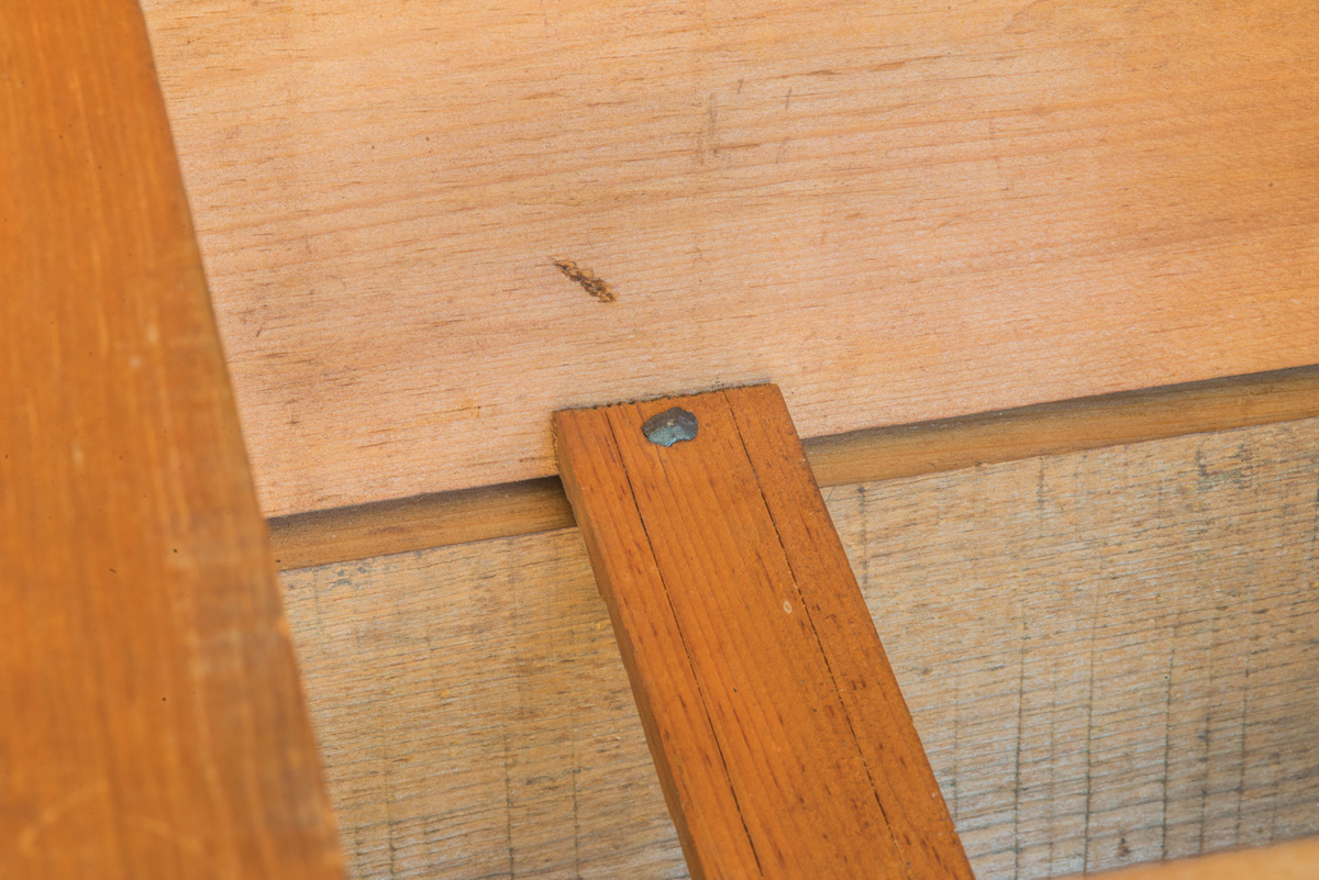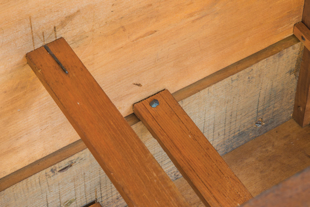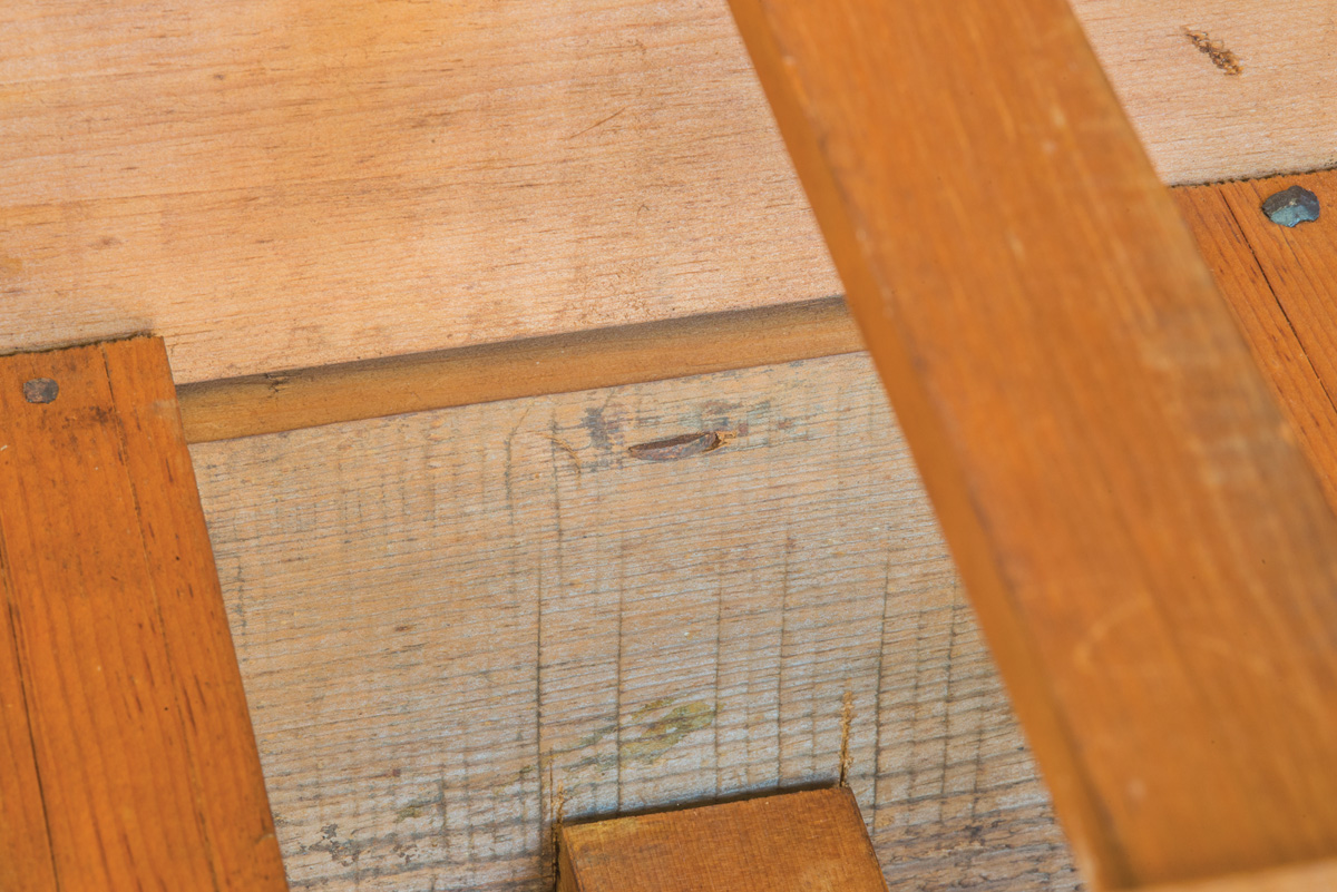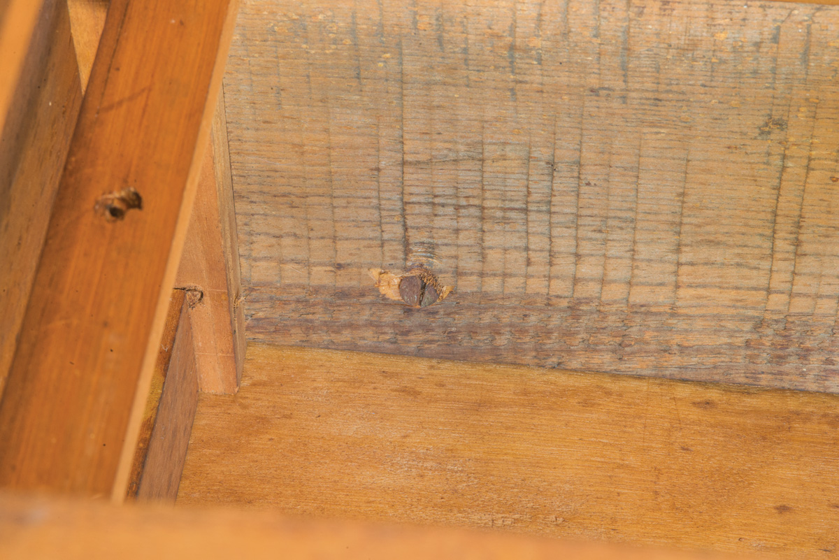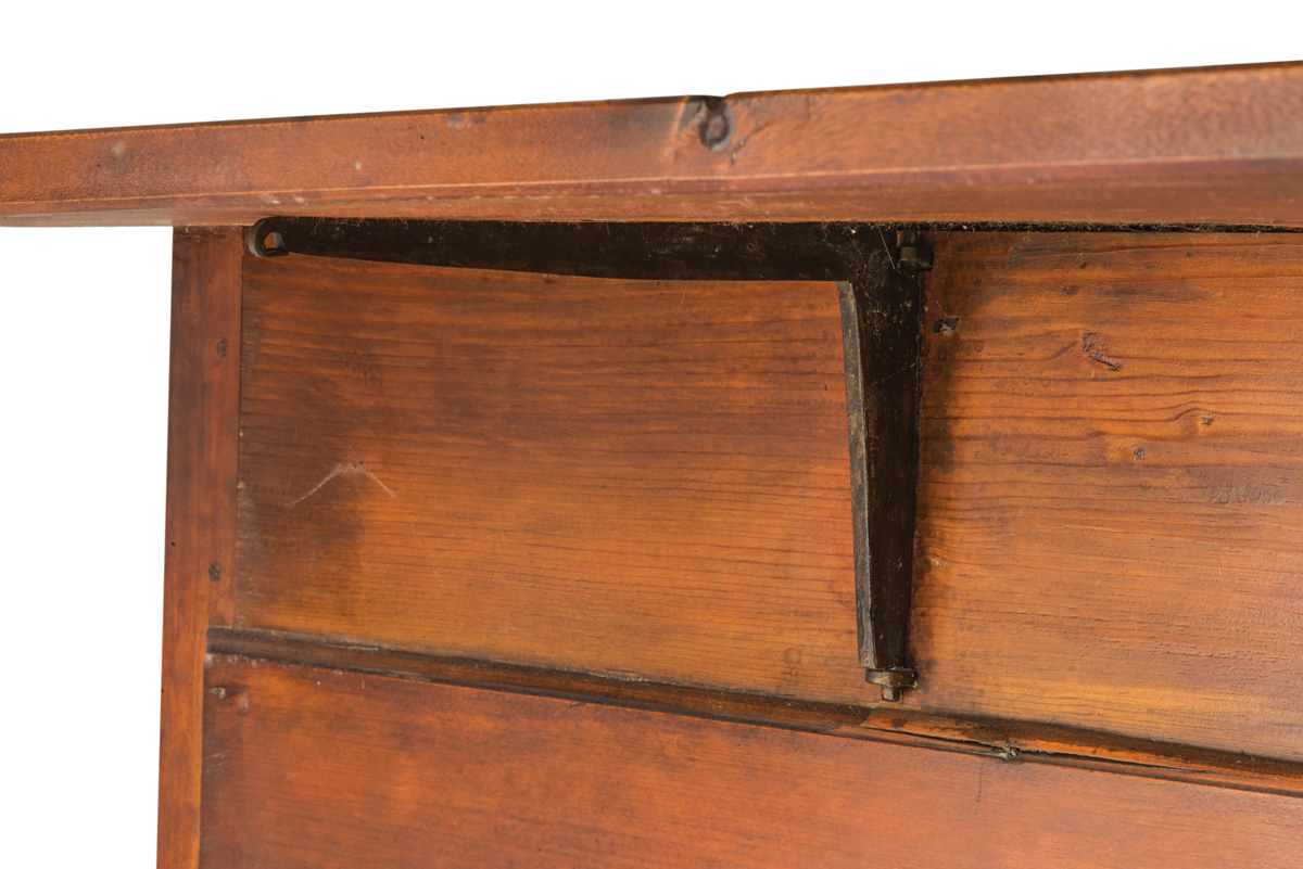 Cherry, original red/brown varnish stained finish, three flanking drawers across the top, over two flanking drawers, over a larger single drawer on bottom, finely dovetailed drawers, each with lipped, raised and molded edge, all with white porcelain pulls, hinged drop leaf on back with a rare Shaker made cast iron leaf support, raised and molded panel edges on sides and back, canted and tapered feet (9″ h), (note: a small 1″ wide slide above the drawers with porcelain pull, possibly used to hold individual threads or small sewing implements), Hancock, MA, c. 1840-1850, 27″ h (case), 25 1/2″ w (case), 35 1/2″ w, 9″ w (leaf), 14 1/2″ w (top). [Left hand drawer with lock plate, right hand drawer signed in chalk on the exterior left side “Henrietta Morgan, June 16.” Henrietta lived at East Family, Hancock, and left in 1903. Sold WHA, Cover lot, #80, June 30, 1984. Attributed to Hancock cabinetmaker Elder Grove Wright (1789-1861).]