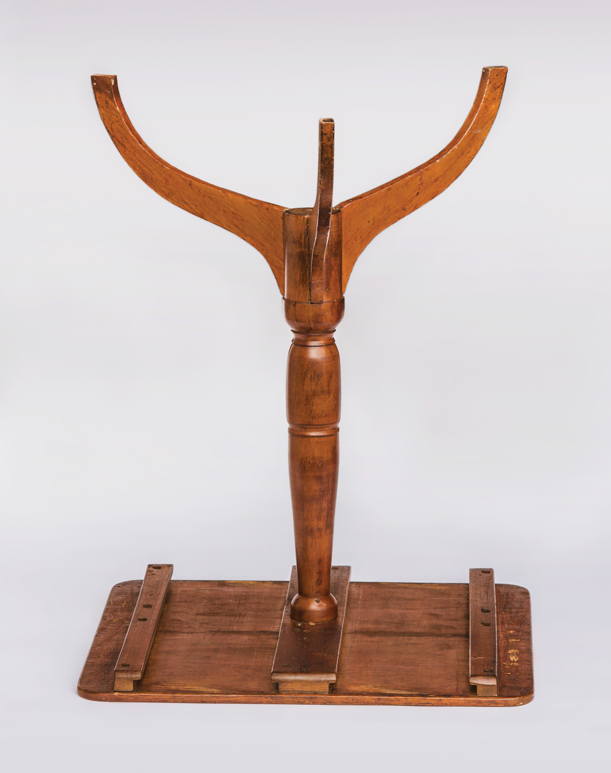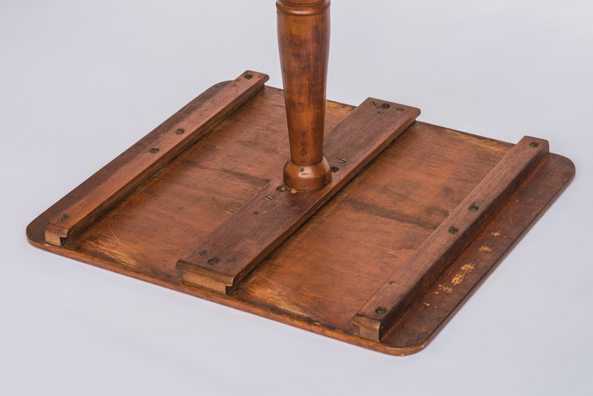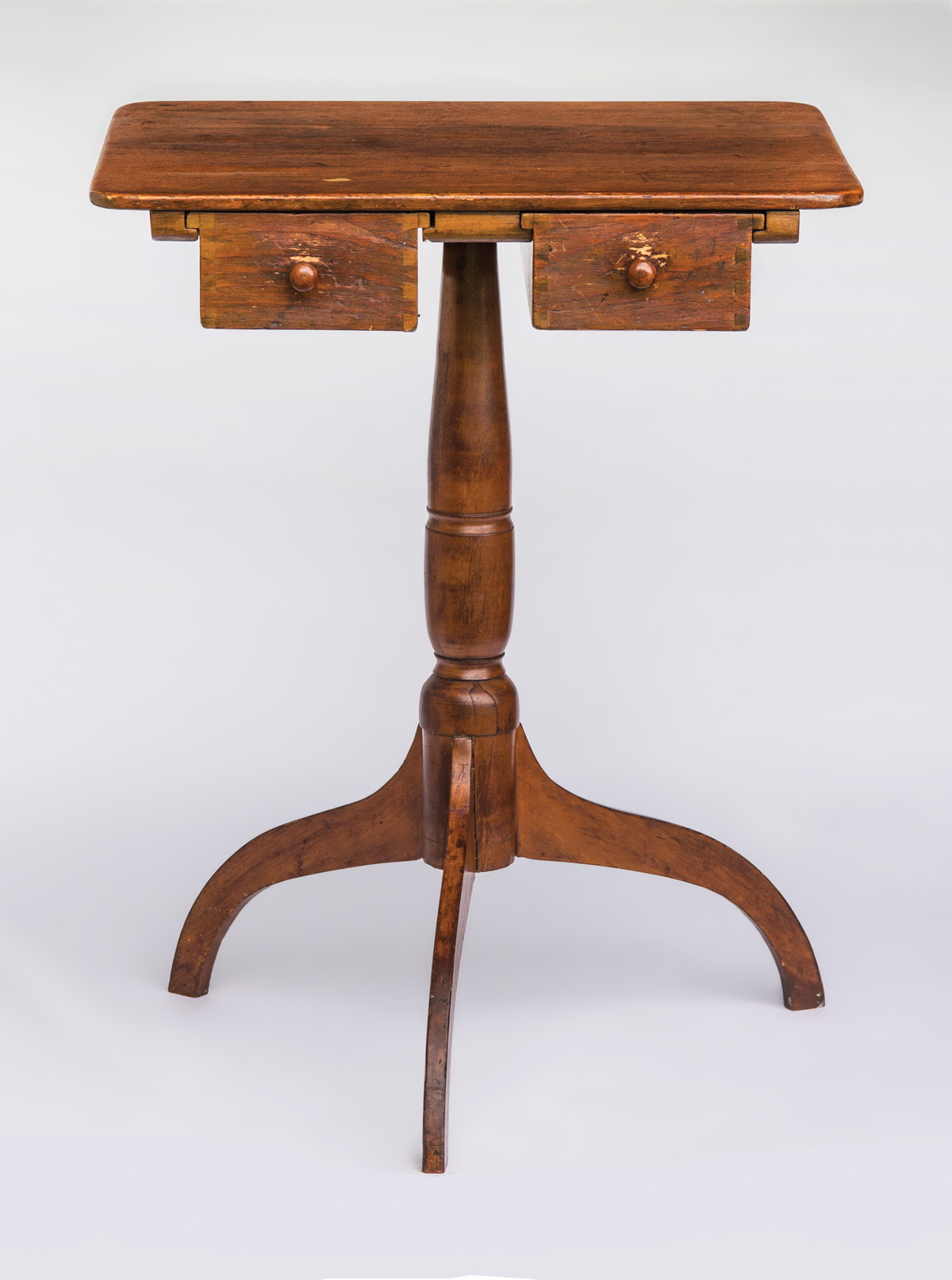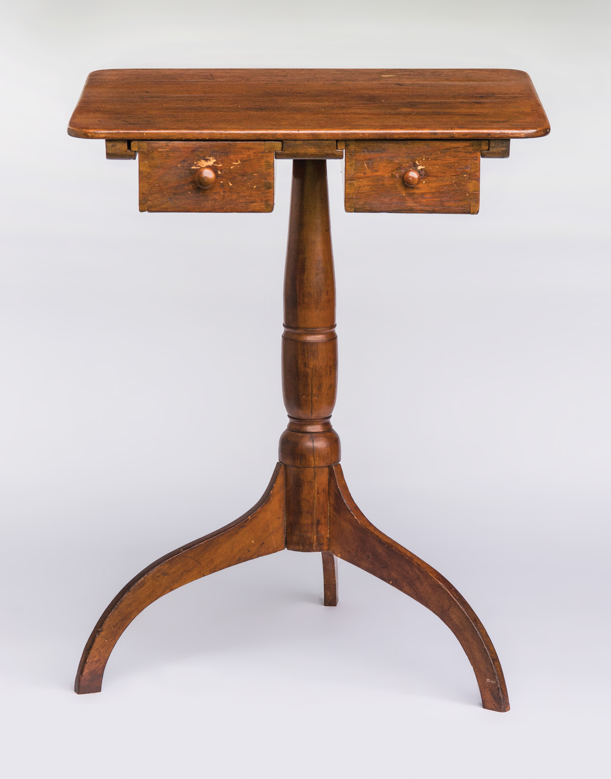 Birch, pine and cherry, old natural finish, square top with rounded corners, over two dovetailed drawers, each with delicate turned pulls on both sides, (note: two Sister’s could access the drawers from either end), finely turned cherry shaft with arched tripod legs, Hancock Bishopric, c. 1840, 25″ h, 19 1/4″ w, 17 1/2″ d, (ex. Brecht collection; ex. WHA 5/29/11).