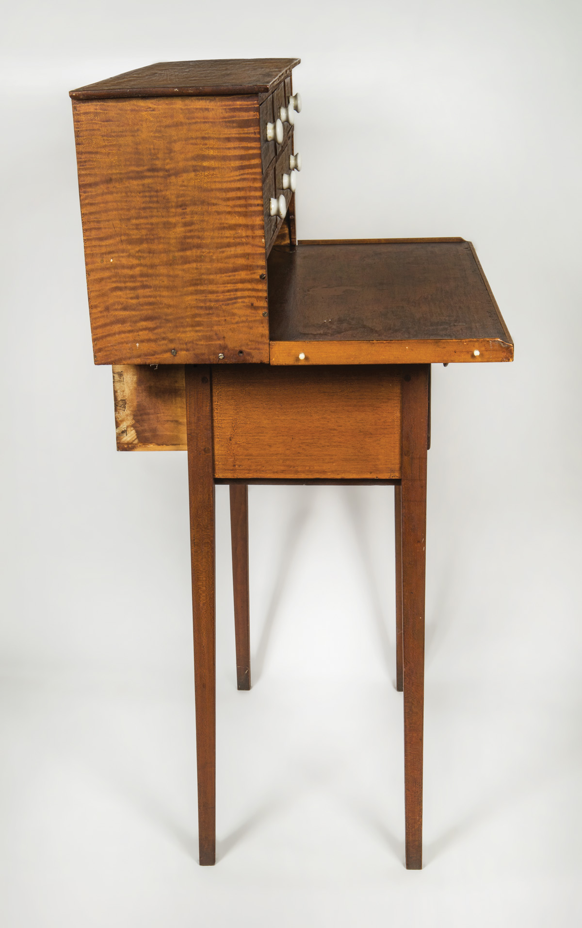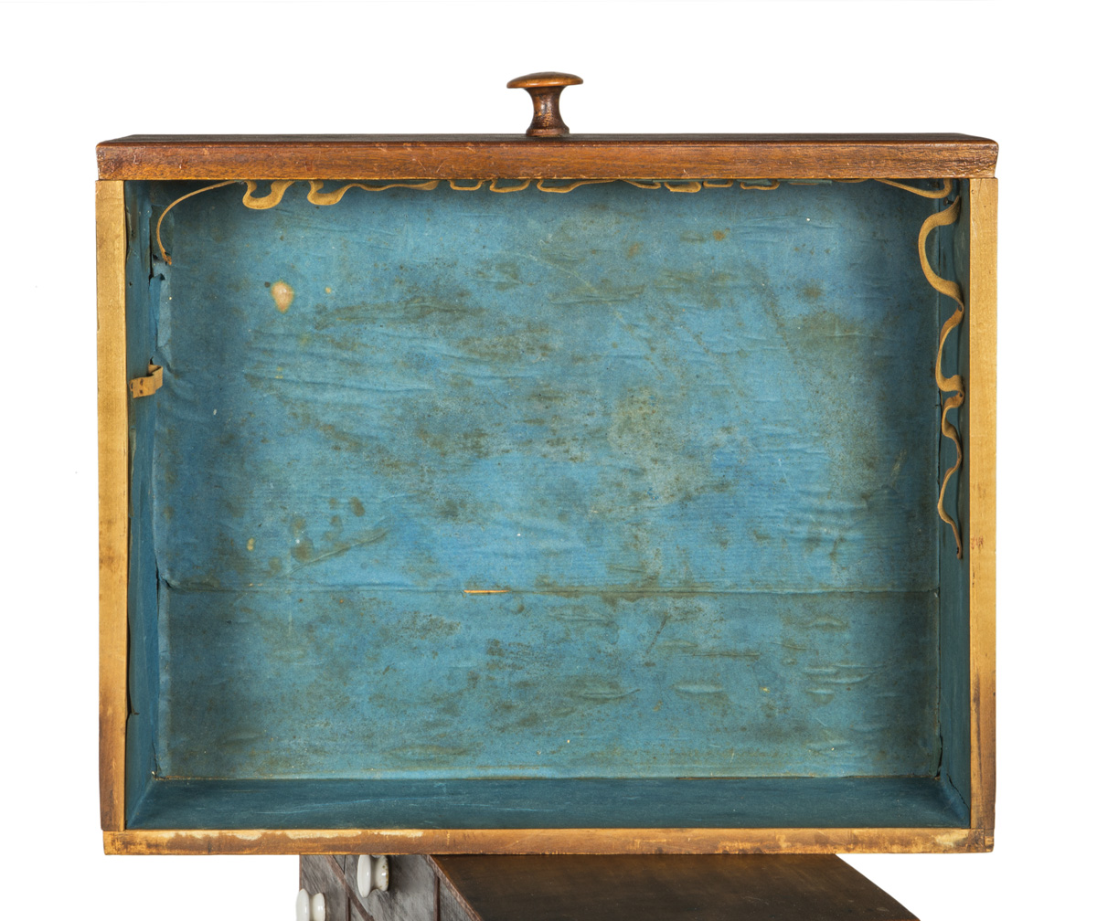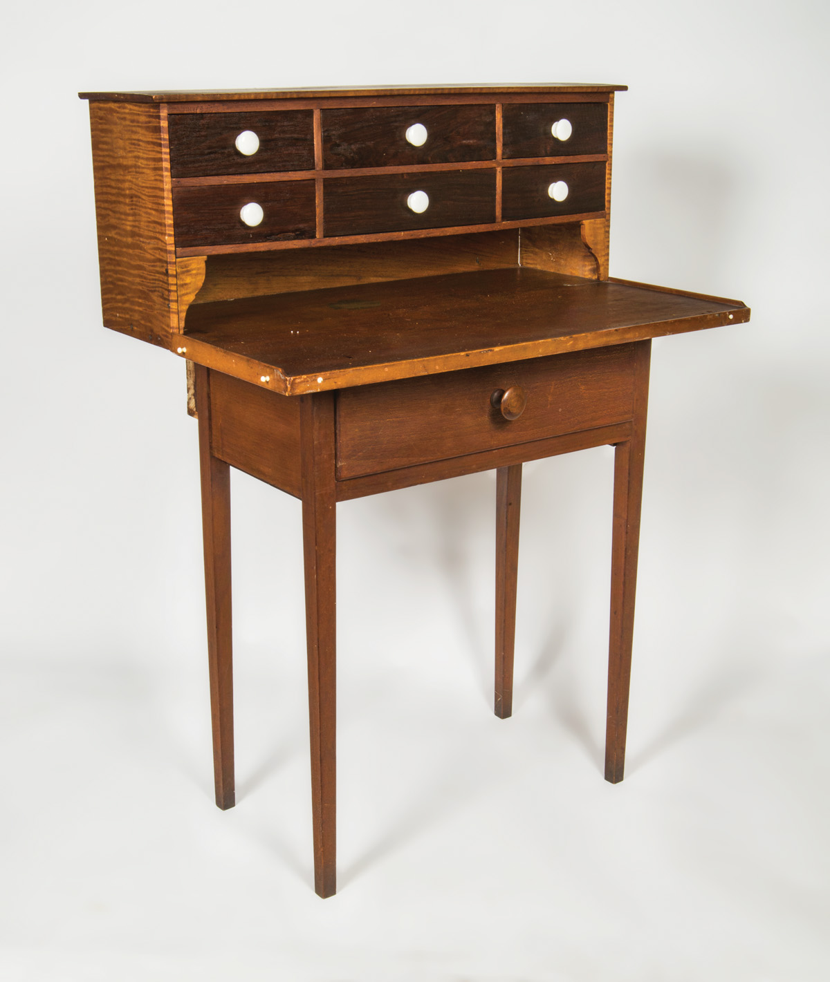 Butternut, poplar and tiger maple, original red stained finish, tiger maple cased six-drawer add-on top with white porcelain pulls, over a raised gallery top with tiny white porcelain hangers around the edge, single dovetailed drawer with finely turned cherry pull, on tapered square legs, two splits on top of table, small missing piece of veneer on left bottom drawer front, New Lebanon, NY, c. 1840, (add-on top c. 1870-1880), 37 1/2″ h, 27″ w, 17 1/2″ d, (ex. James Brown collection, Lee, MA).