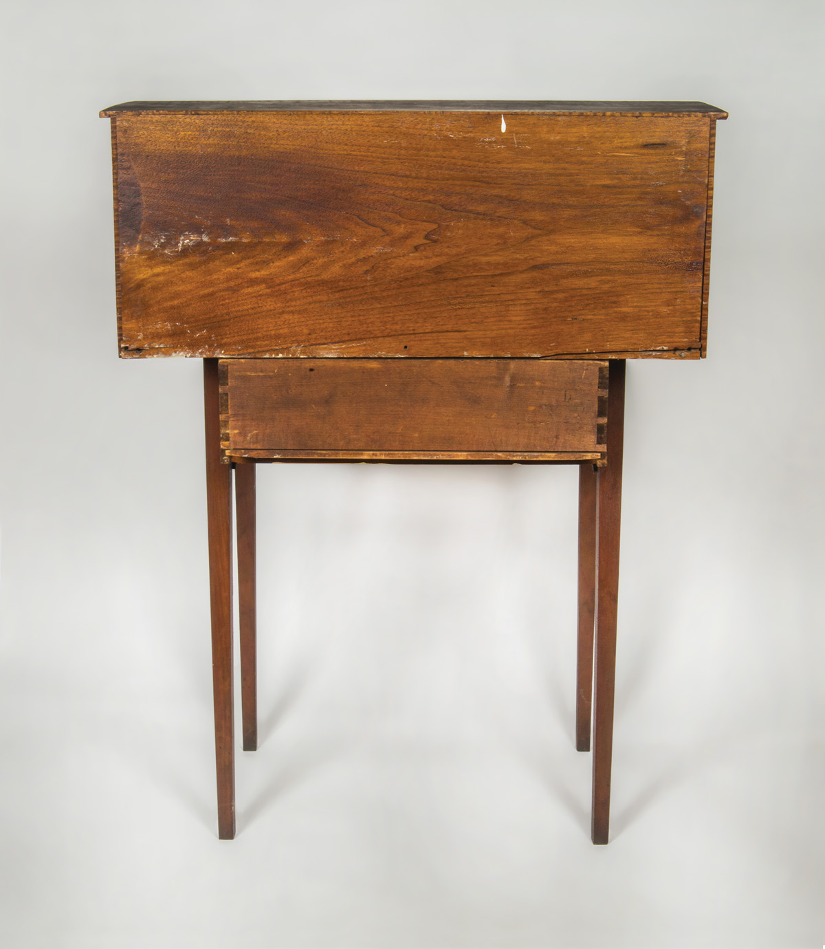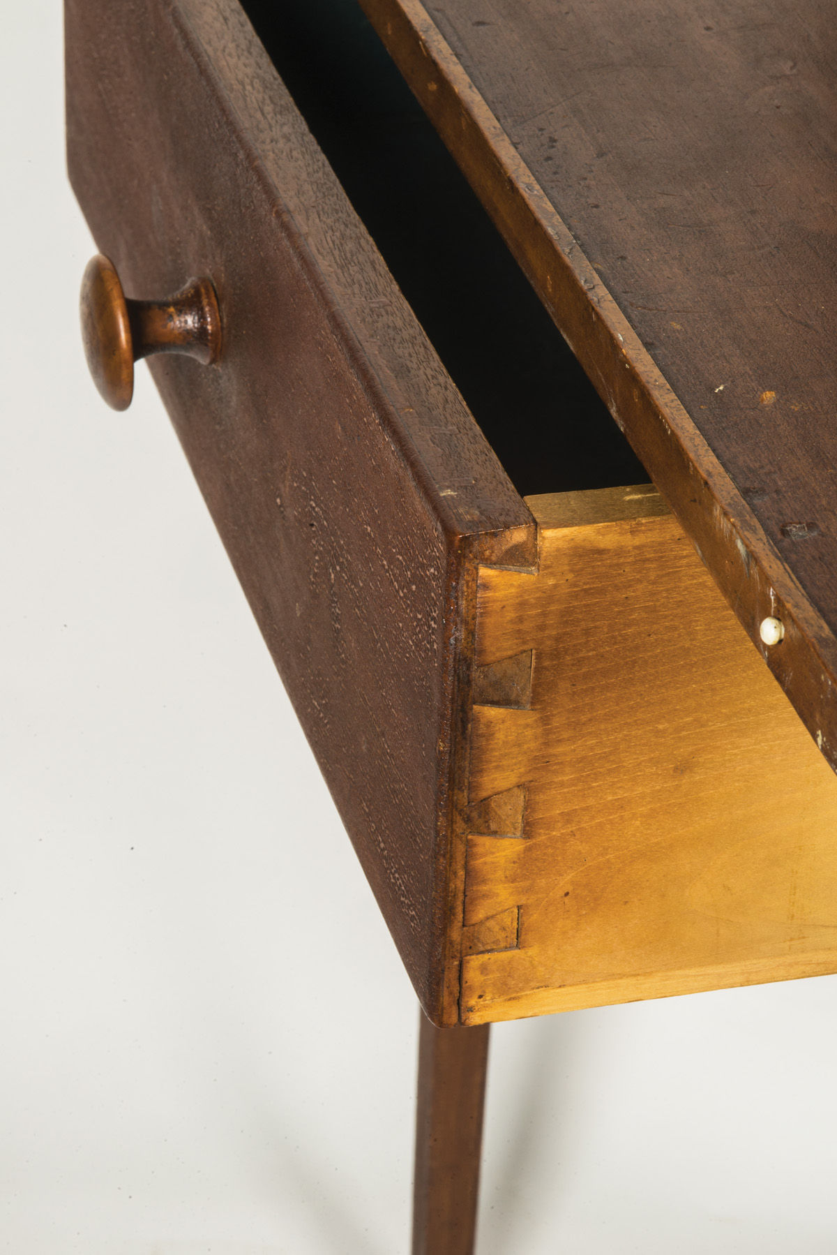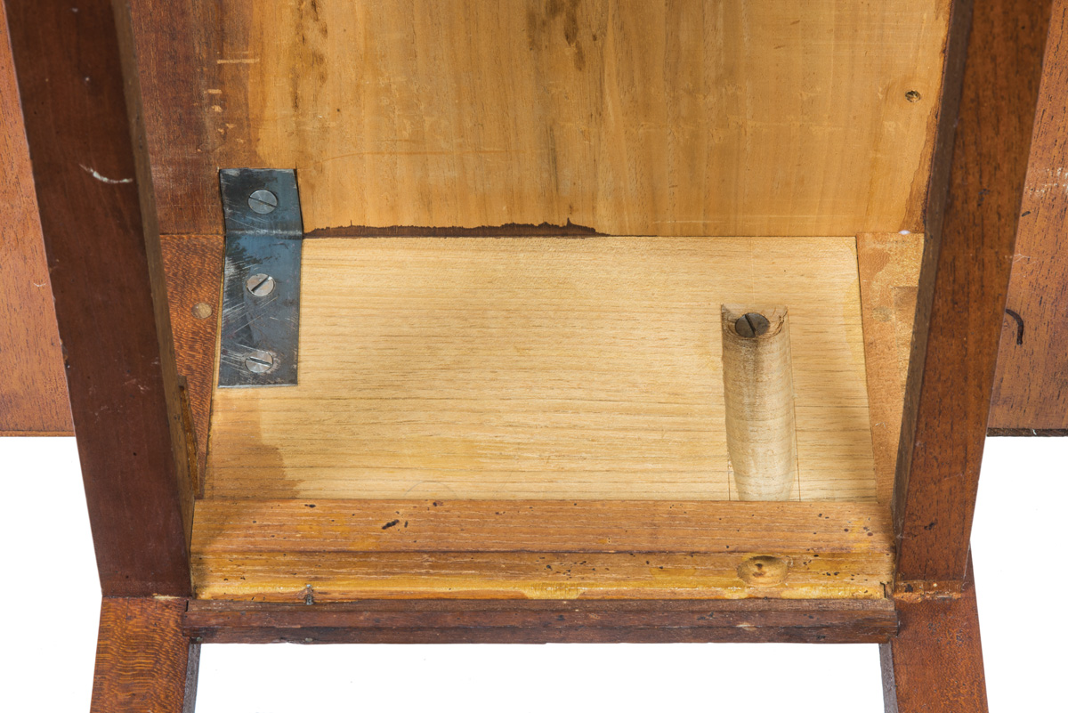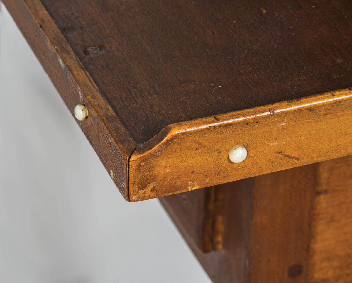 Butternut, poplar and tiger maple, original red stained finish, tiger maple cased six-drawer add-on top with white porcelain pulls, over a raised gallery top with tiny white porcelain hangers around the edge, single dovetailed drawer with finely turned cherry pull, on tapered square legs, two splits on top of table, small missing piece of veneer on left bottom drawer front, New Lebanon, NY, c. 1840, (add-on top c. 1870-1880), 37 1/2″ h, 27″ w, 17 1/2″ d, (ex. James Brown collection, Lee, MA).
