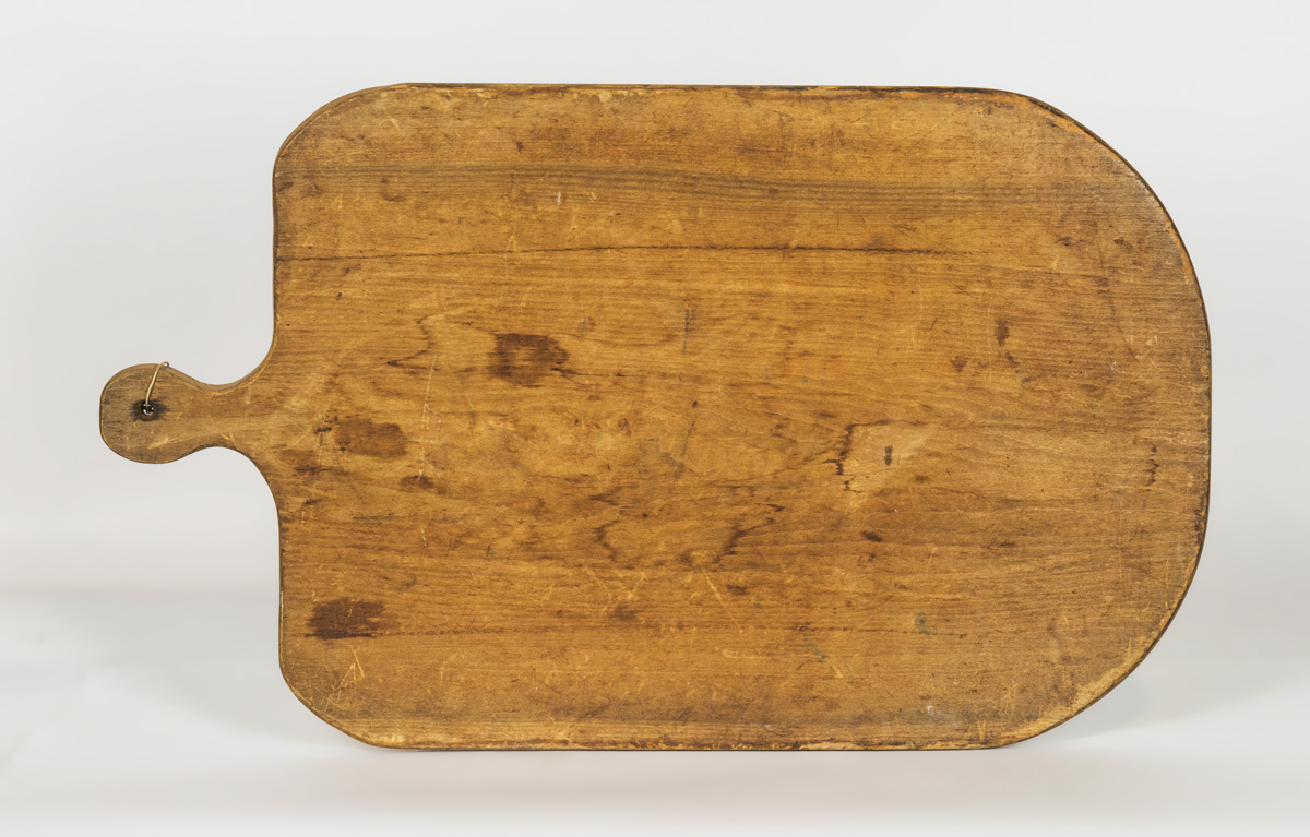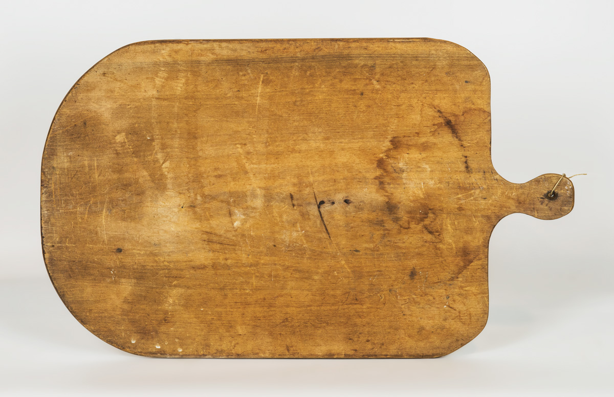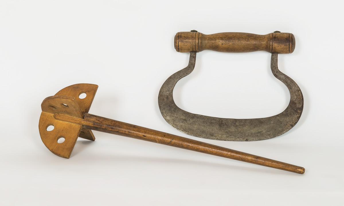 Poplar, single board with extended handle, rounded corners, 16″ h, 27″ l; Vegetable chopper, with turned handle and curved steel blade, 8 3/4″ l; Maple spinning mixer, tapered handle with end terminating in two half-round disks, with drilled holes inset into handle, good patina, Enfield, CT, 16″ l; (ex. estate of Robert R. Sokol Sr. collection).