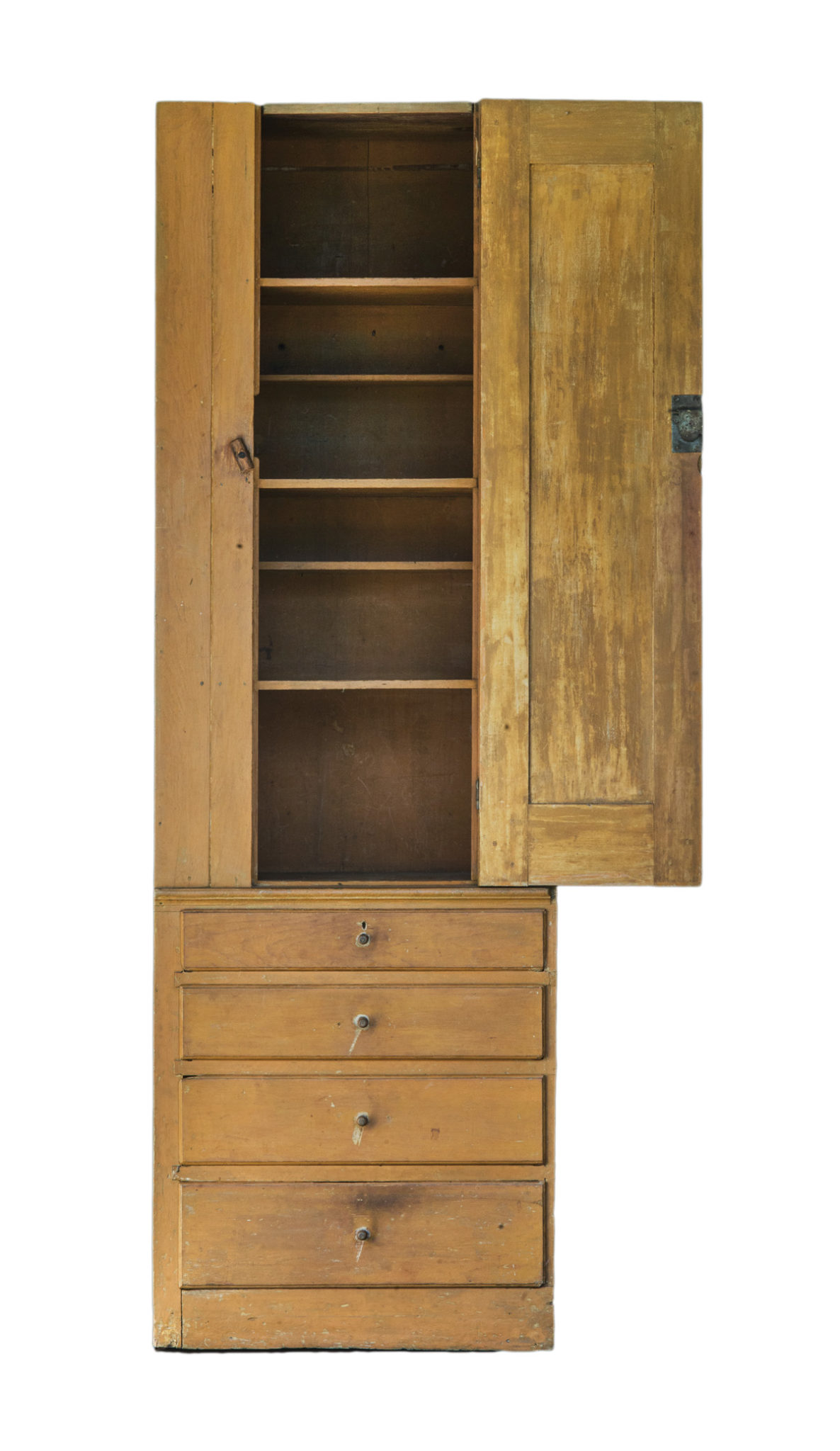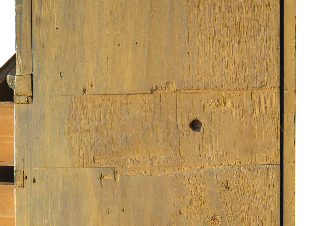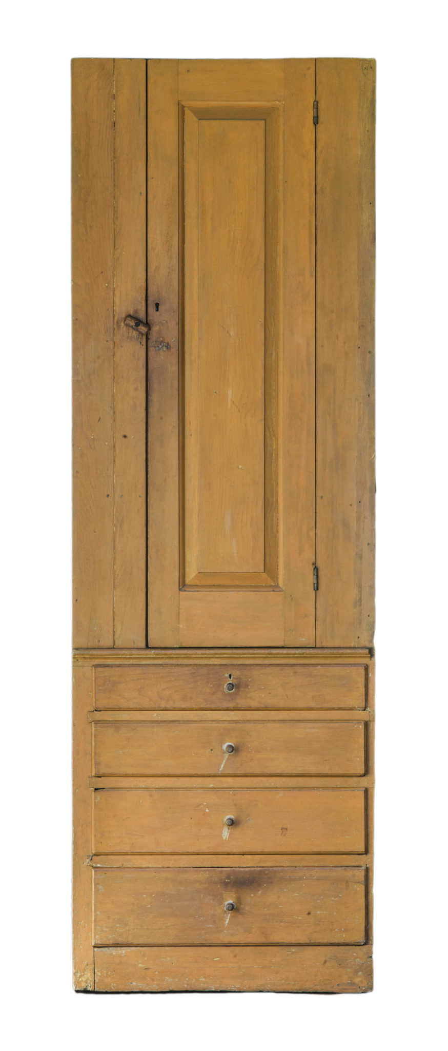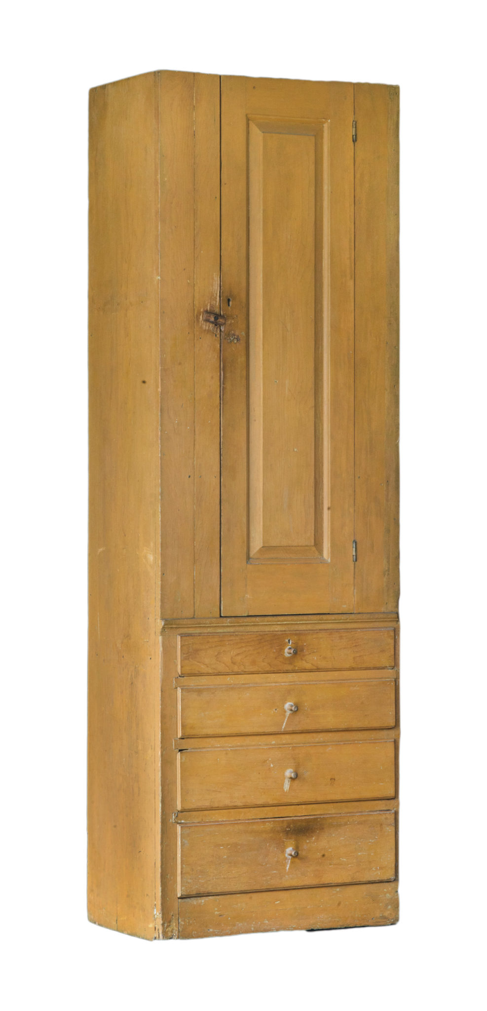 Pine, traces of original yellow painted finish, with additional yellow, long vertical raised panel door, opening to three full shelves and two half shelves, over four graduated, lipped and dovetailed drawers, with original long turned hardwood peg pulls, (note: a small early Shaker cupboard with sectioned drawers and originally built-in), Harvard, MA, c. 1800-1830, 6′ 3″ h, 24″ w, 14″ d, (ex. Pat Hatch collection).