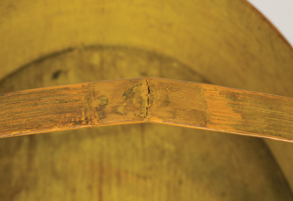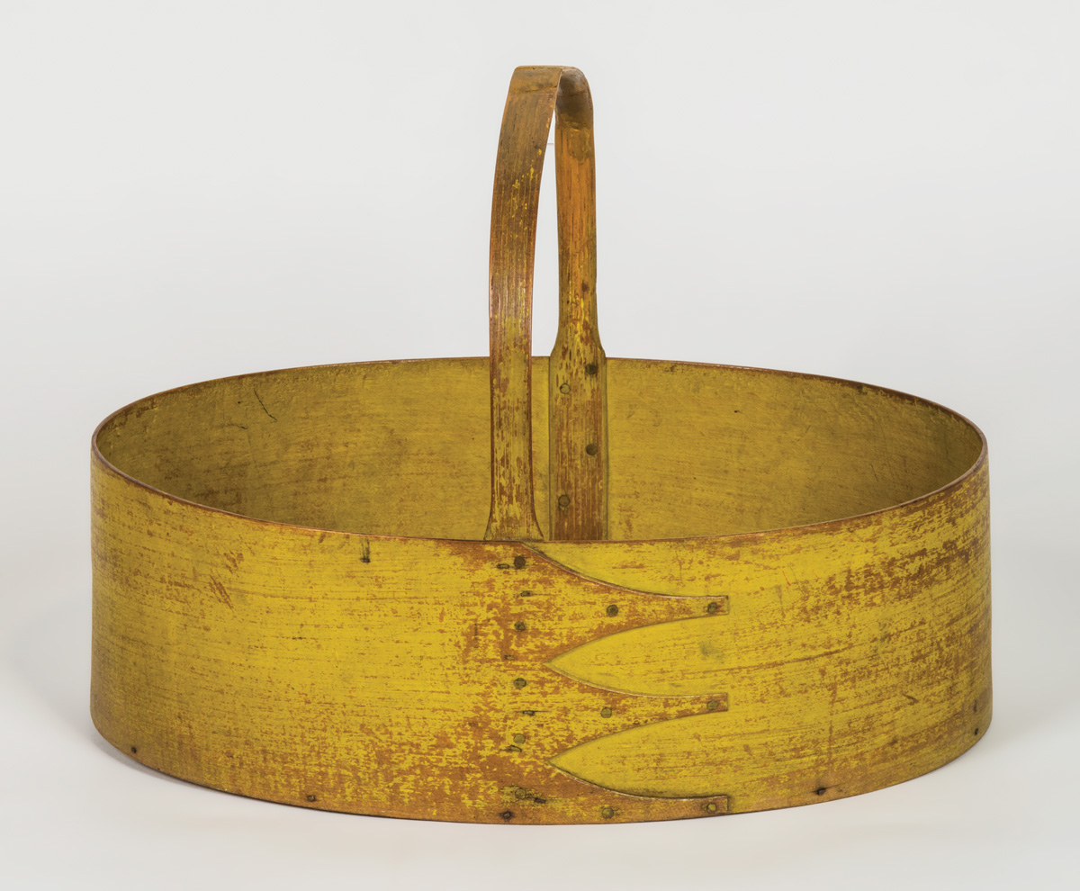 Pine and maple, original chrome yellow painted finish, three fingers, handle shows a fixed break at the top, Canterbury, NH, c. 1820, tagged “Purchased from the Cassavant estate, New Lebanon, N.Y.”, 4″ h, 9 1/2″ h (to top of handle), 13 1/4″ l, 9 1/8″ d, (ex. Ed Clerk collection).