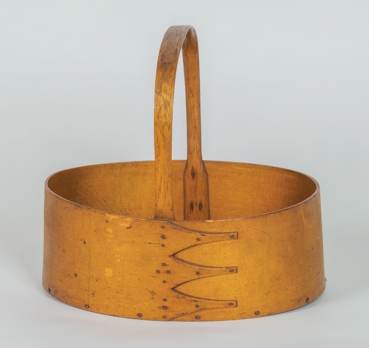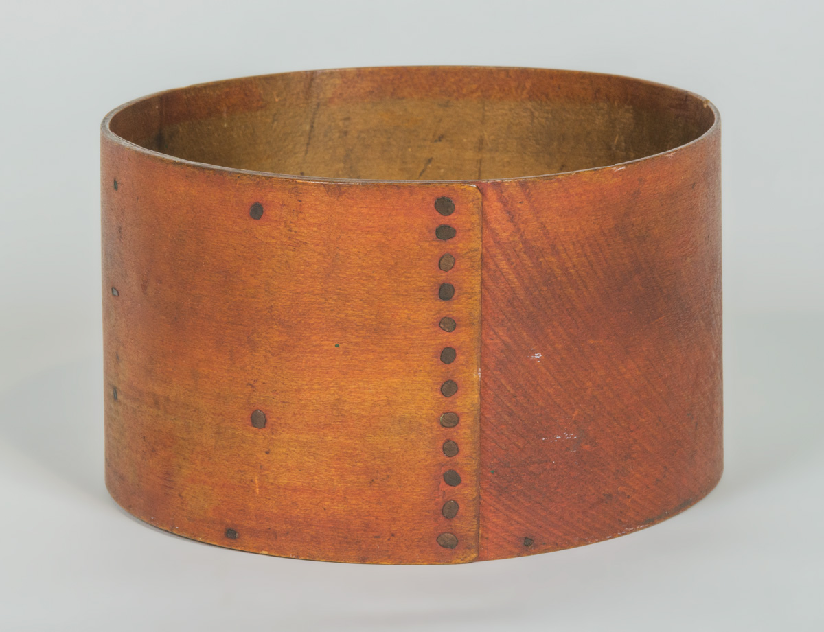 Pine and maple, original stained varnish finish, light reddish color, tall fixed handle, three fingers, small round head brass tacks, originally from the McCue collection, 3 3/4″ h (to rim), 9 1/2″ h (to top of handle), 9 7/8″ l; Measure, pine and maple, original red stained finish, copper tacked seam, originally from the Bissland collection, 3 1/2″ h, 5 3/4″ dia.